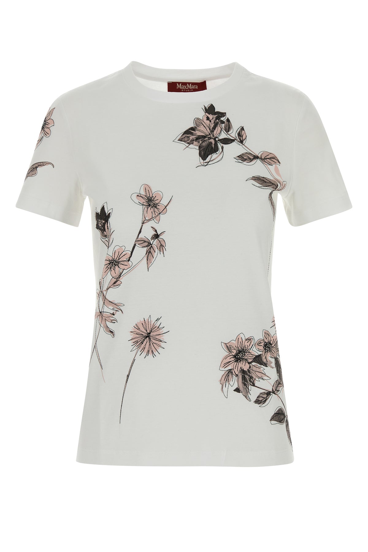 T-shirt realized in pure cotton characterized by floral print and embroidery at the front.