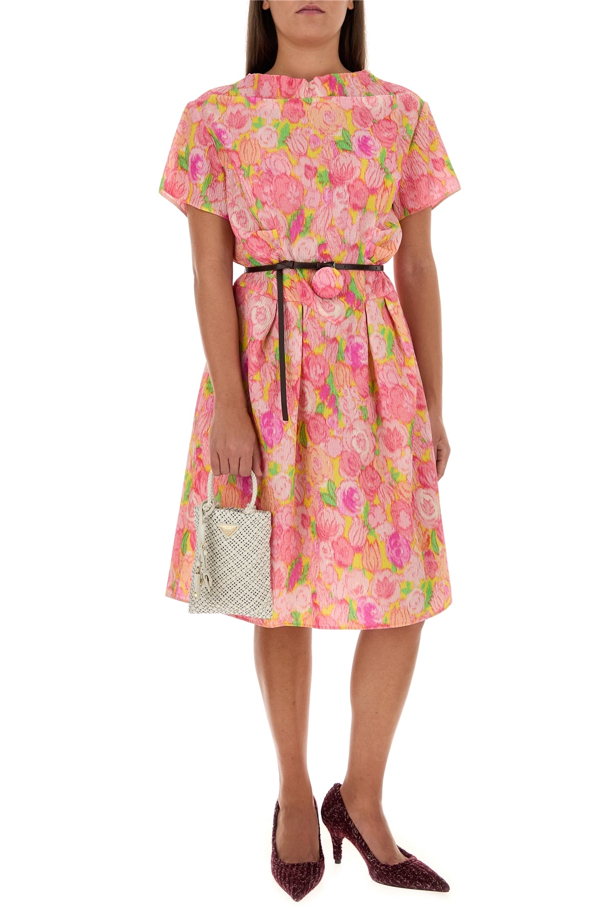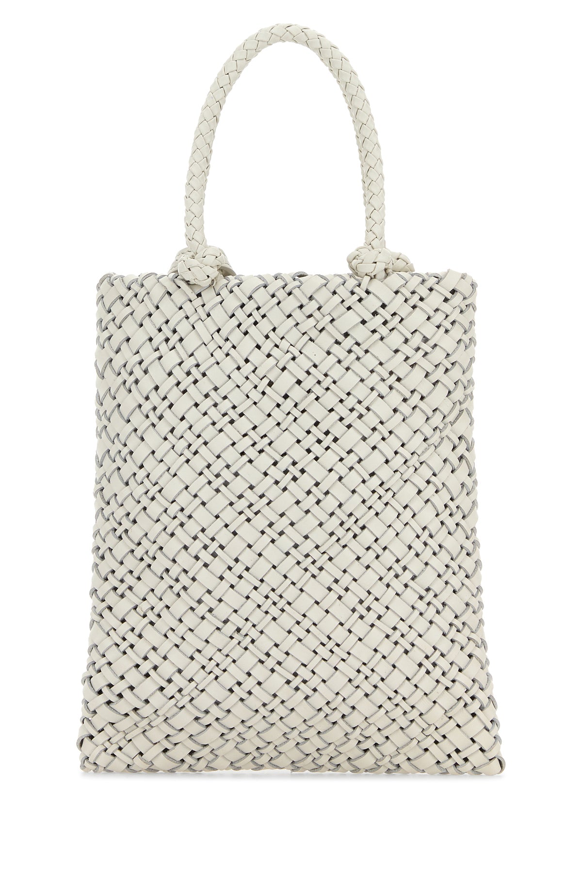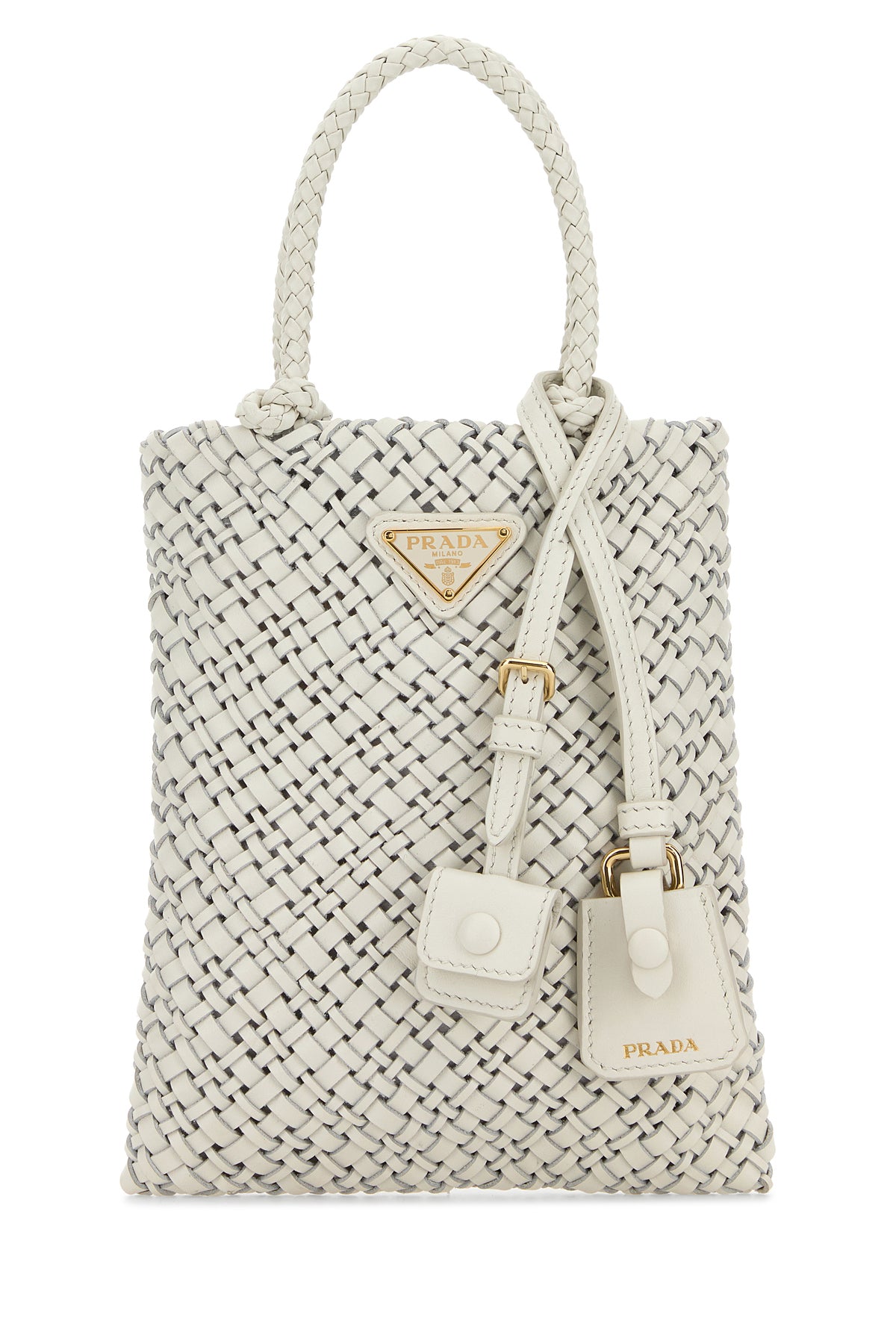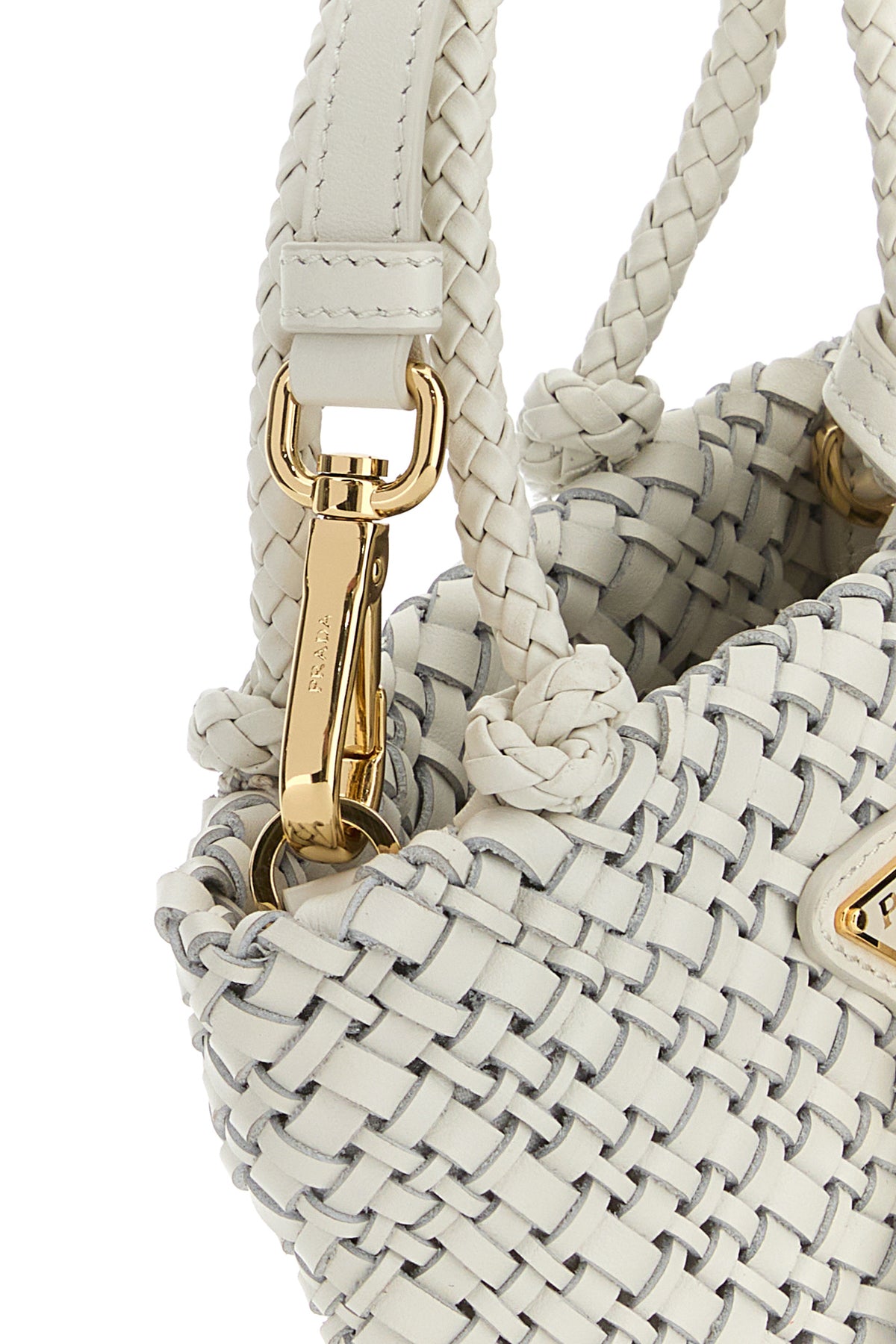 Handbag realized in woven leather enriched by iconic logoed metal detail at the front.