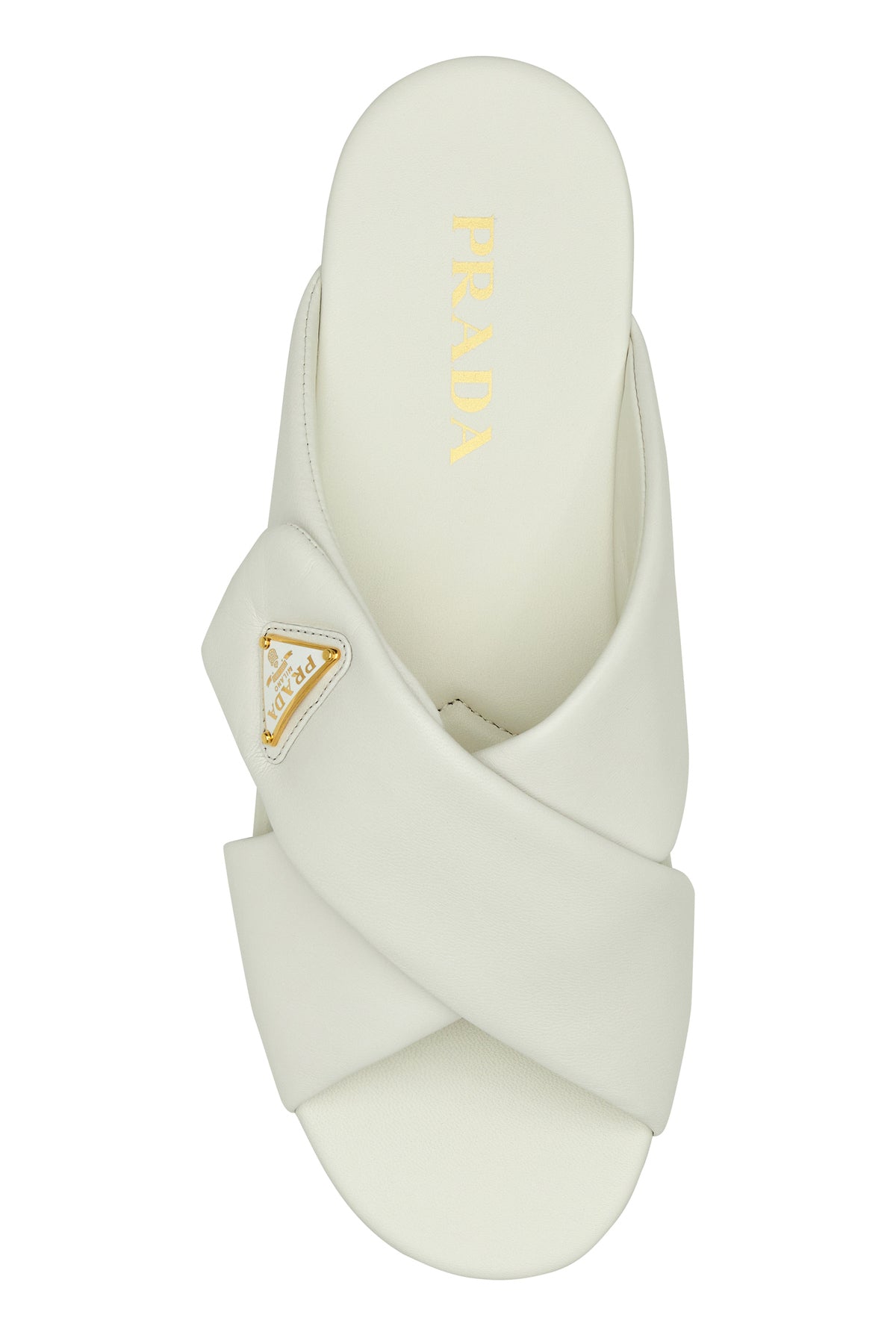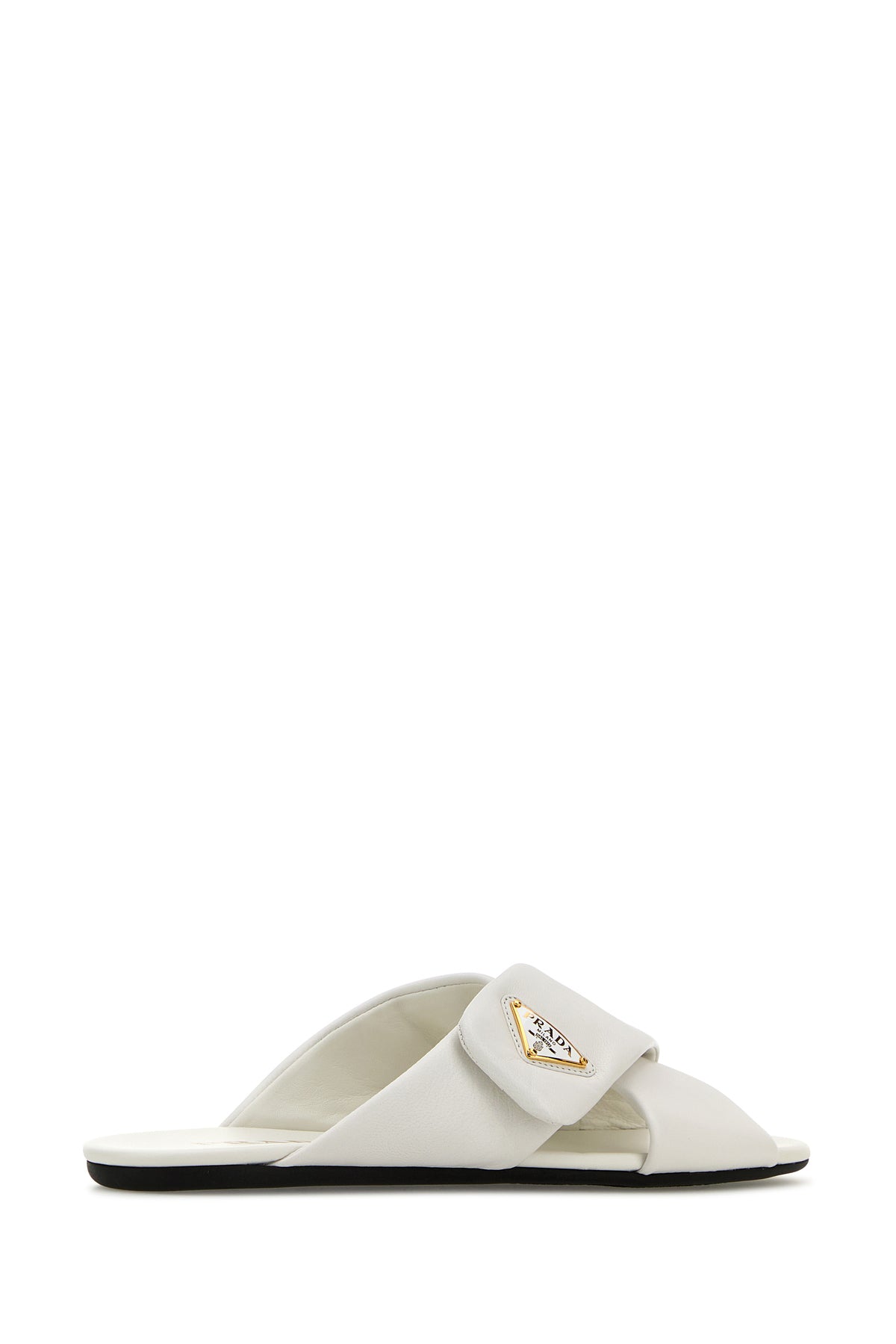 Slippers realized in smooth nappa leather enriched by iconic metal logoed triangle on the band.