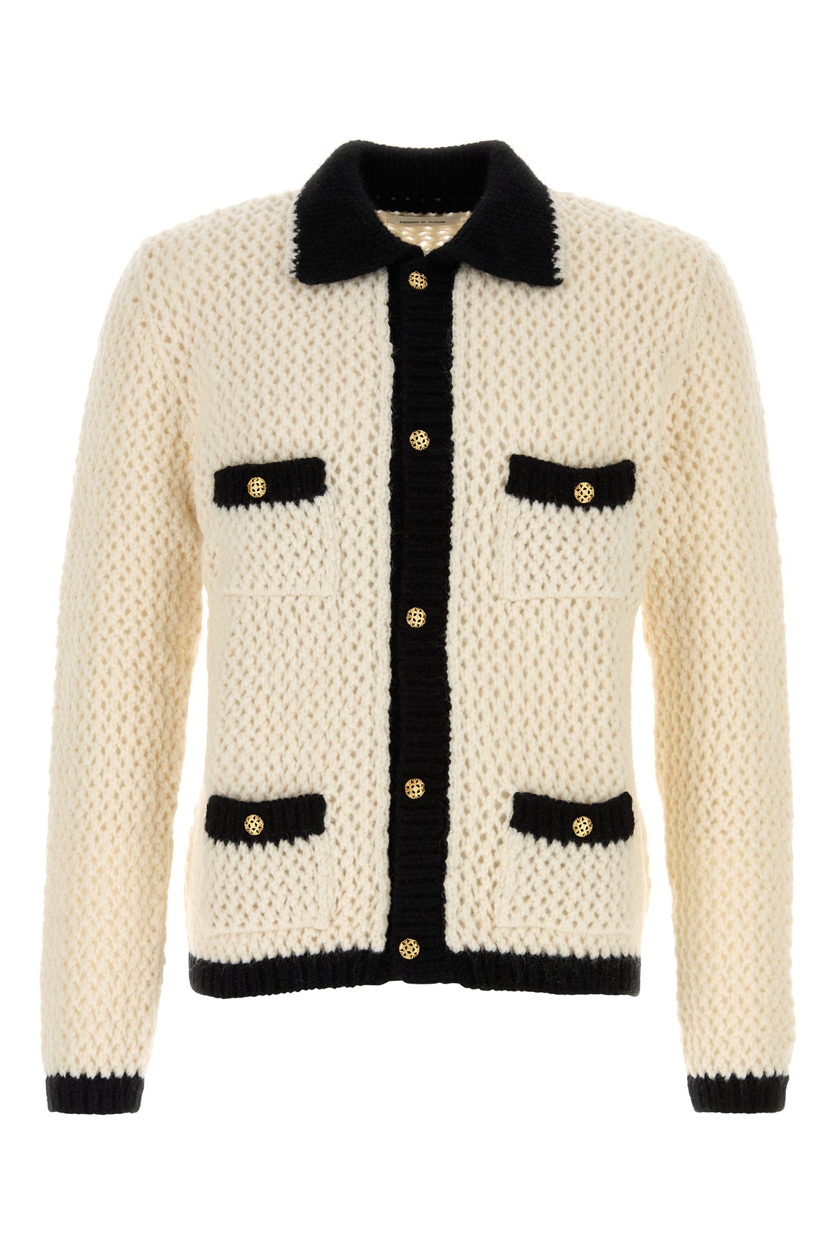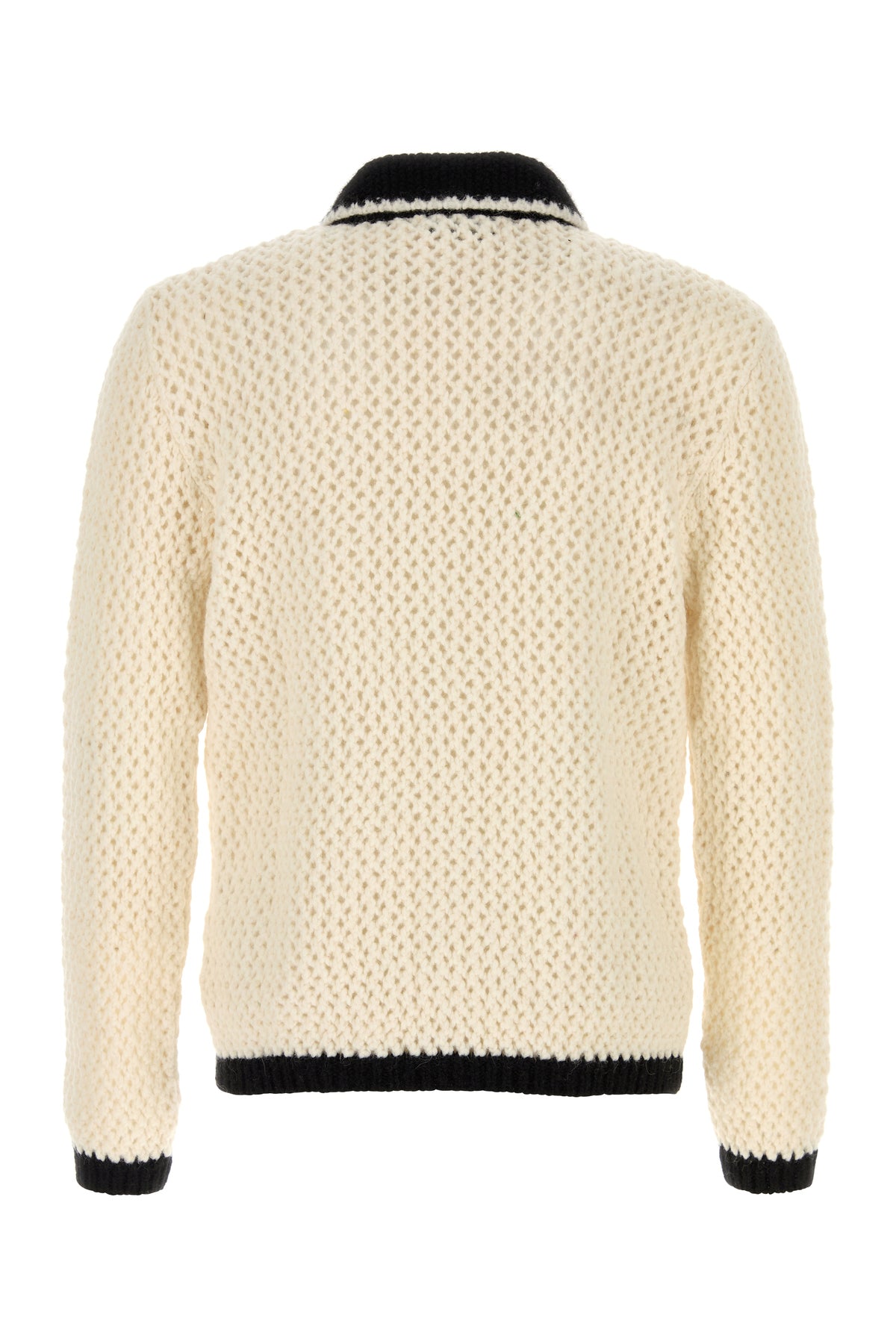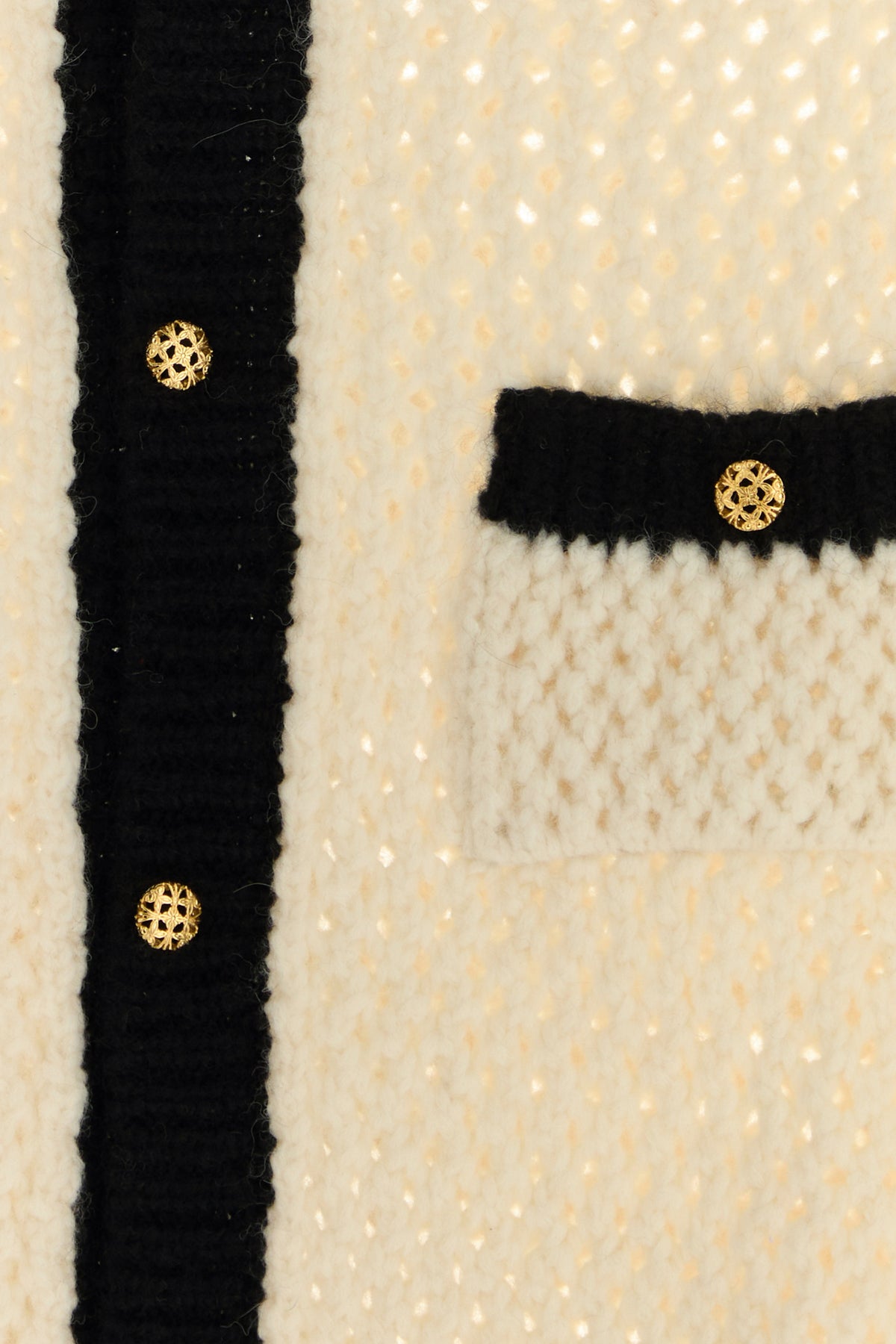 Cardigan realized in stretch crochet characterized by contrasting trimmings.