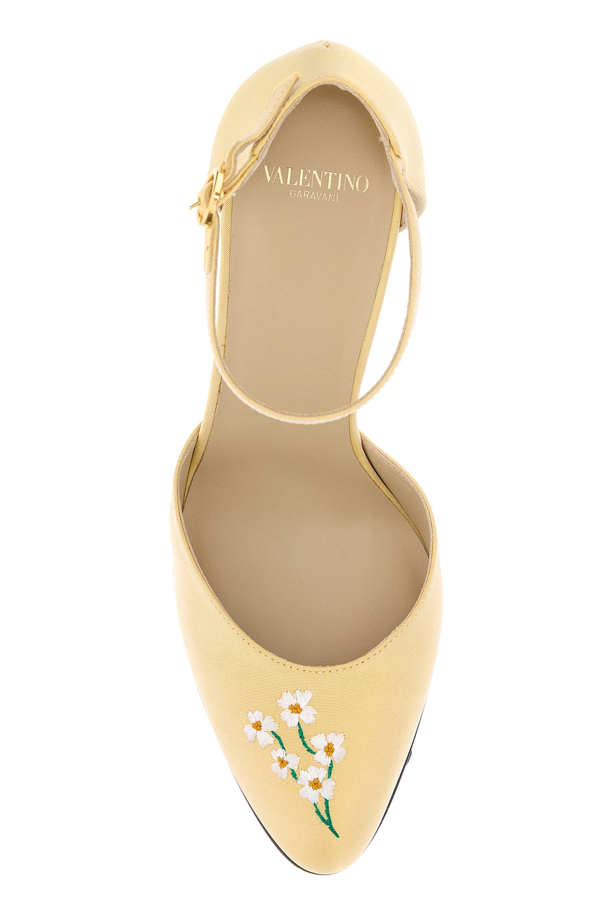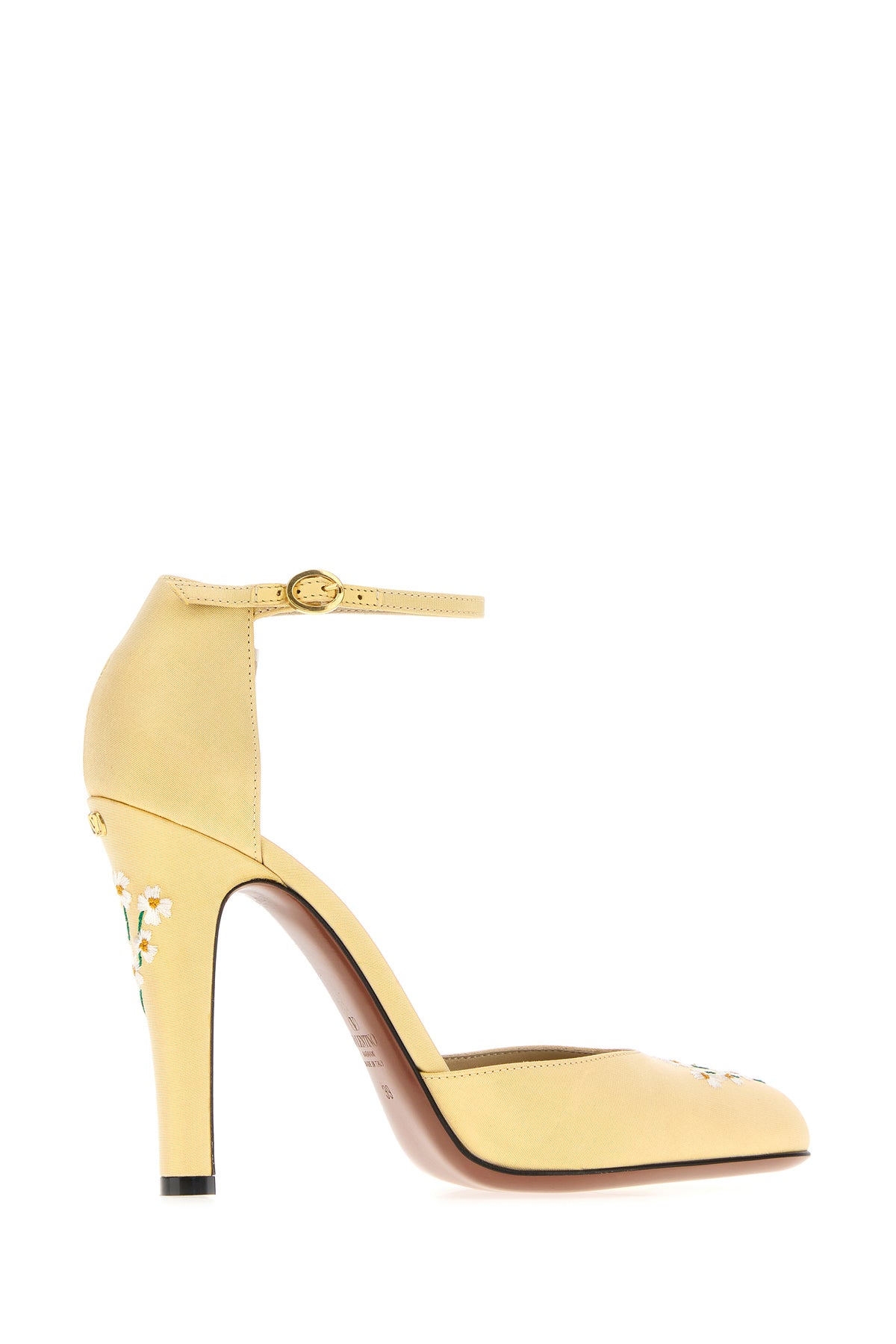 Pumps realized in fabric characterized by floral embroidery on the tapered toe and on the heel.