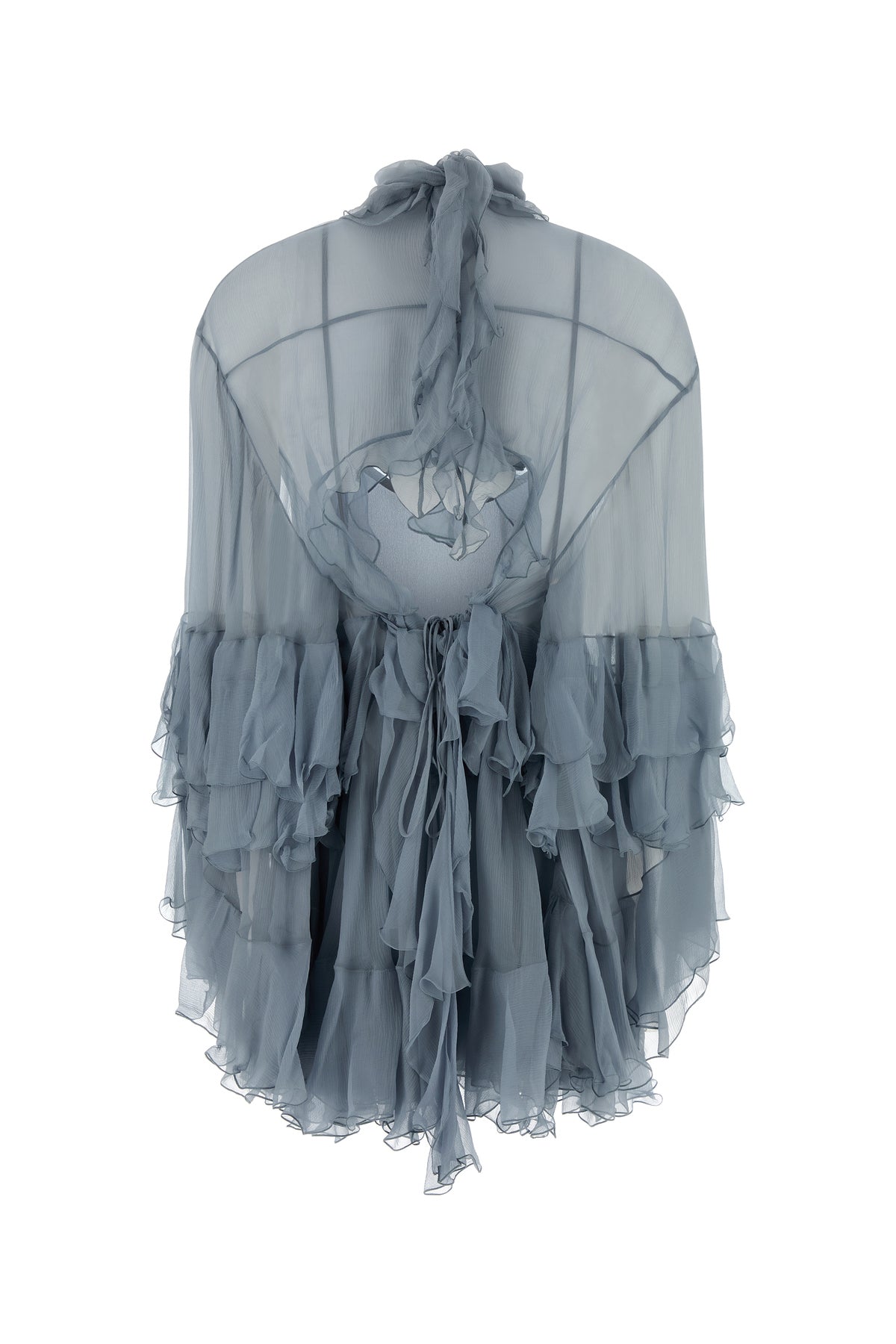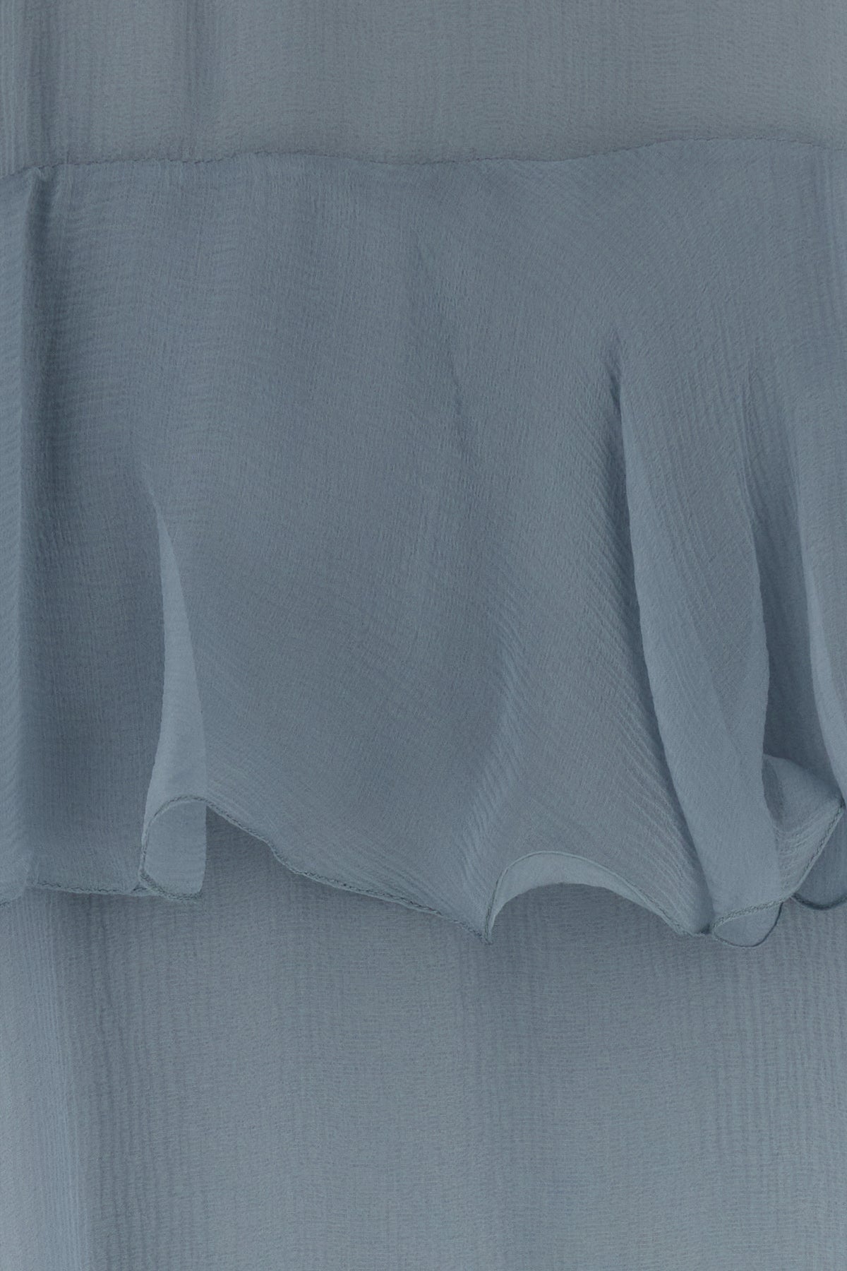 Abito realizzato in crepe di pura seta arricchito da ruffles sul girocollo e sulle maniche e da volant sul fondo.