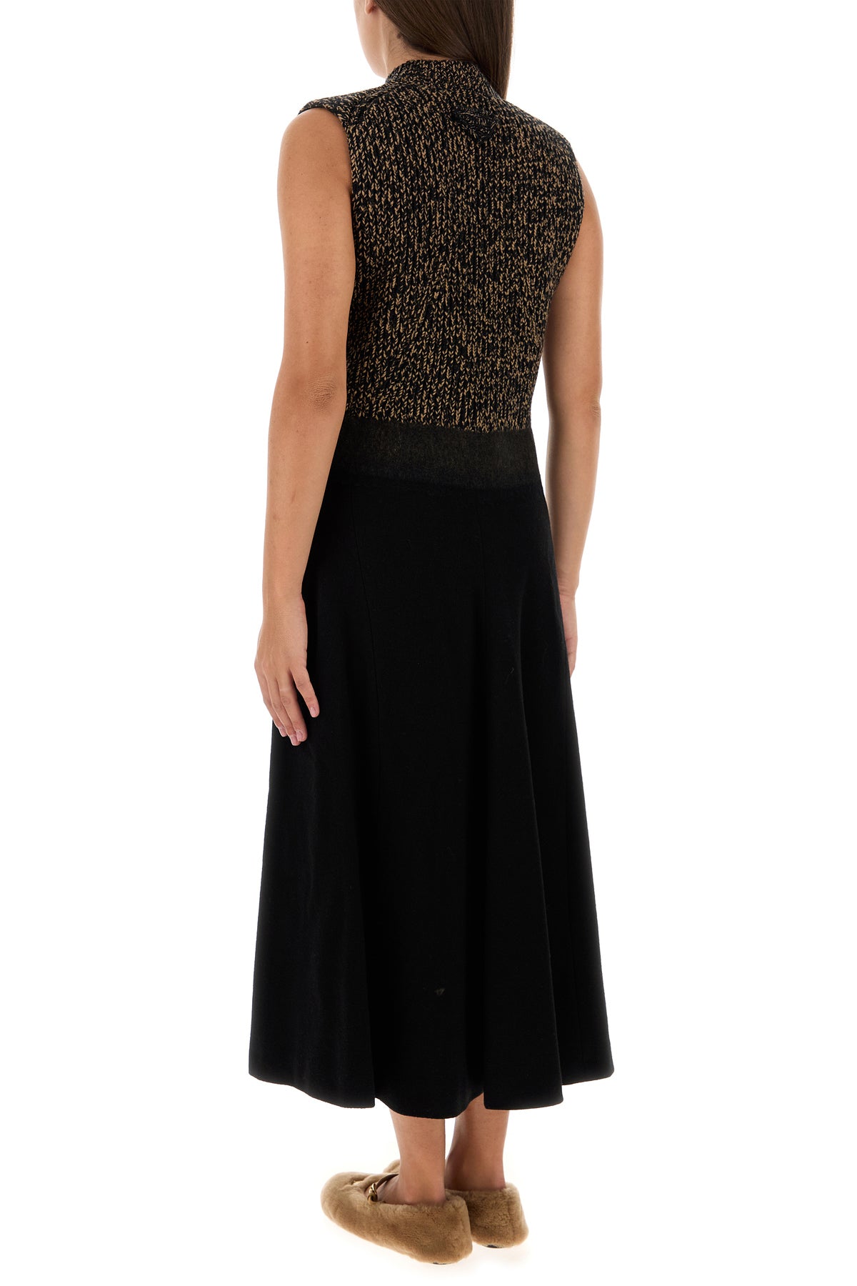 Abito realizzato in lana vergine e cashmere caratterizzato da gonna svasata in lana stretch.