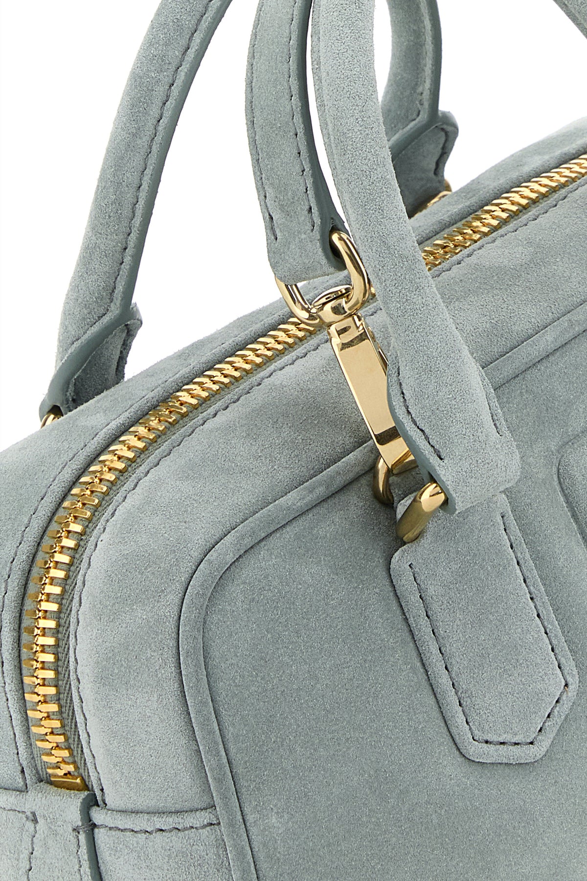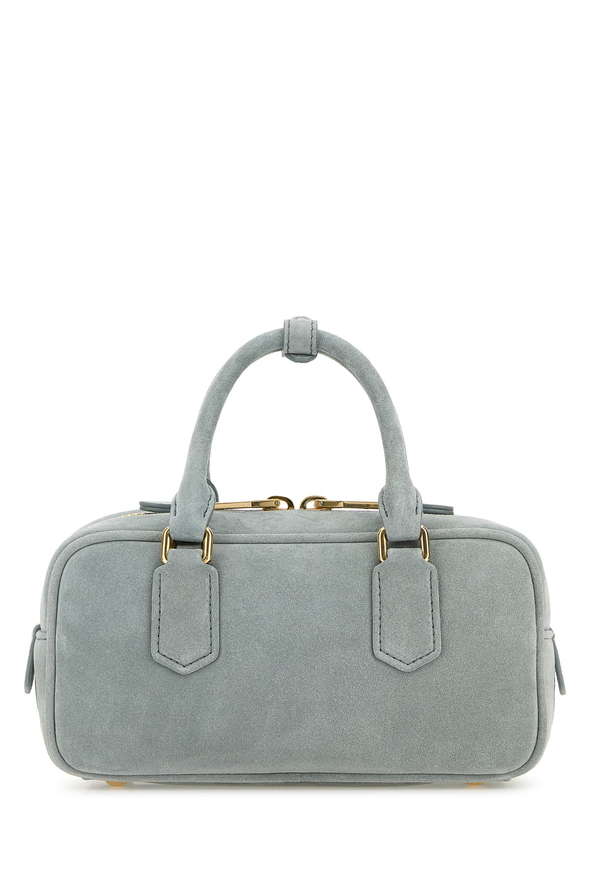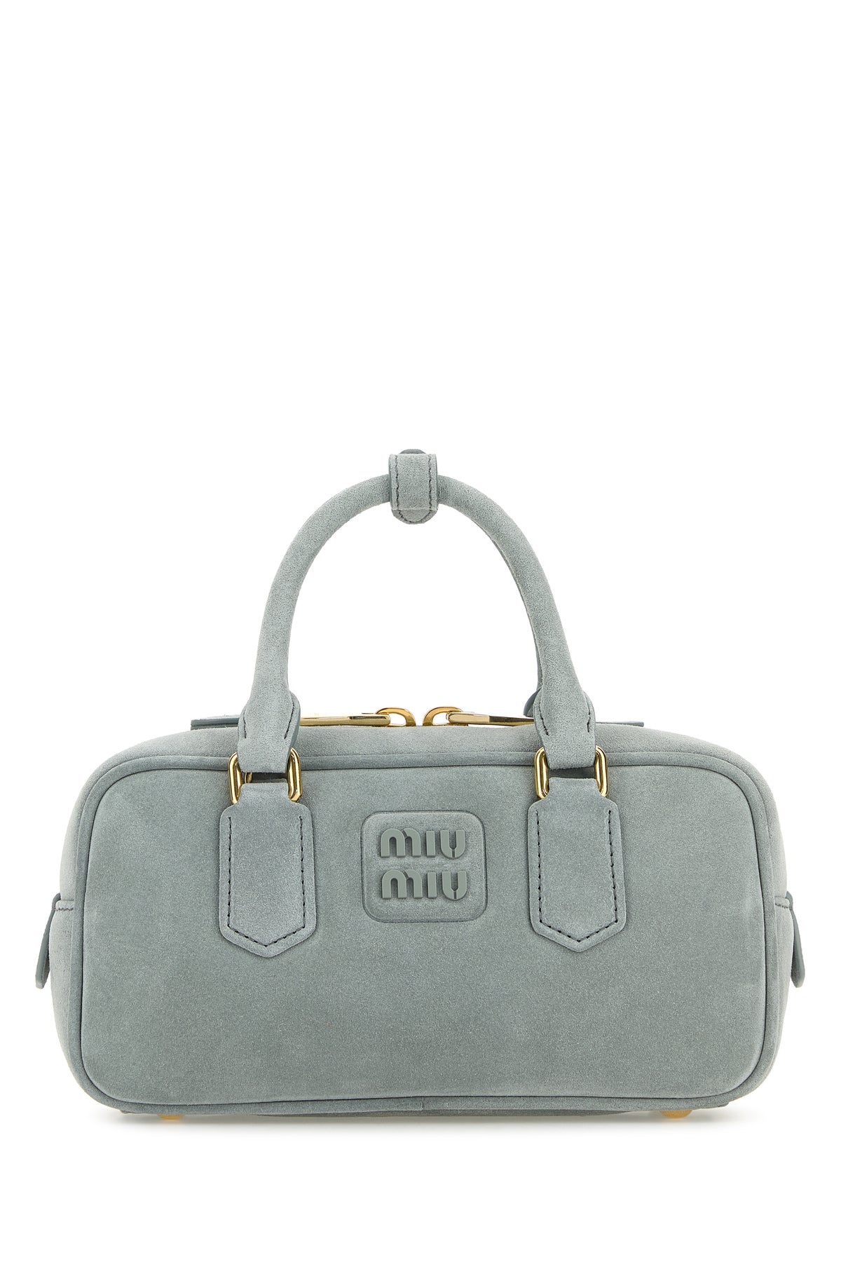 Borsa a mano realizzata in pelle scamosciata arricchita da logo in lettere metalliche tonali sulla parte frontale.
