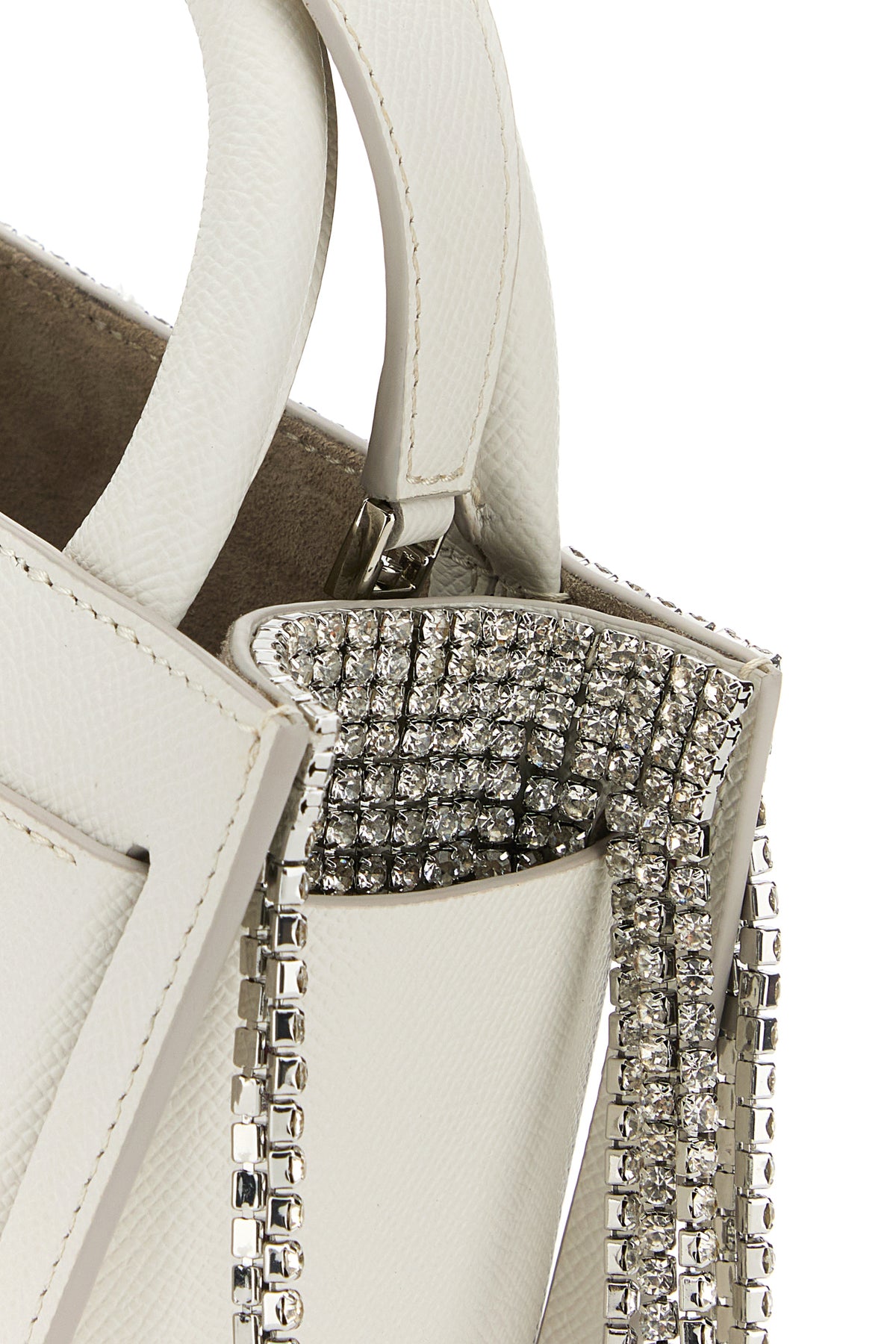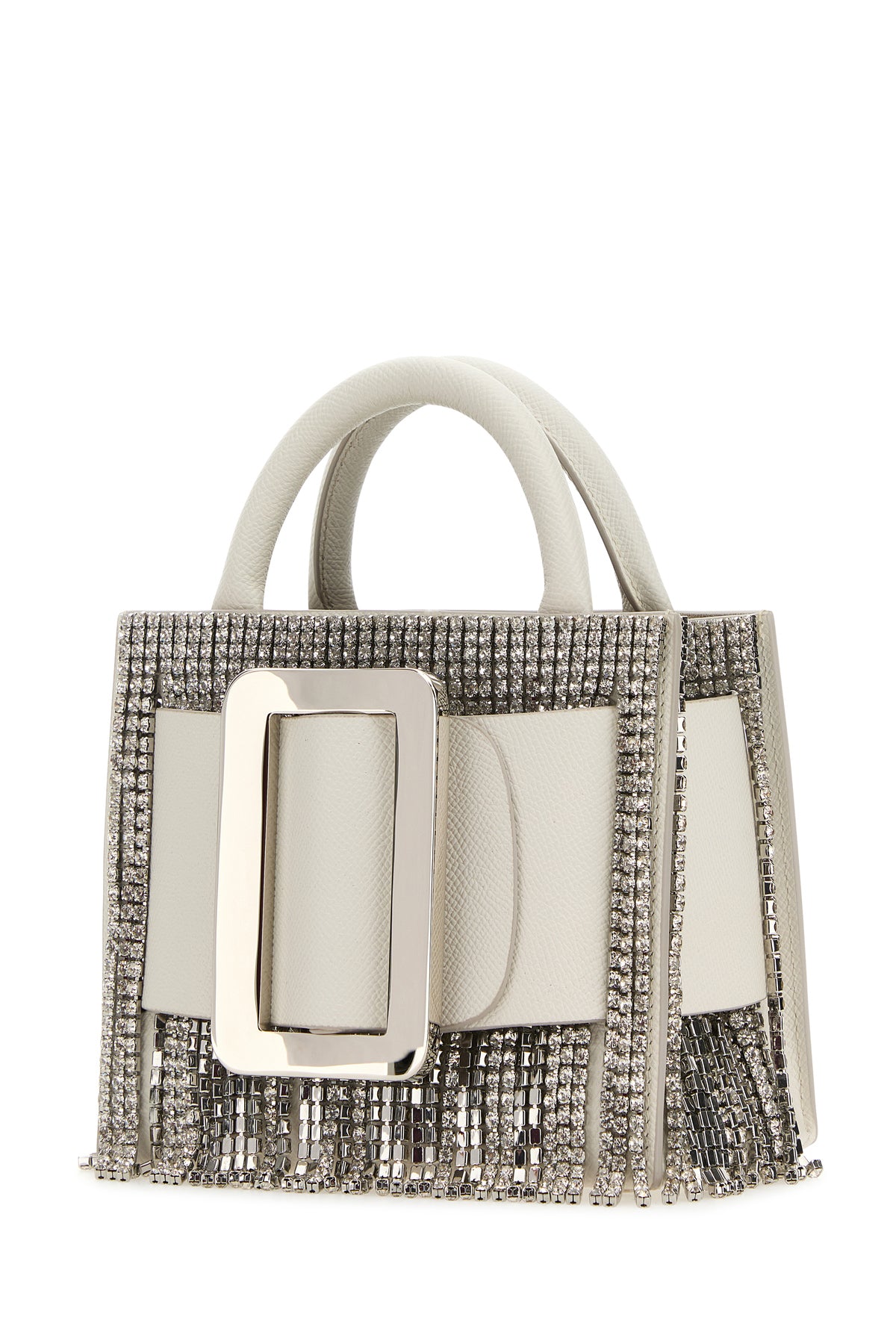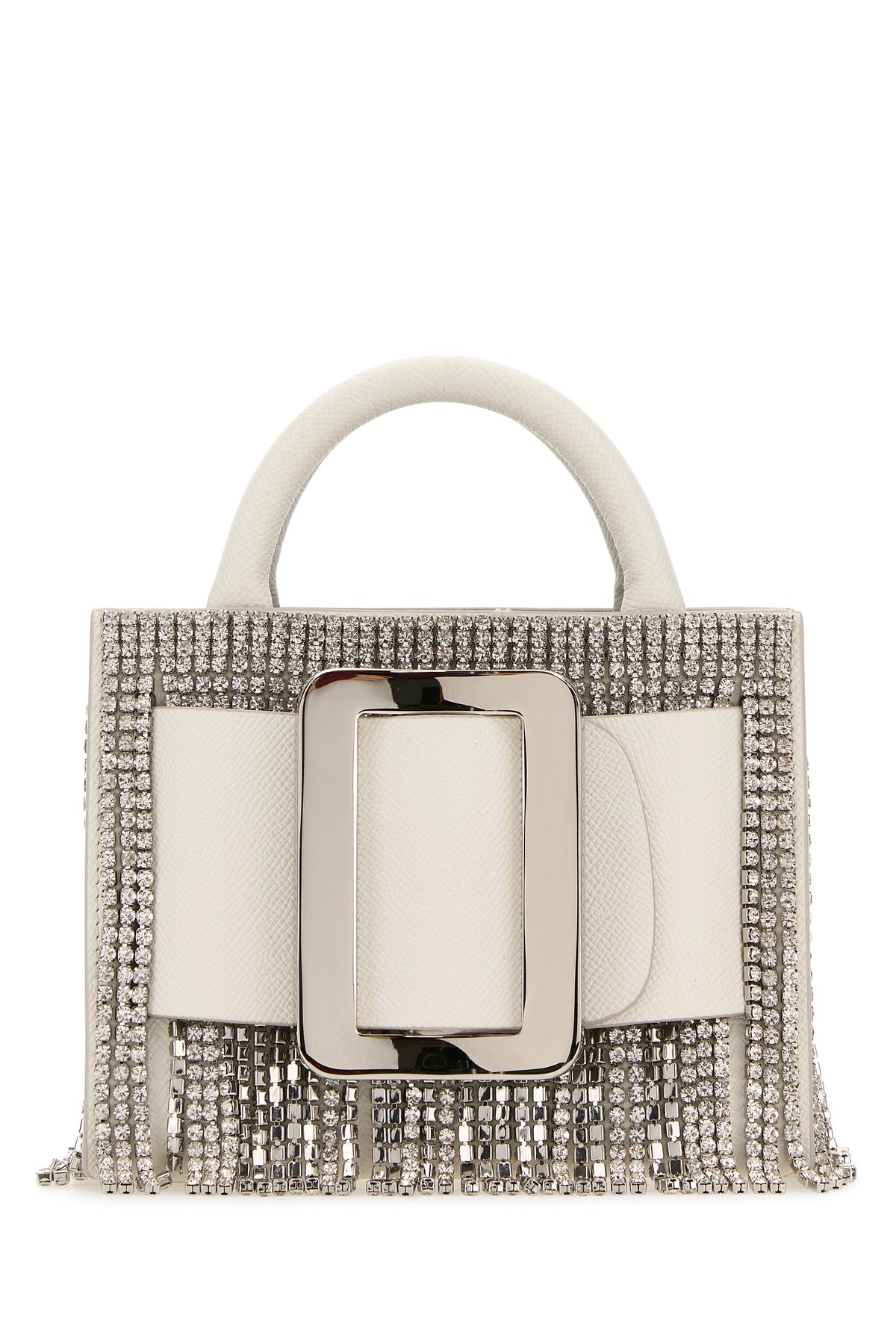 Borsa a mano realizzata in pelle di vitello zigrinata arricchita da cinturino decorativo con fibbia e frange con cristalli sulla parte frontale e sui lati.