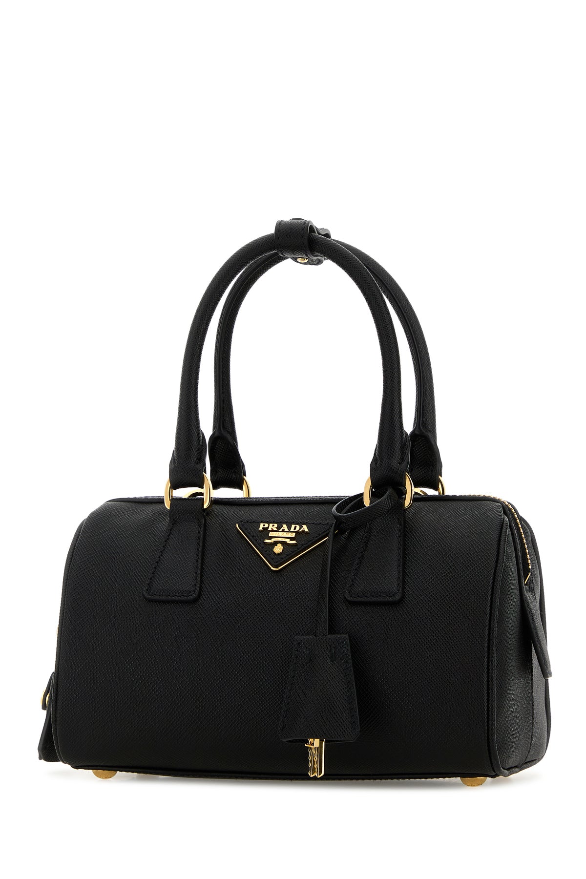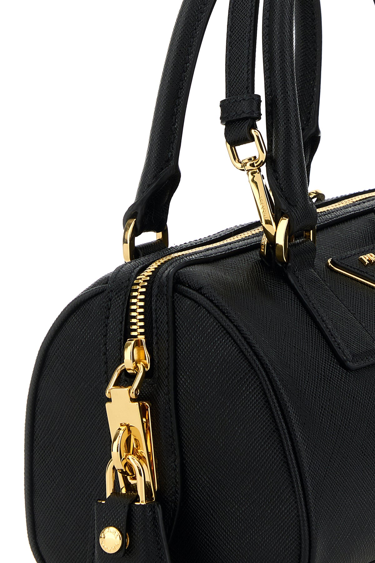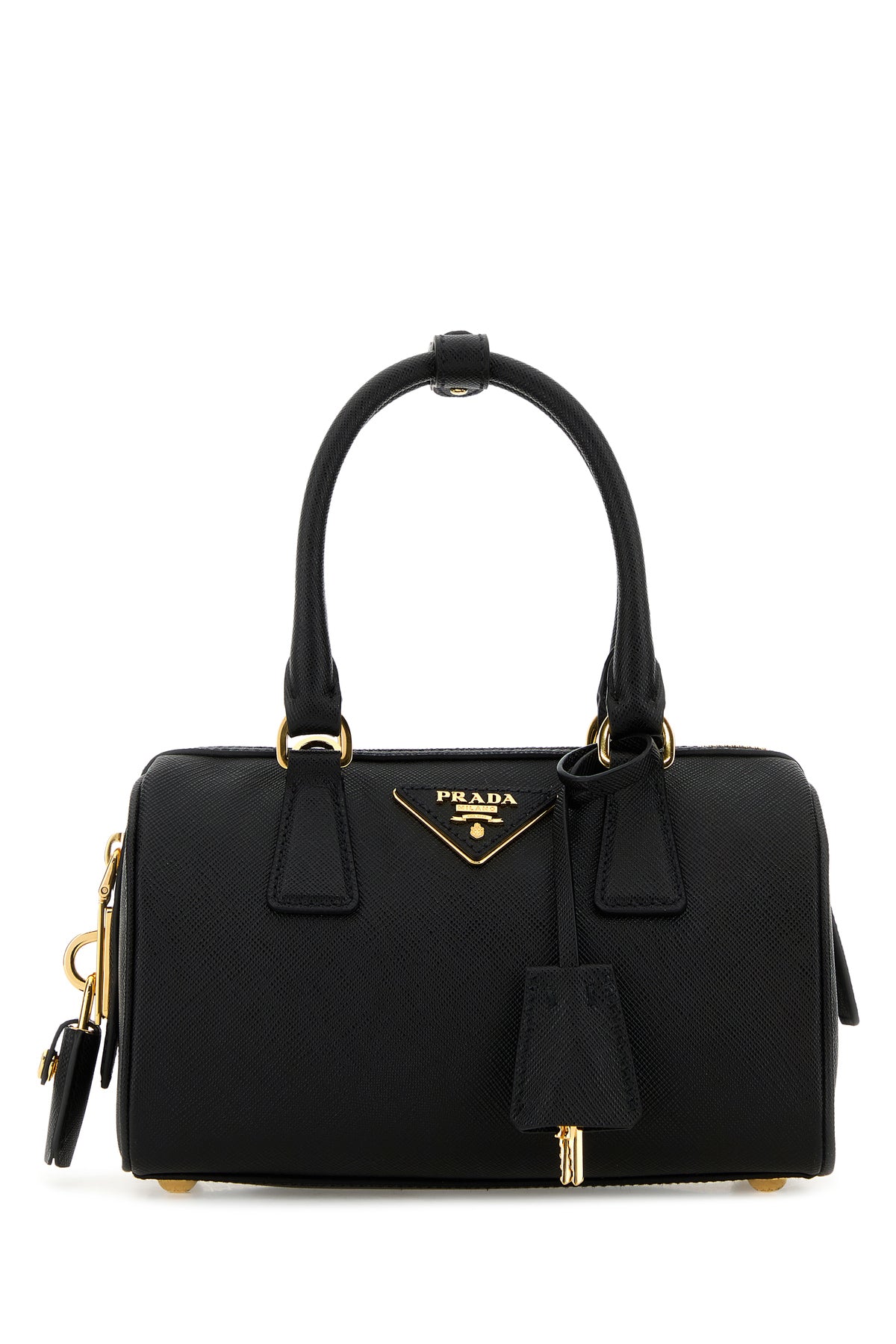 Borsa a mano realizzata in pelle Saffiano arricchita da iconico triangolo metallico logato sulla parte frontale.
