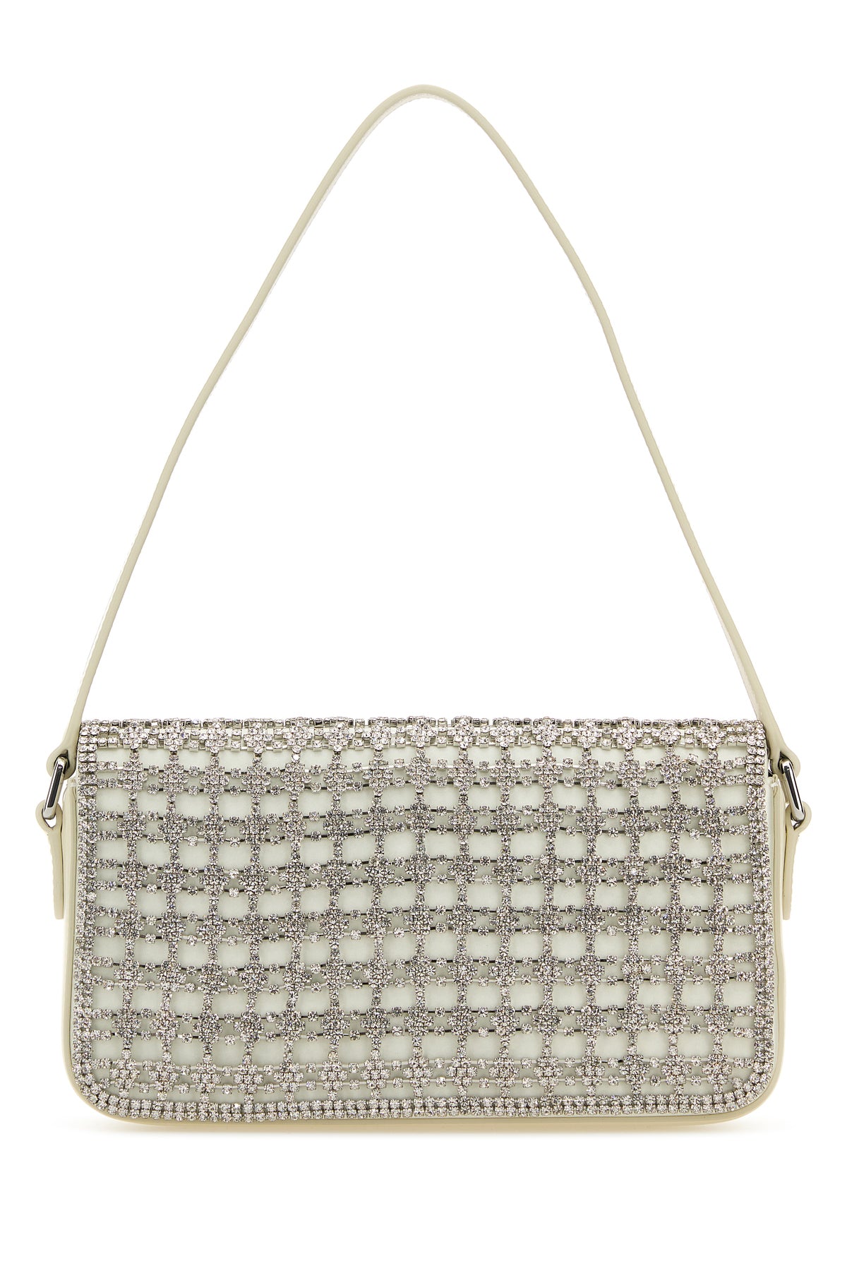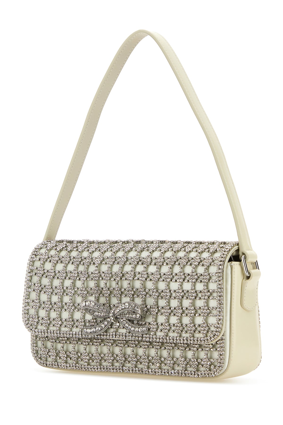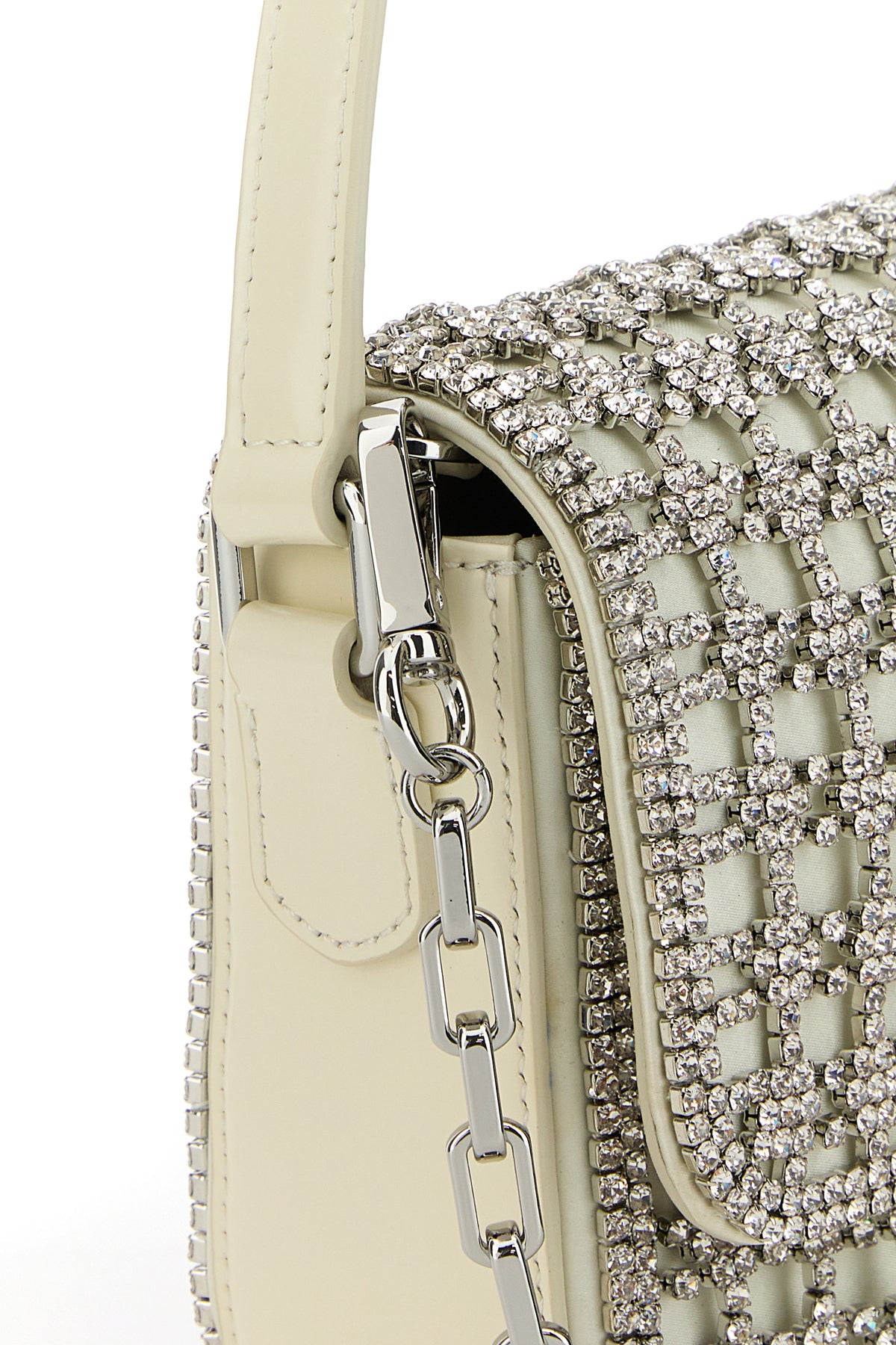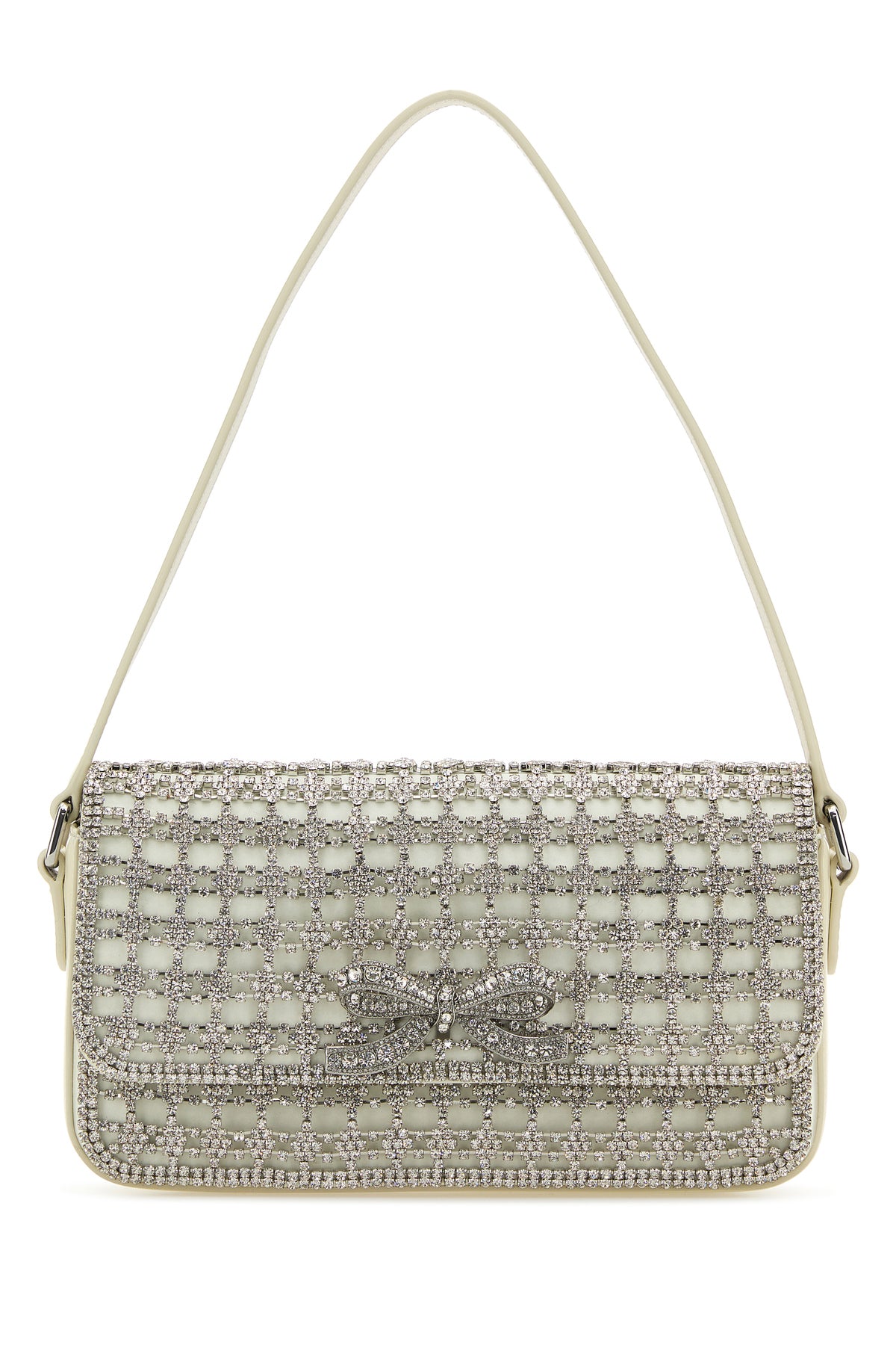 Borsa a mano realizzata in raso interamente ricoperto da cristalli con profilature in pelle liscia arricchita da fiocco decorativo gioiello sulla parte frontale.