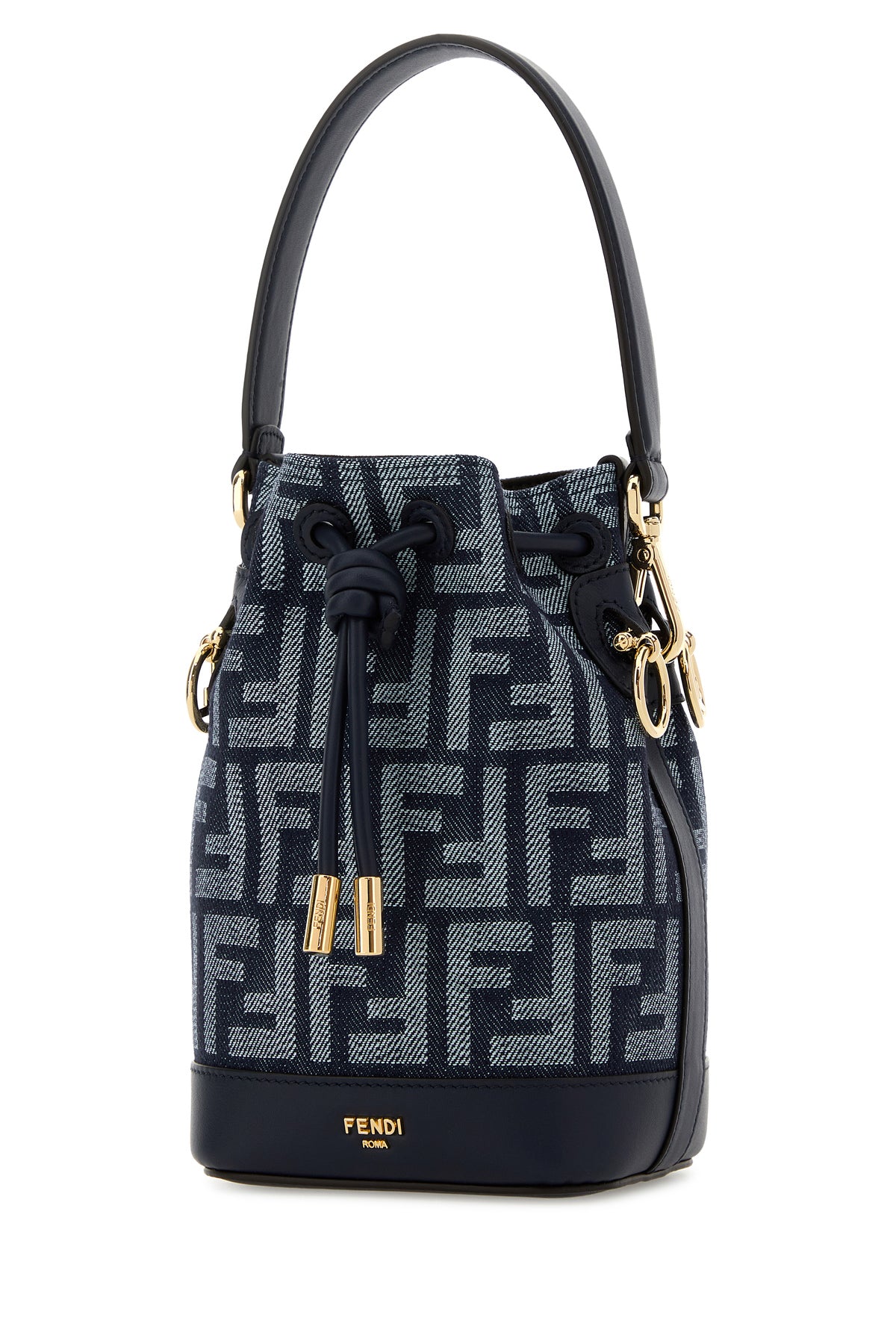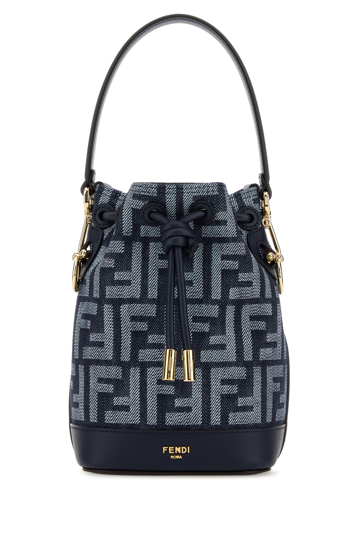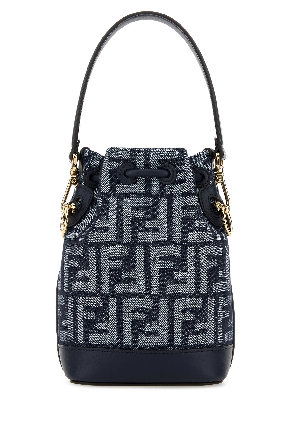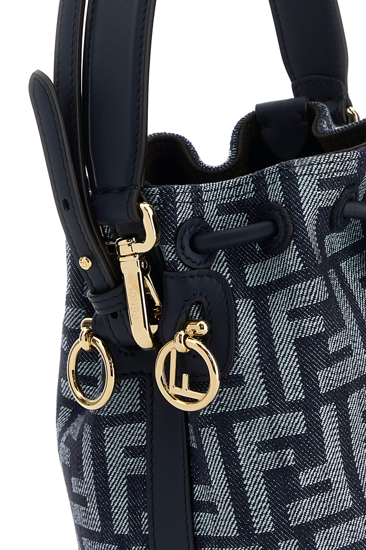 Borsa a secchiello realizzata in denim caratterizzata da ricamo FF su tutta la superficie arricchita da logo in lettere metalliche sulla parte frontale.
