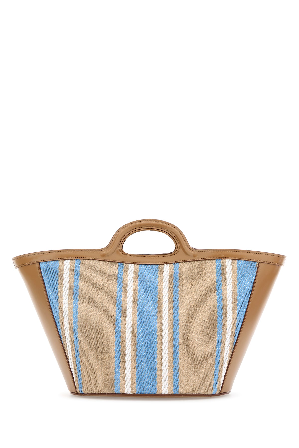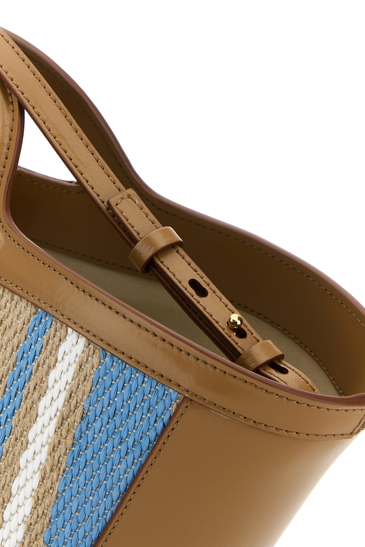Borsa a secchiello realizzata in tela con inserti in pelle sulle profilature caratterizzata da ricamo a righe su tutta la superficie e logo ricamato sulla parte frontale.