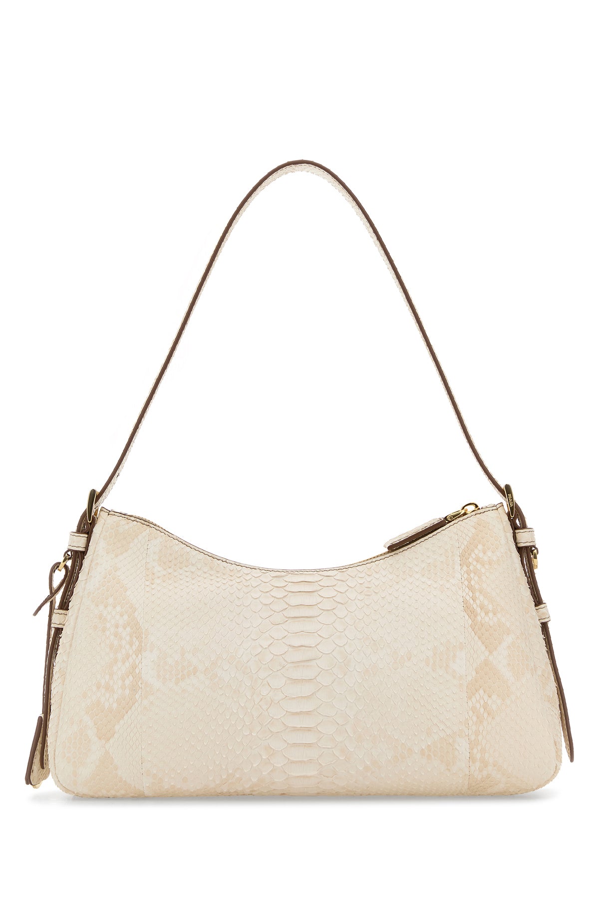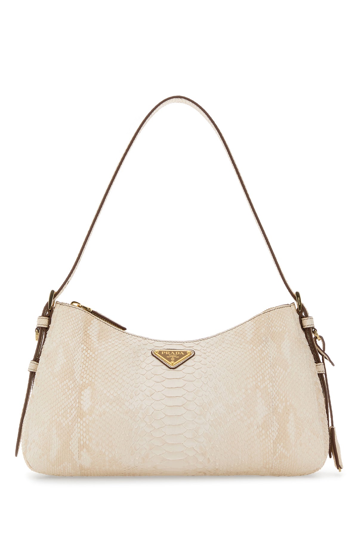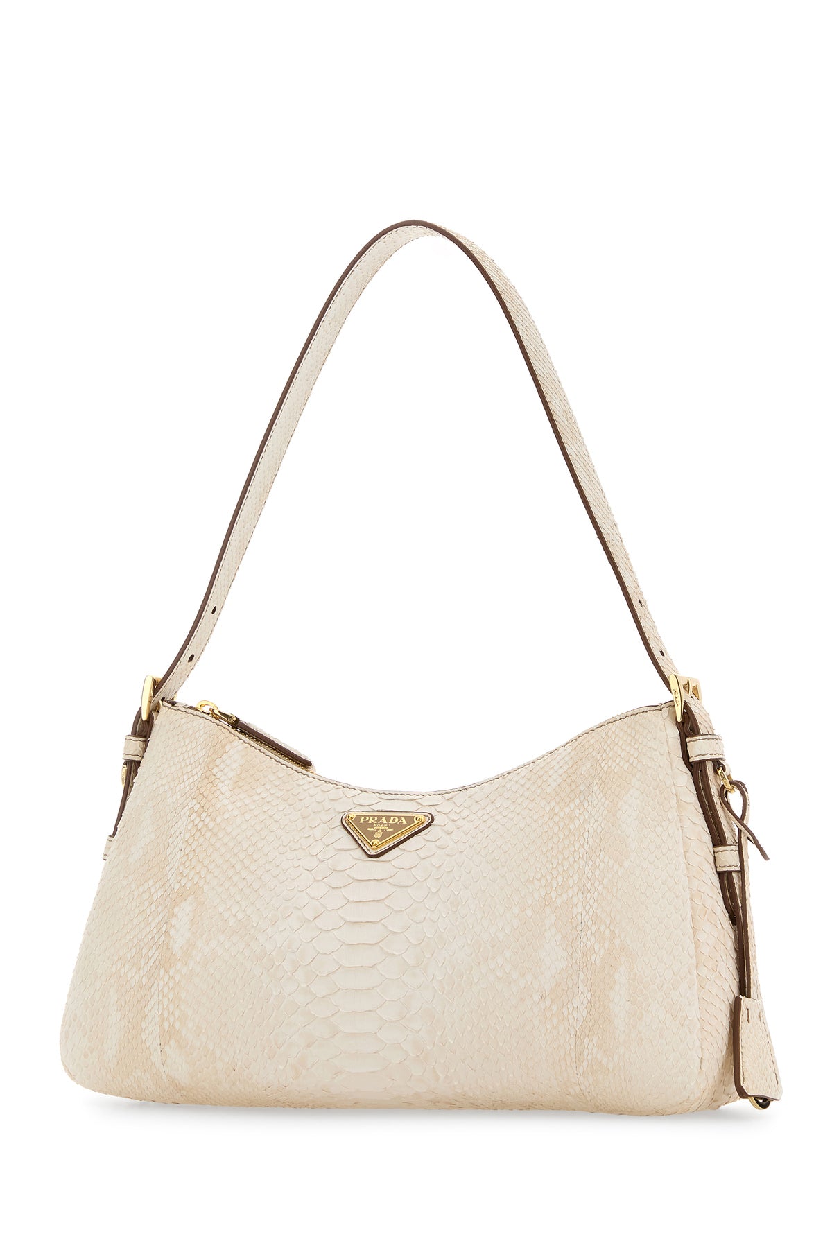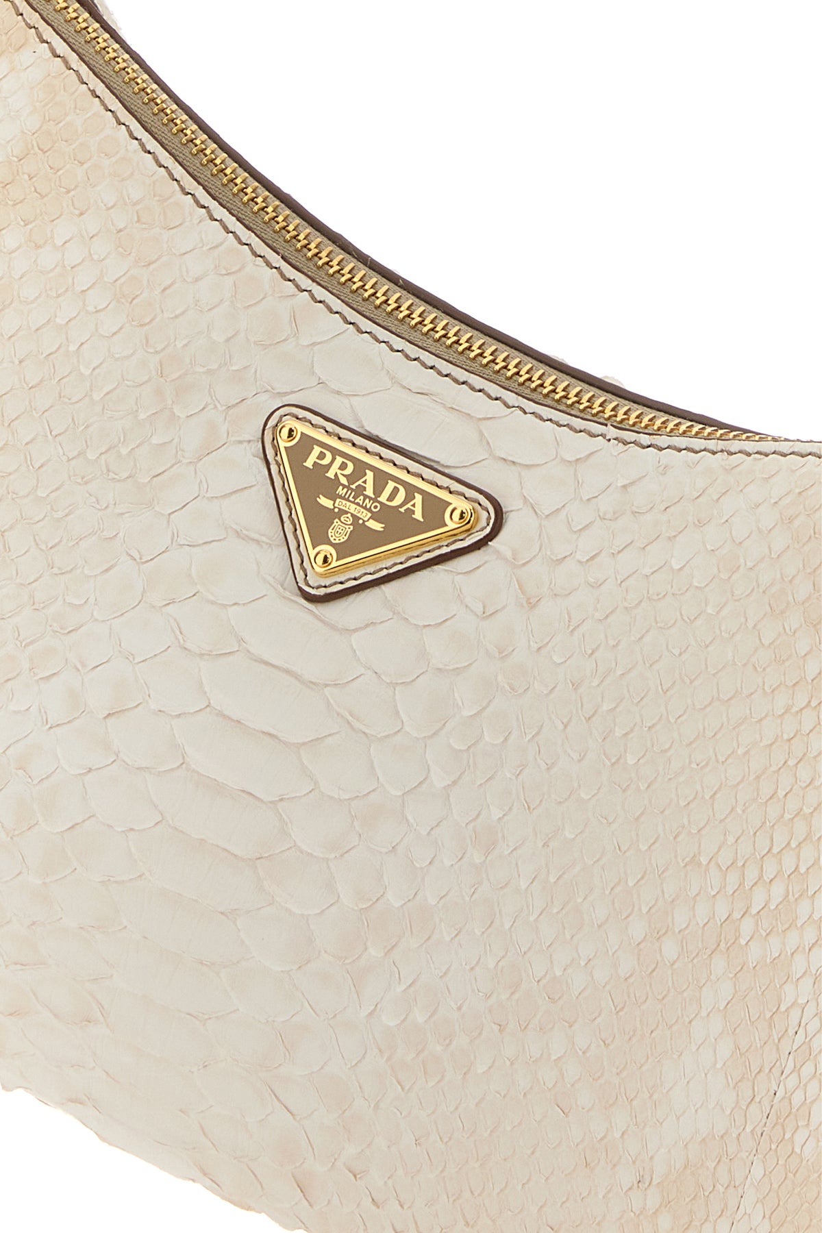Borsa a spalla realizzata in pelle di pitone arricchita da iconico triangolo metallico logato sulla parte frontale.