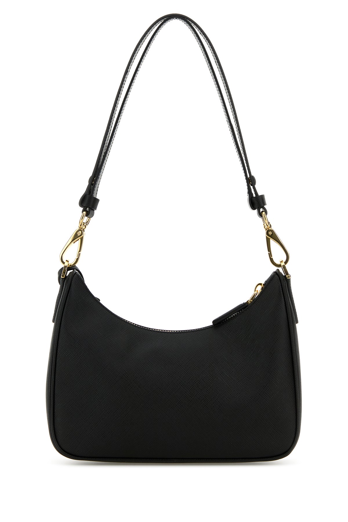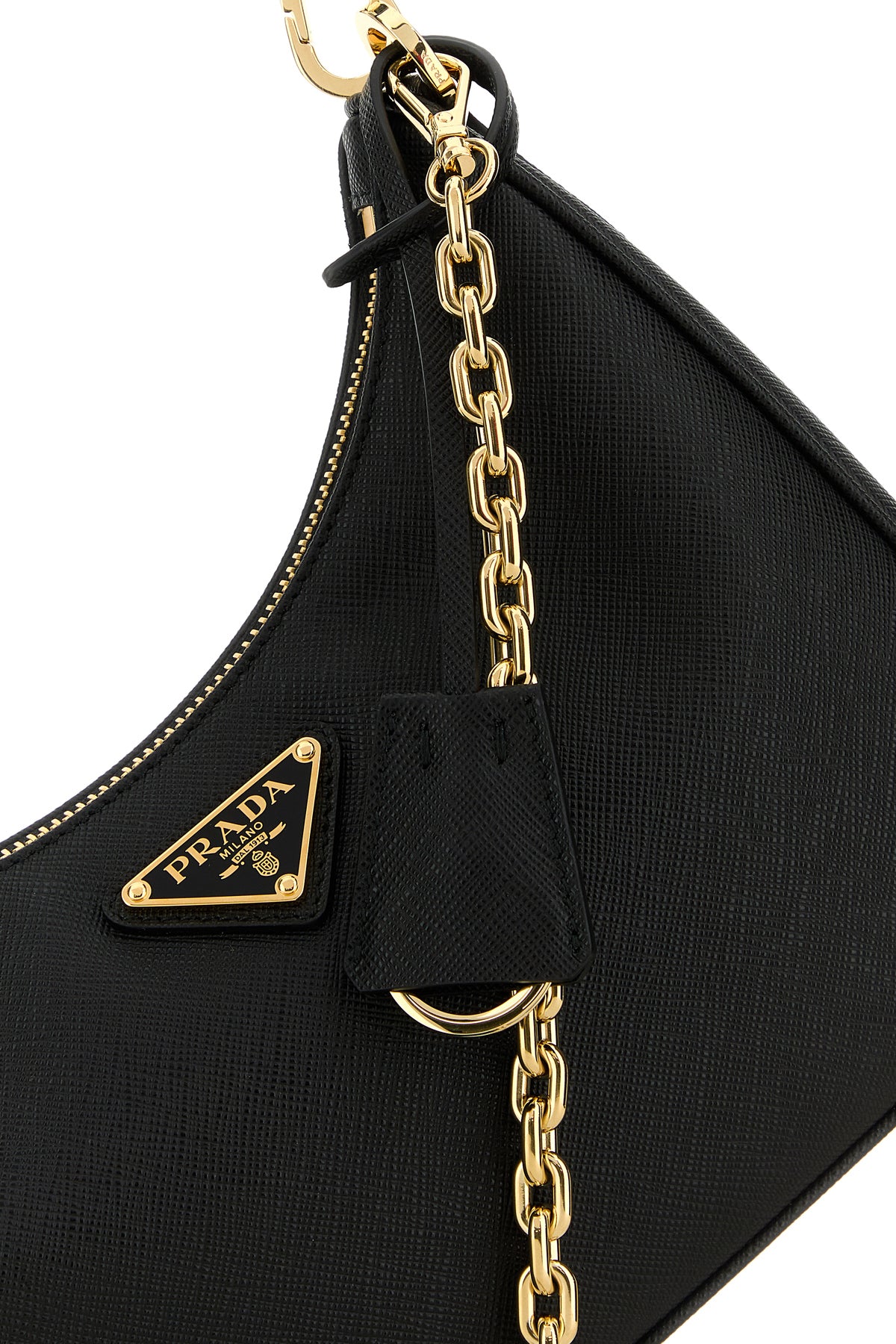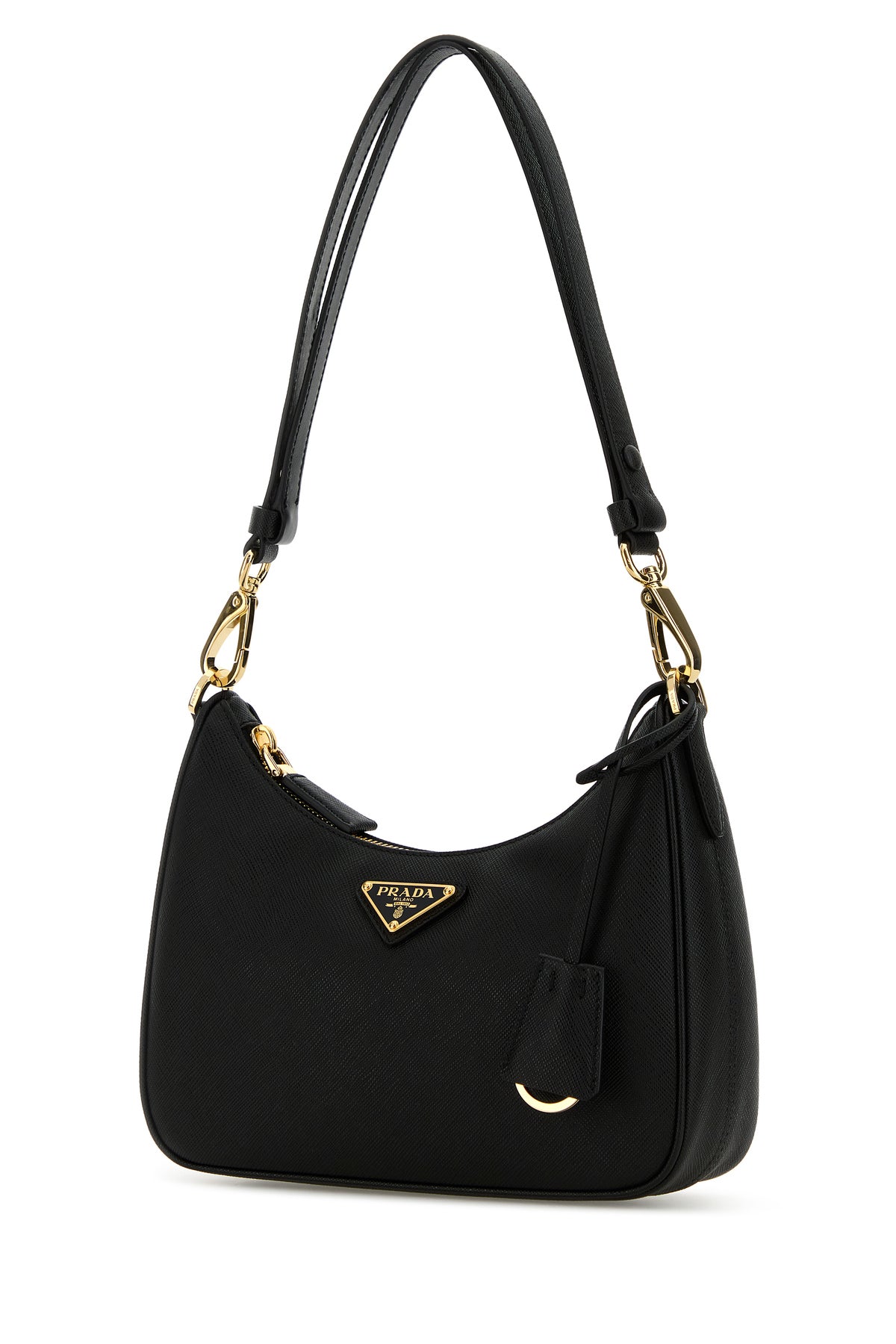 Borsa a spalla realizzata in pelle Saffiano arricchita da iconico triangolo logato sulla parte frontale e accessorio amovibile logato in pelle con anello portachiavi metallico.