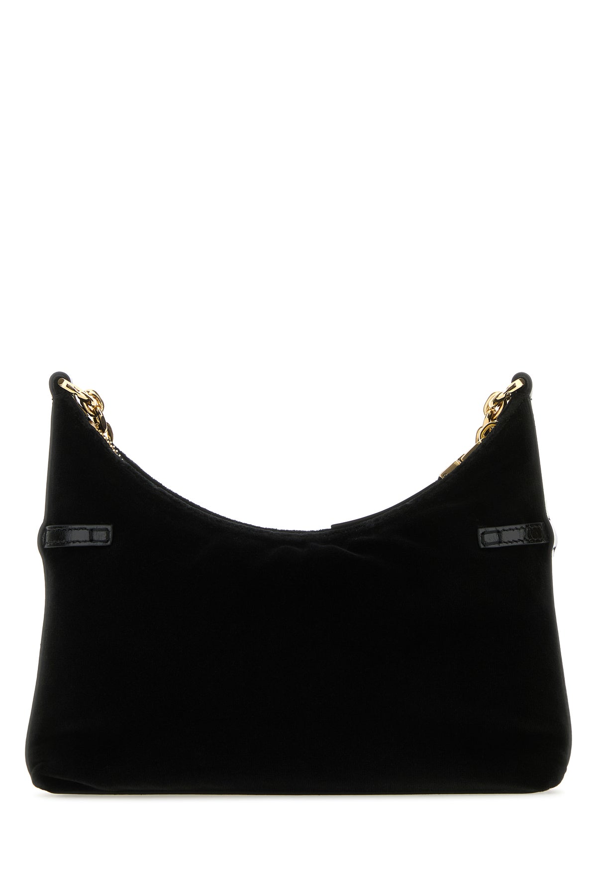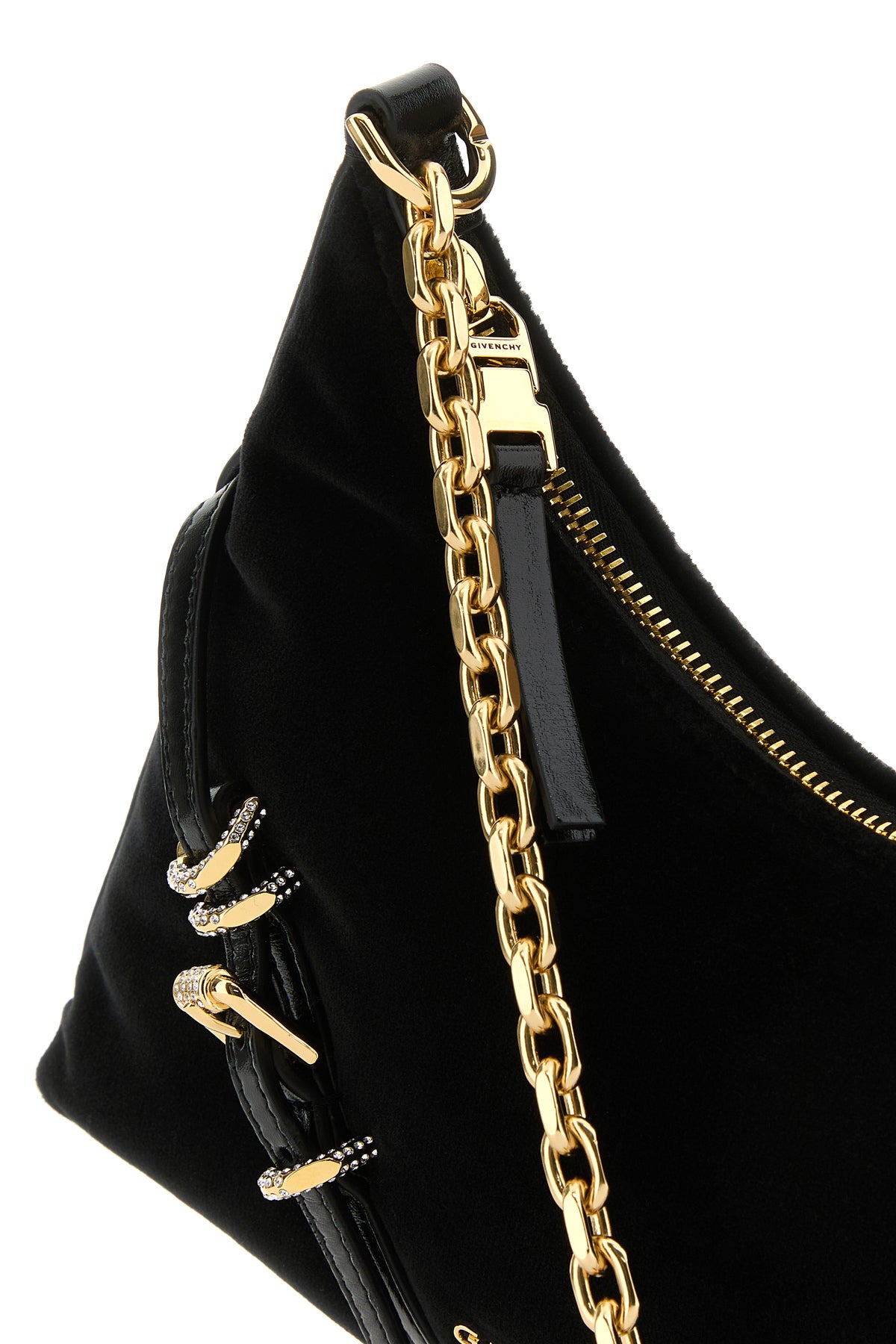 Borsa a spalla realizzata in velluto arricchita da logo in lettere metalliche e cinturini decorativi sulla parte frontale.