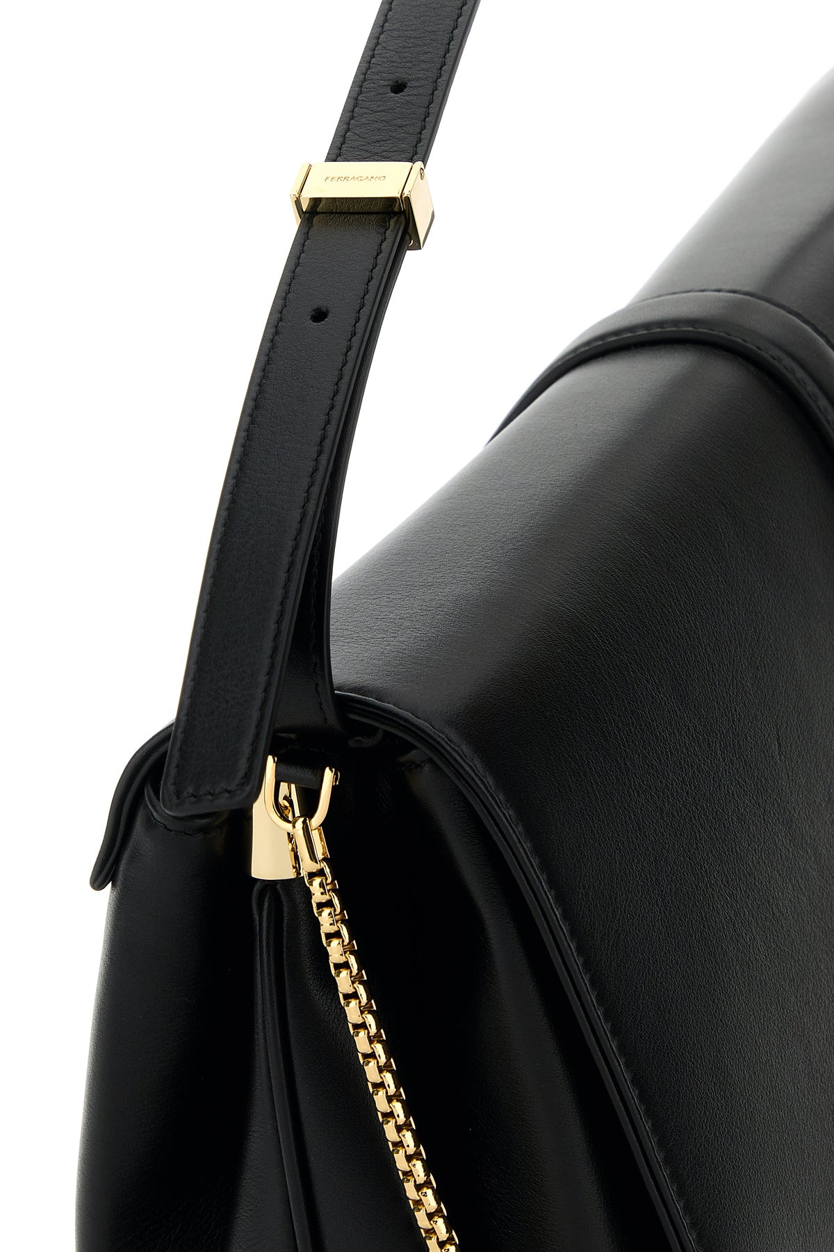 Borsa a tracolla realizzata in pelle di vitello liscia arricchita da dettaglio metallico Gancini sulla parte frontale.