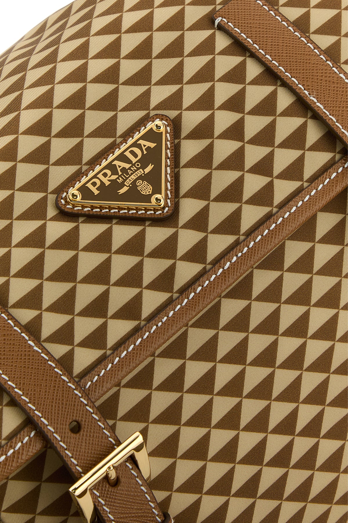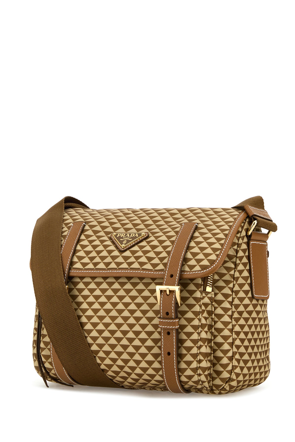 Borsa a tracolla realizzata in Re-Nylon caratterizzata da particolare stampa su tutta la superficie arricchita da iconico triangolo logato in metallo sulla parte frontale.