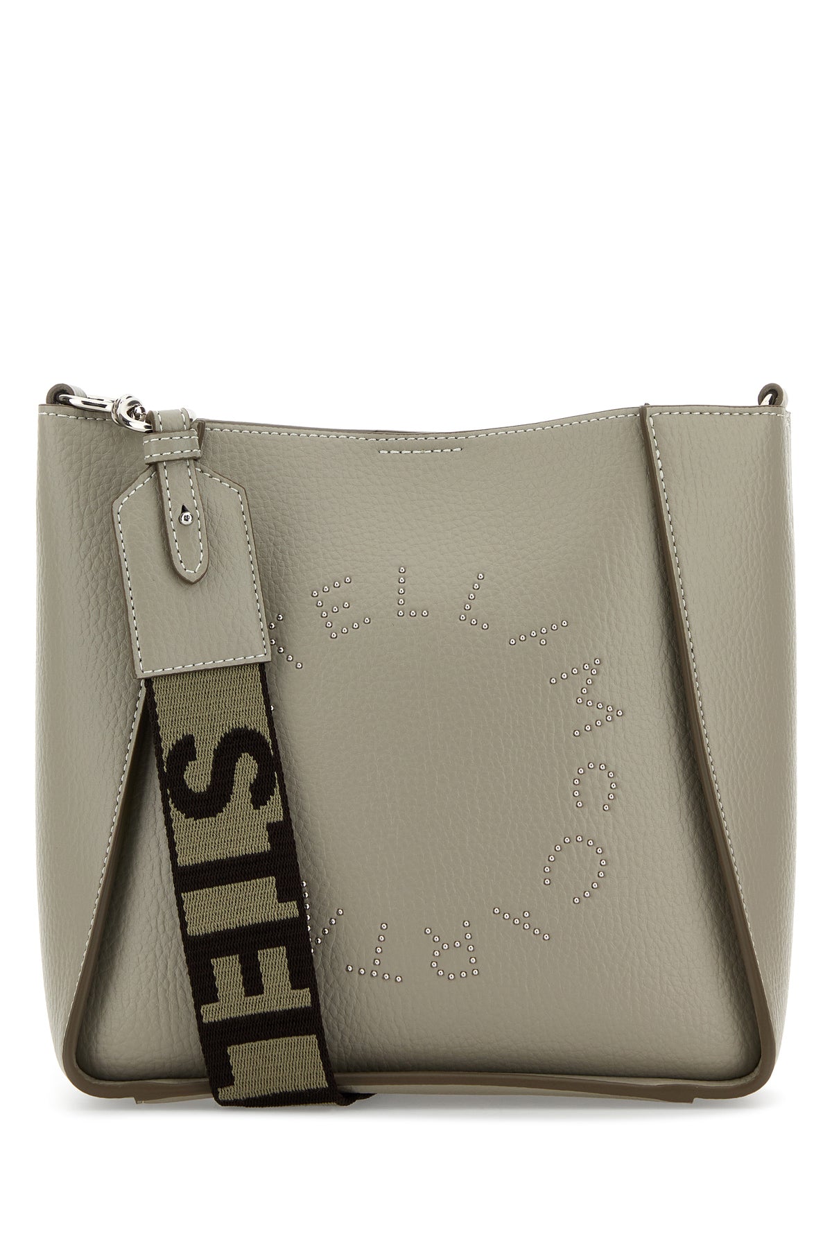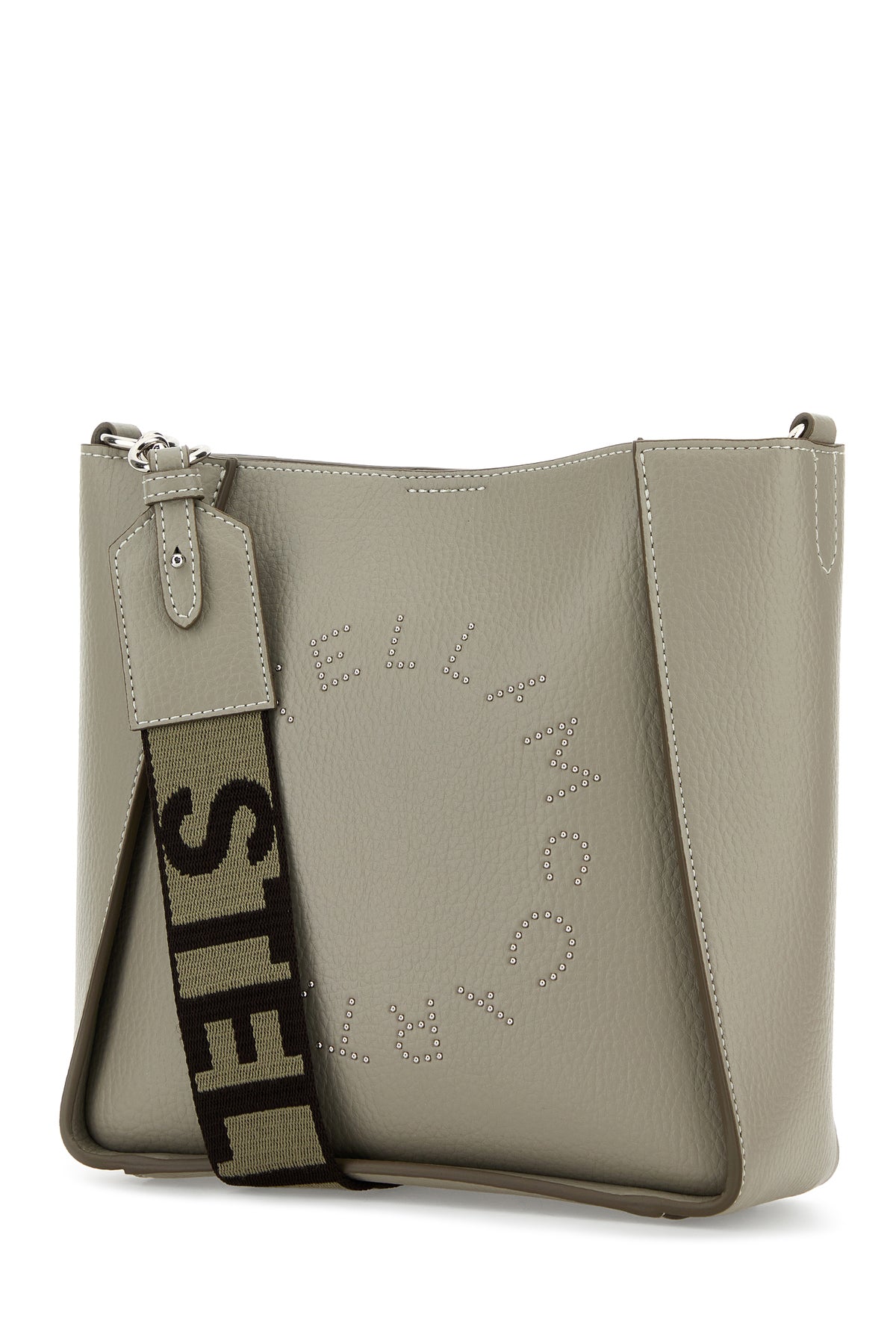 Borsa a tracolla realizzata in alter mat martellato caratterizzata da motivo Stella Logo con borchie metalliche sulla parte frontale e logo ricamato sulla tracolla regolabile amovibile.