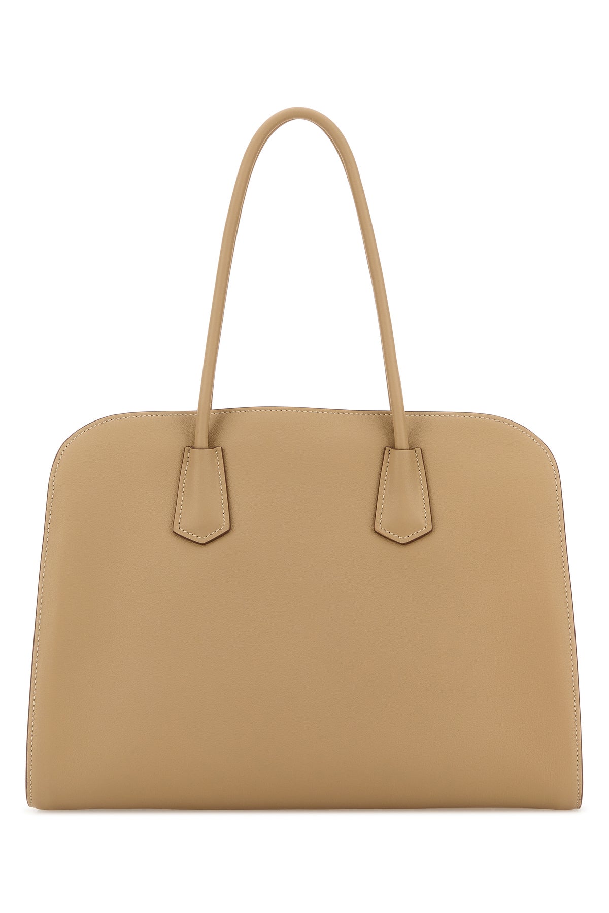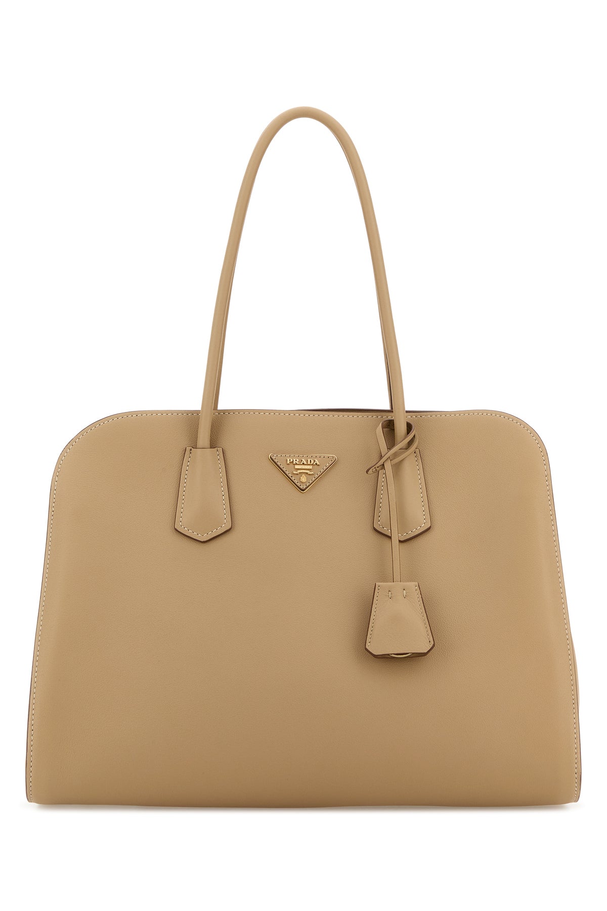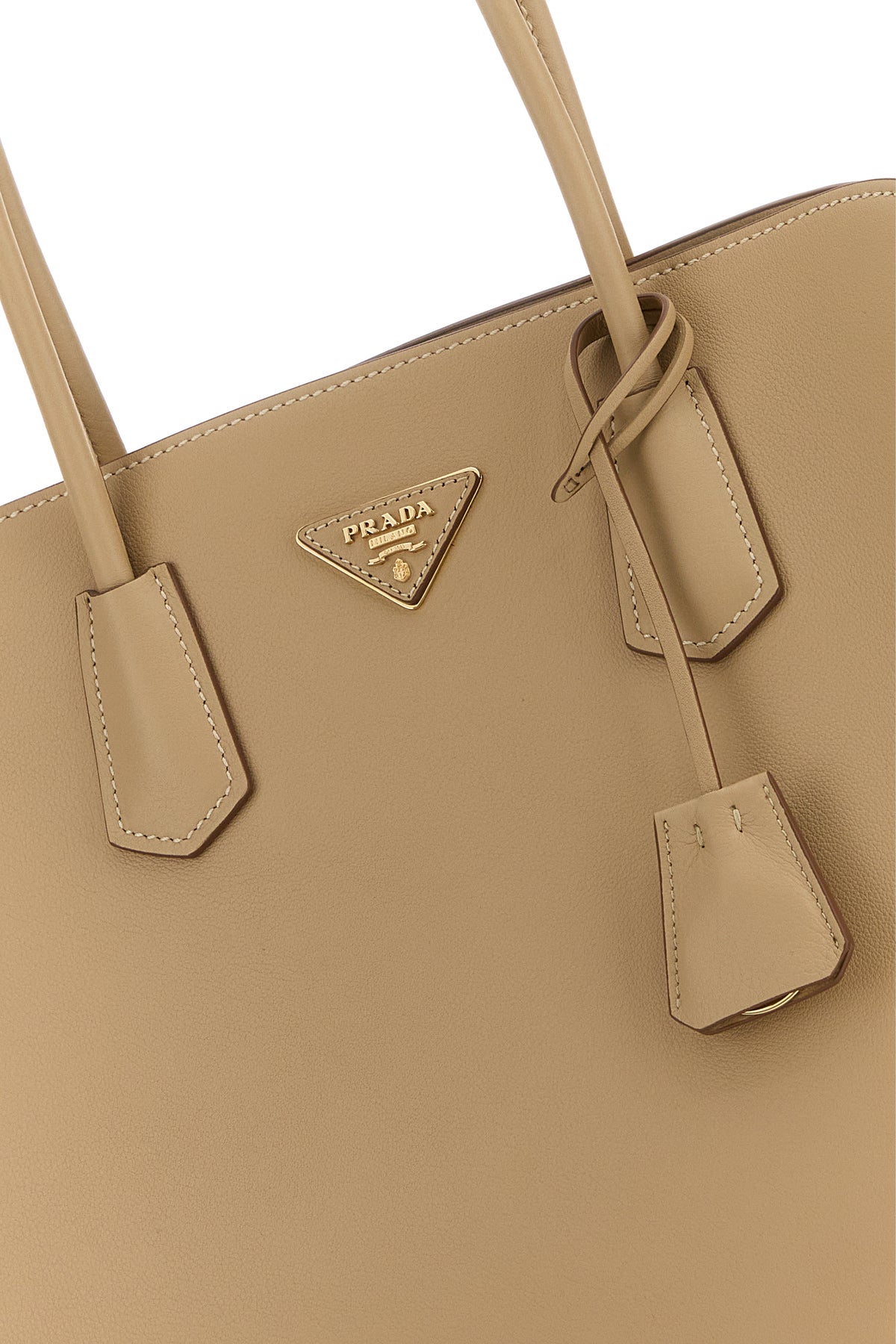 Borsa shopping realizzata in pelle martellata arricchita da iconico triangolo metallico logato sulla parte frontale.