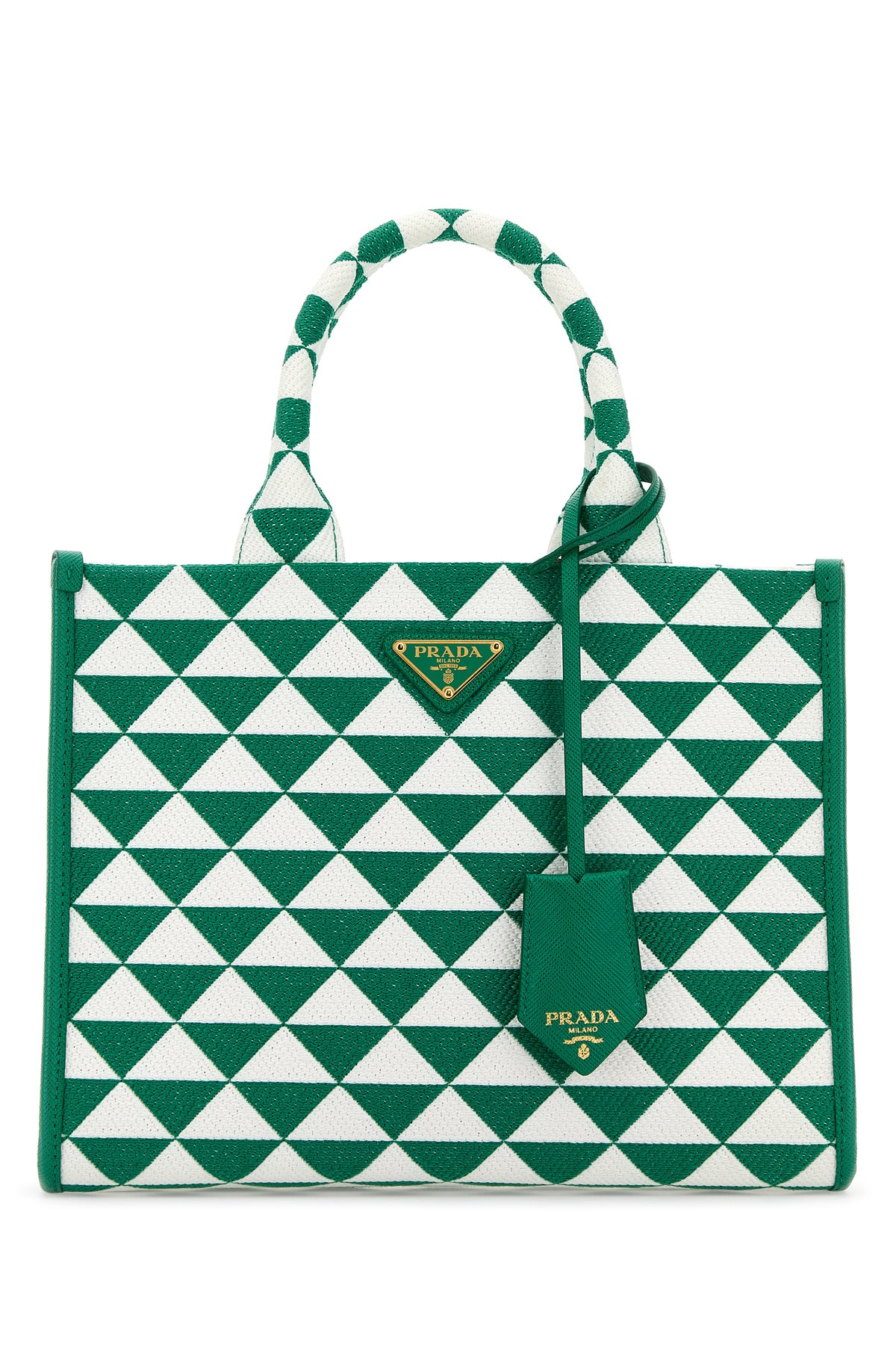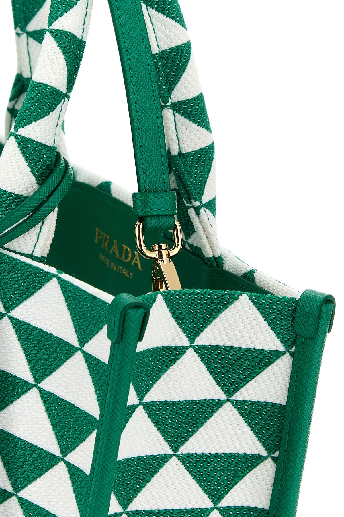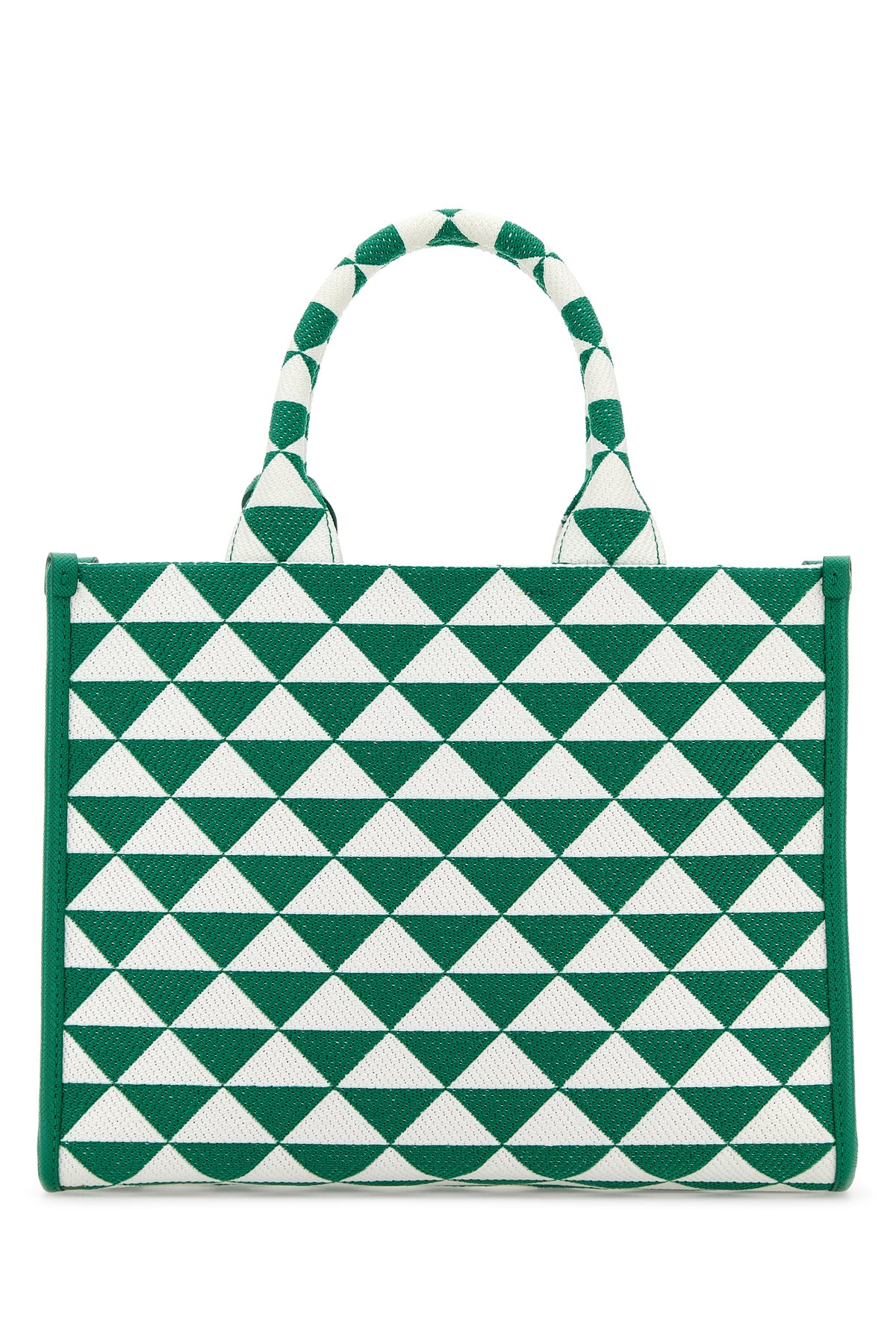Borsa shopping realizzata in tessuto caratterizzata da ricamo a geometrico su tutta la superficie arricchita da accessorio amovibile logato in pelle e iconico triangolo metallico sulla parte frontale.