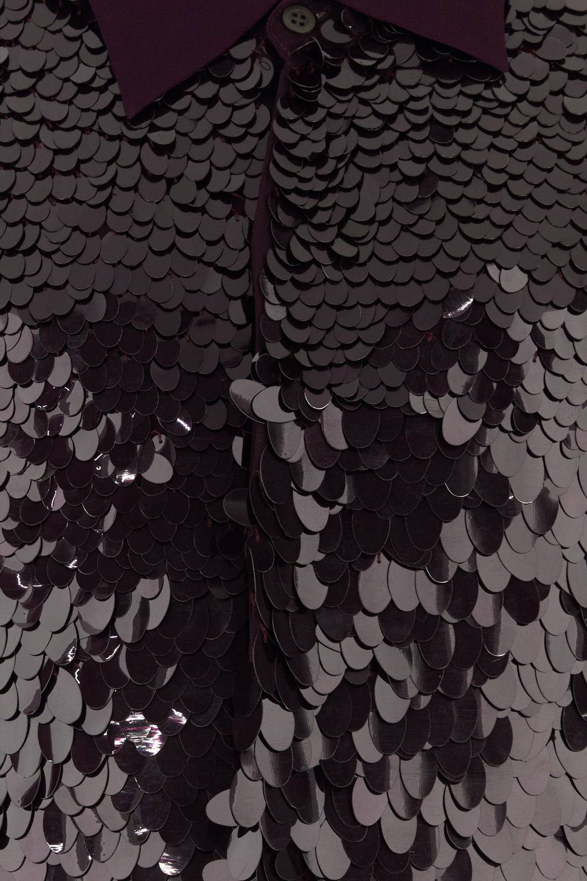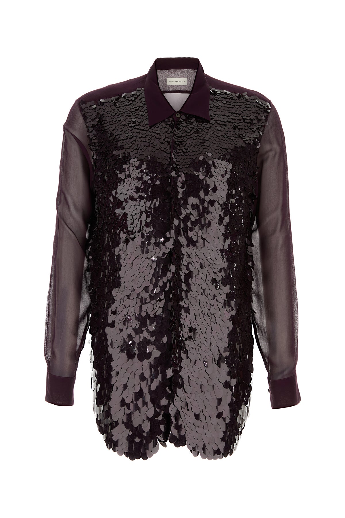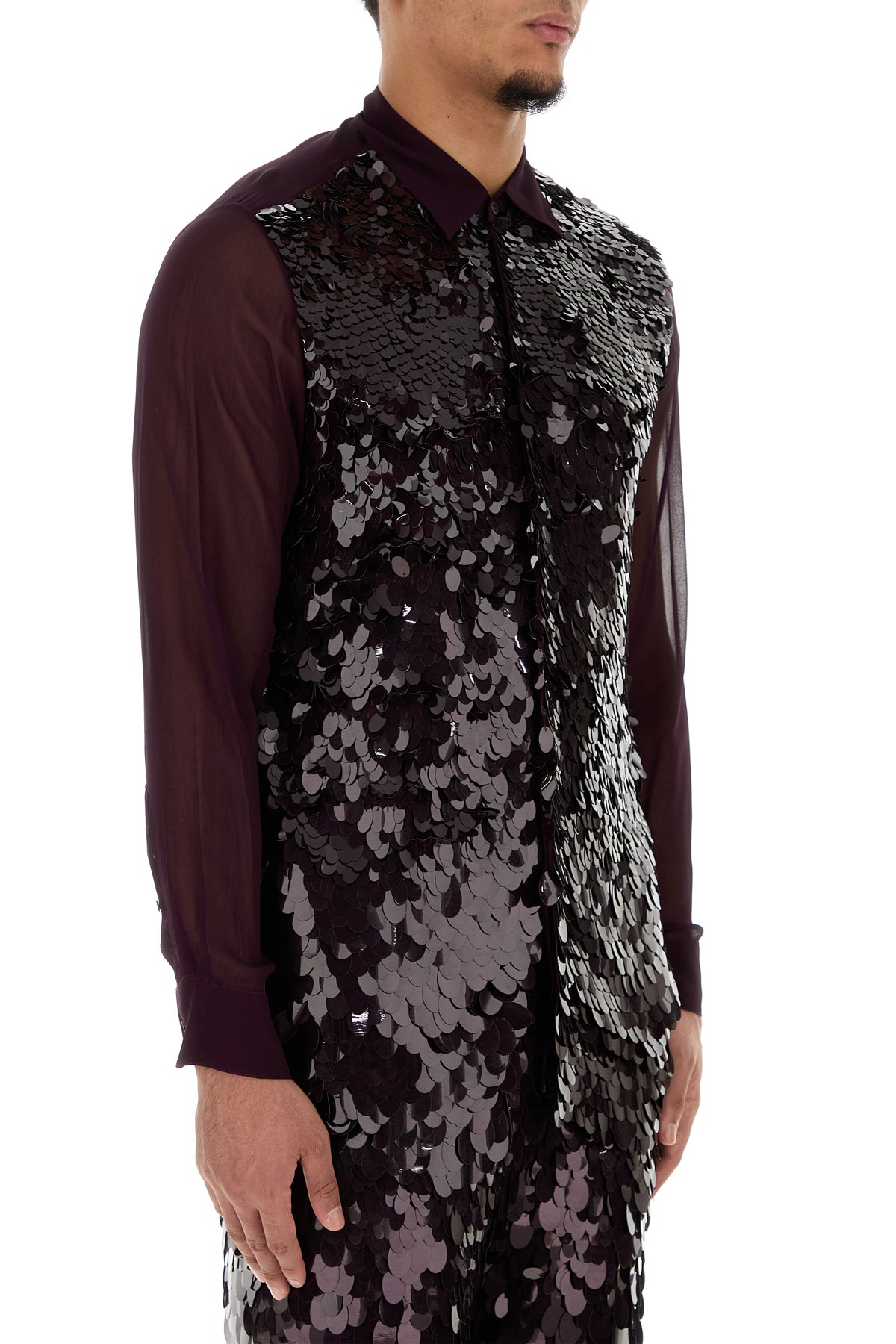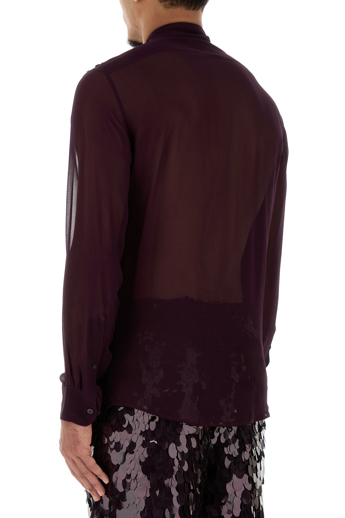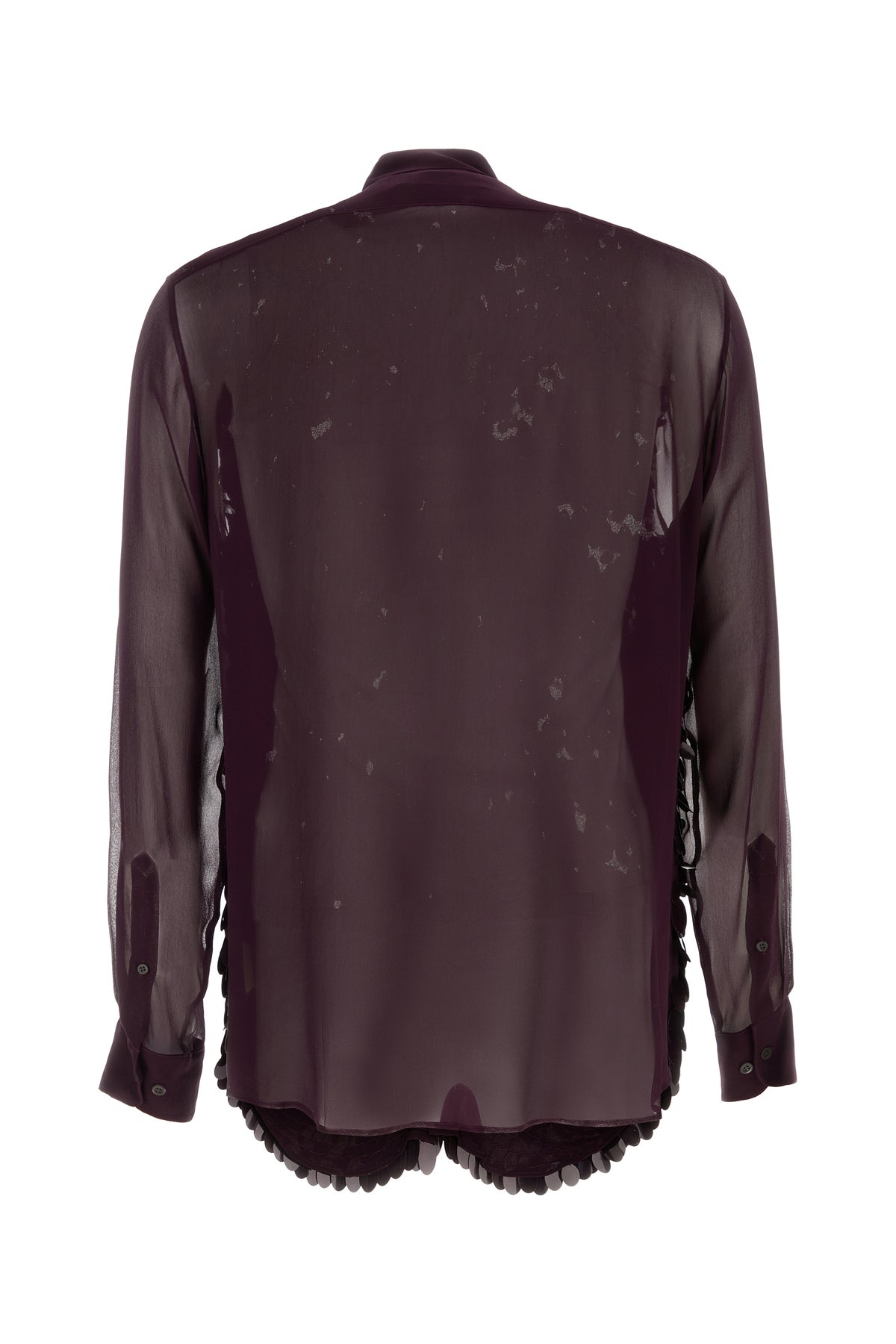 Camicia dal taglio lungo realizzata in crepe arricchita da paillettes tonali sulla parte frontale.