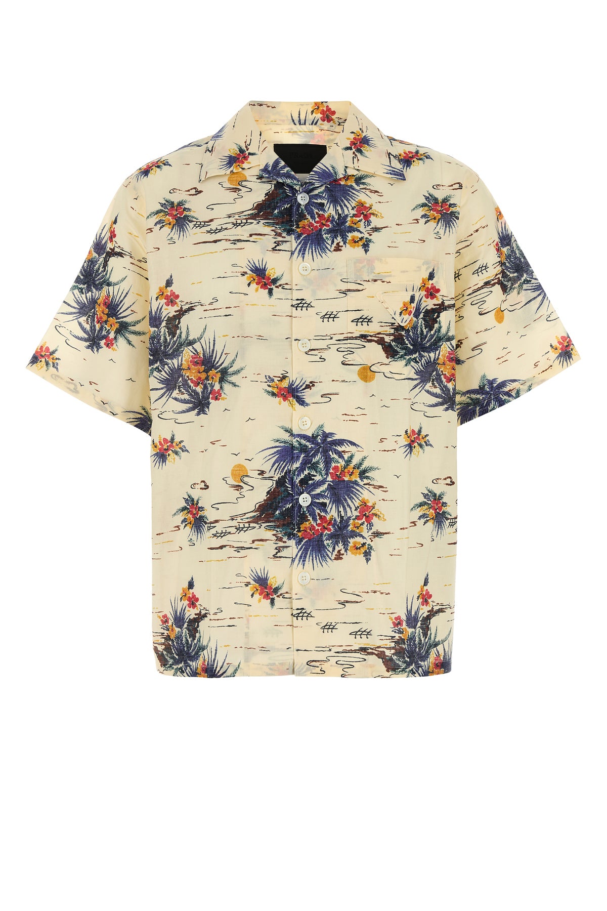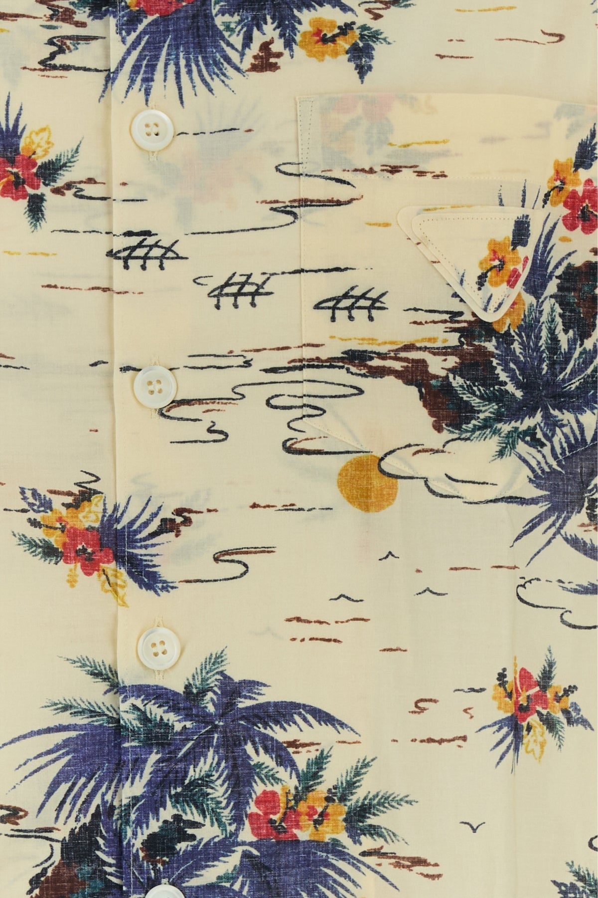 Camicia a maniche corte realizzata in puro cotone caratterizzata da particolare stampa su tutta la superficie arricchita da iconico triangolo in tessuto sul petto.