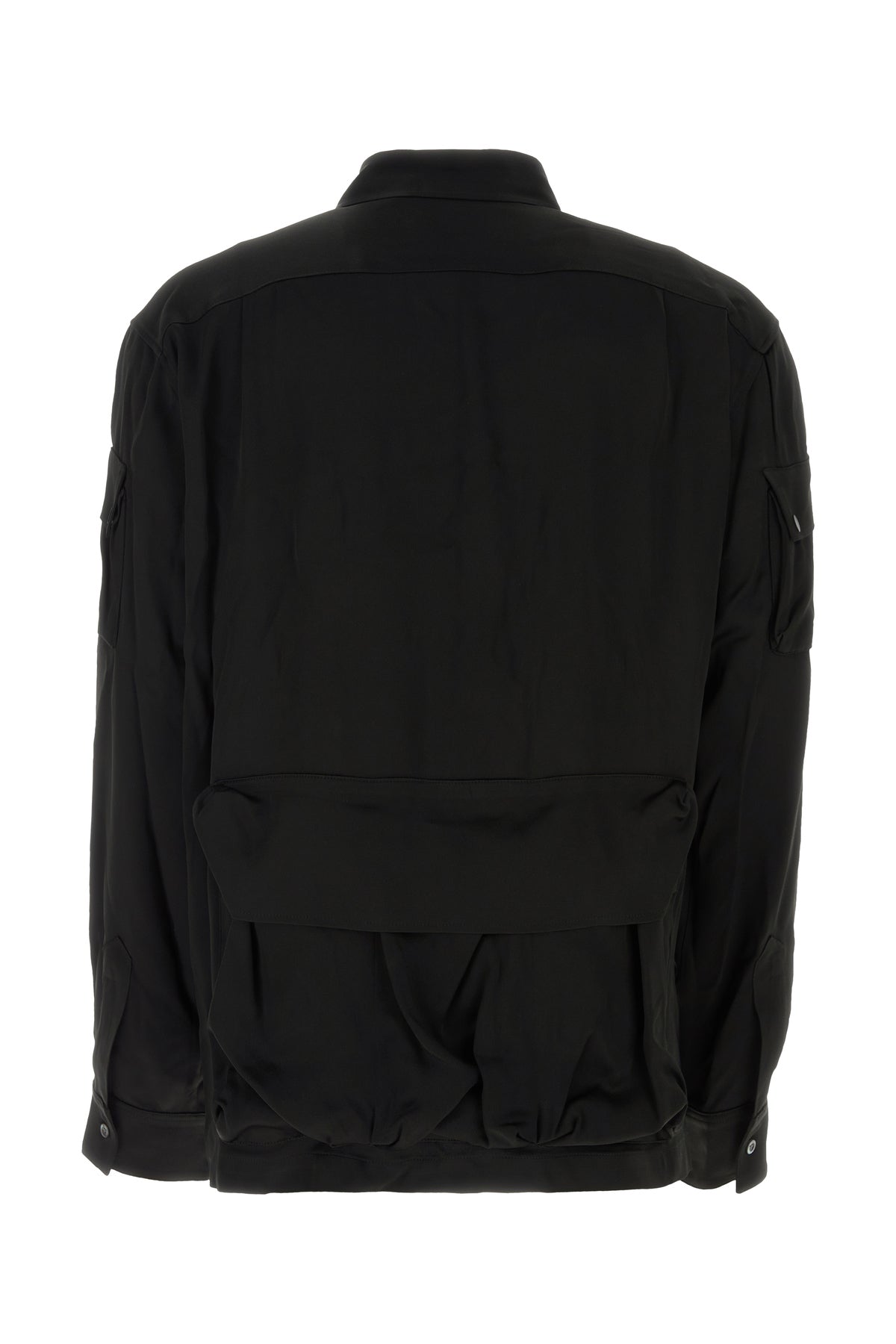 Camicia realizzata in raso arricchita da quattro tasche con patta sulla parte frontale, due sulle maniche e una sul retro.
