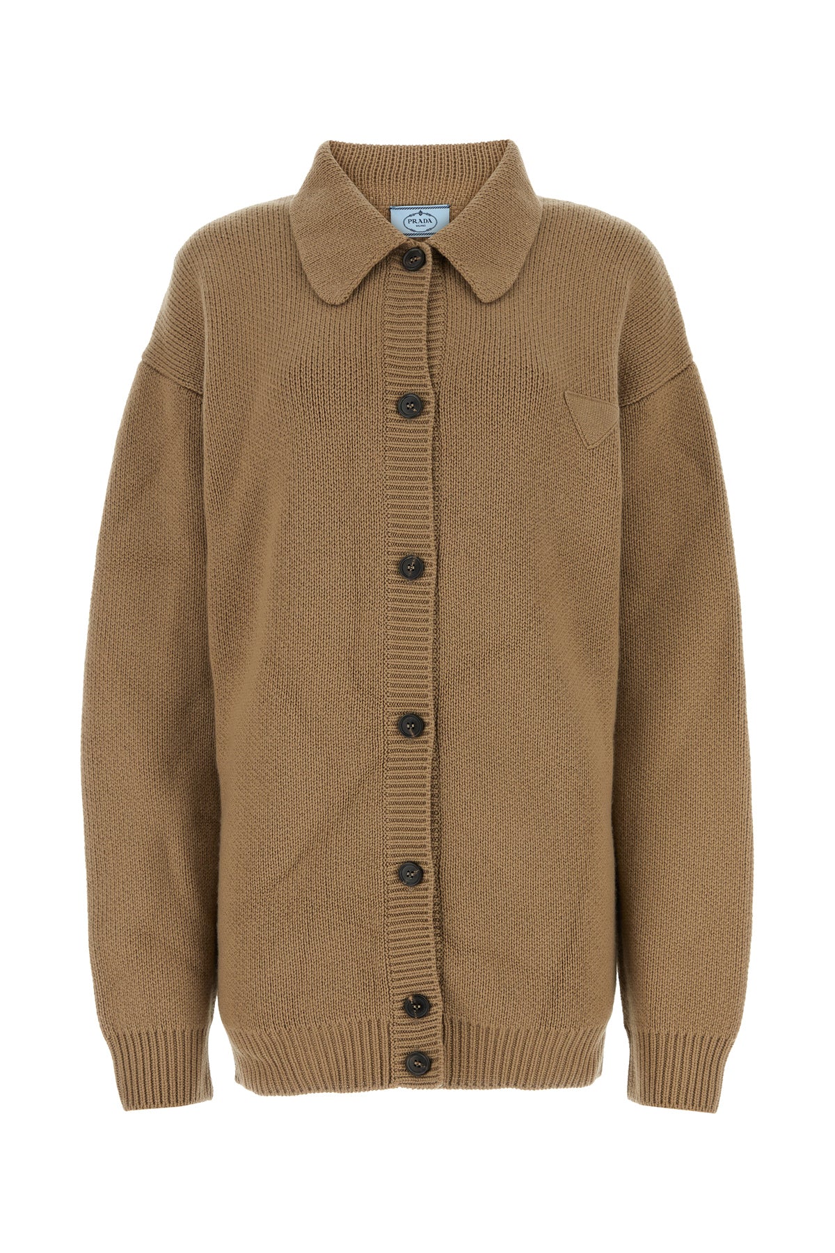 Cardigan realizzato in puro cashmere arricchito da iconico triangolo in tessuto tonale sul petto.