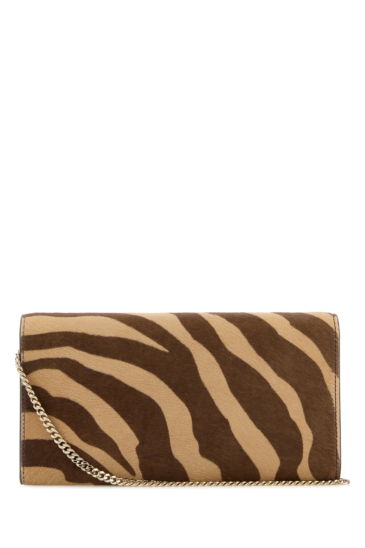 Clutch realizzata in cavallino caratterizzata da stampa animalier su tutta la superficie e logo impresso sulla parte frontale.