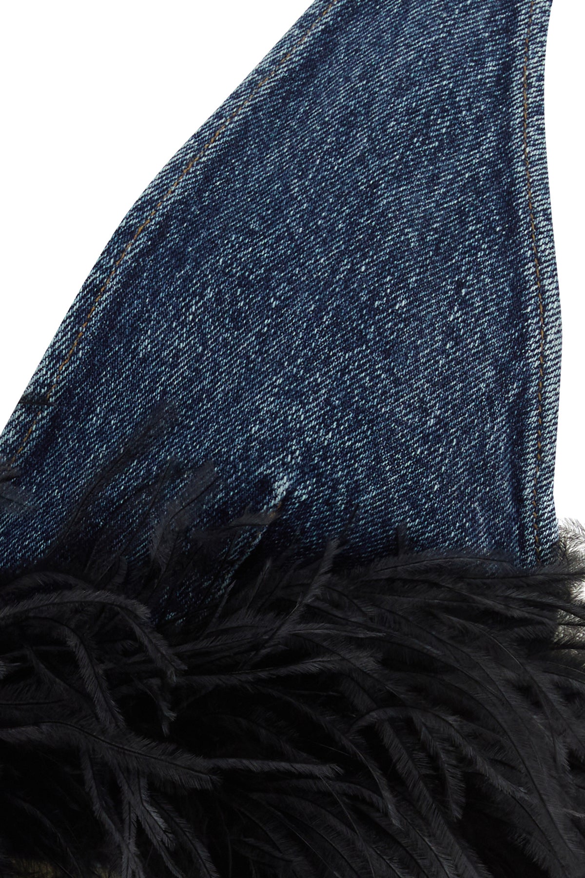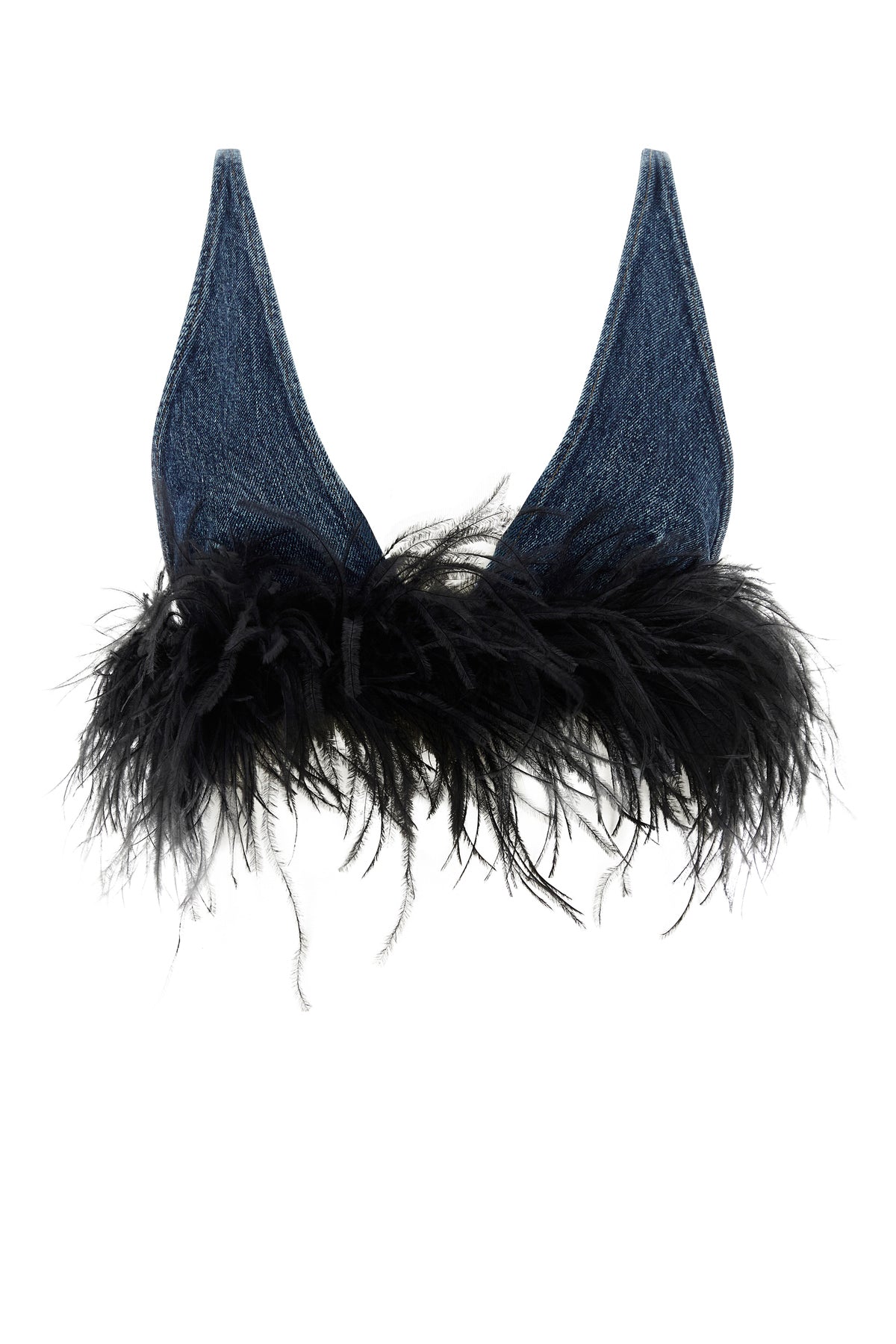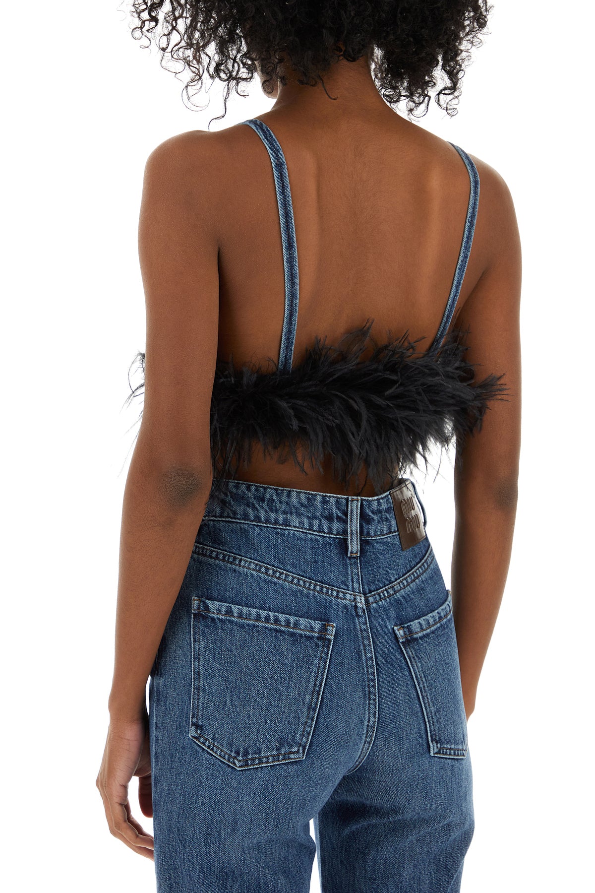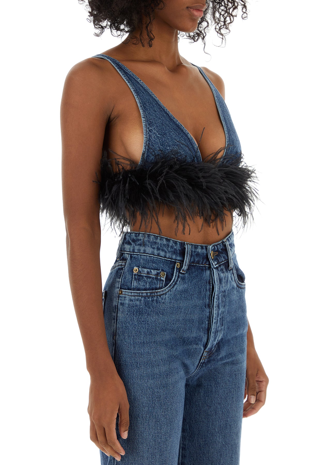 Crop top realizzato in denim di puro cotone arricchito da inserto in piume a contrasto sul fondo.