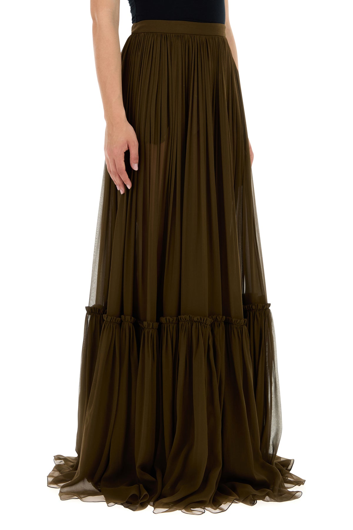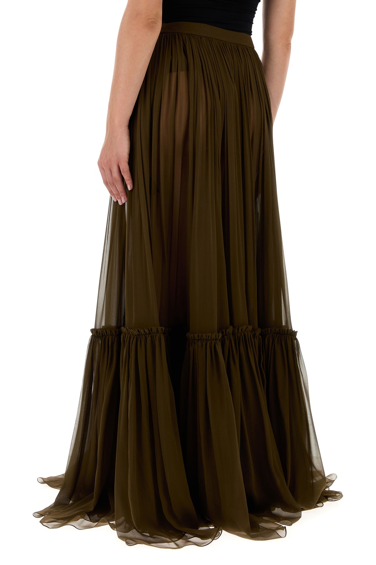 Gonna svasata realizzata in crepe di pura seta caratterizzata da balza sul fondo.
