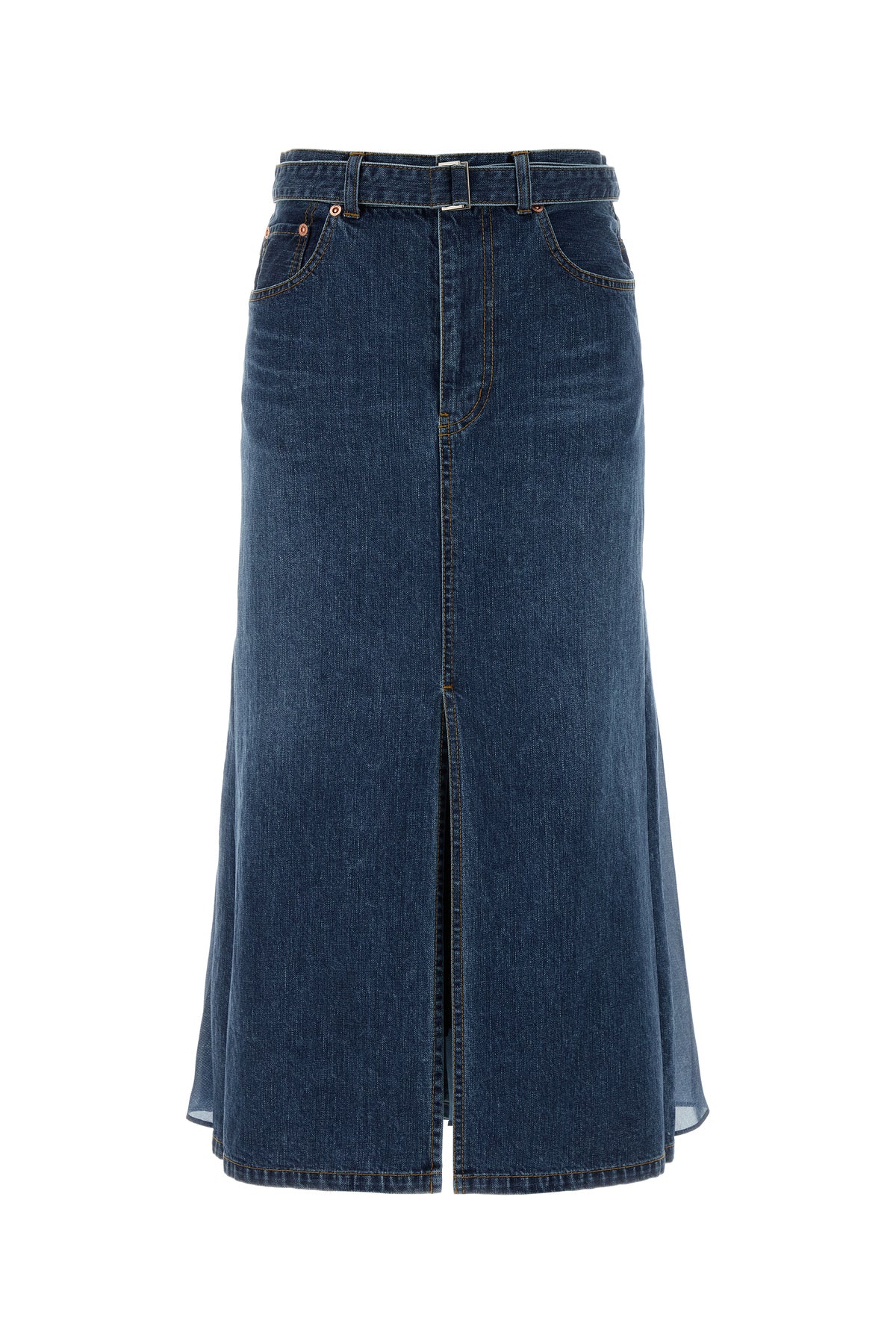 Gonna midi realizzata in denim di puro cotone leggermente slavato arricchita da cintura amovibile con fibbia metallica.