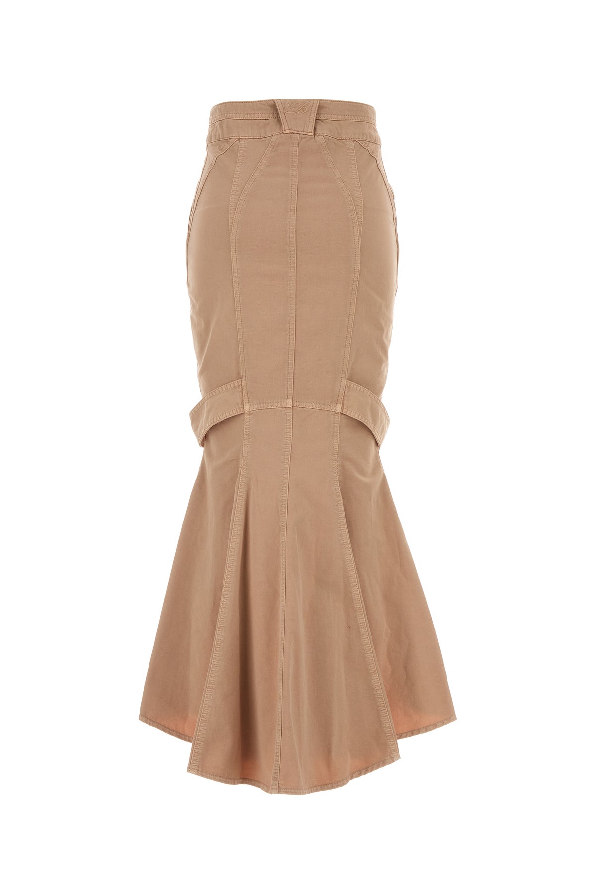Gonna midi realizzata in denim di puro cotone caratterizzata da ricamo B tonale sul retro arricchito da cinturini decorativi sulla parte frontale.