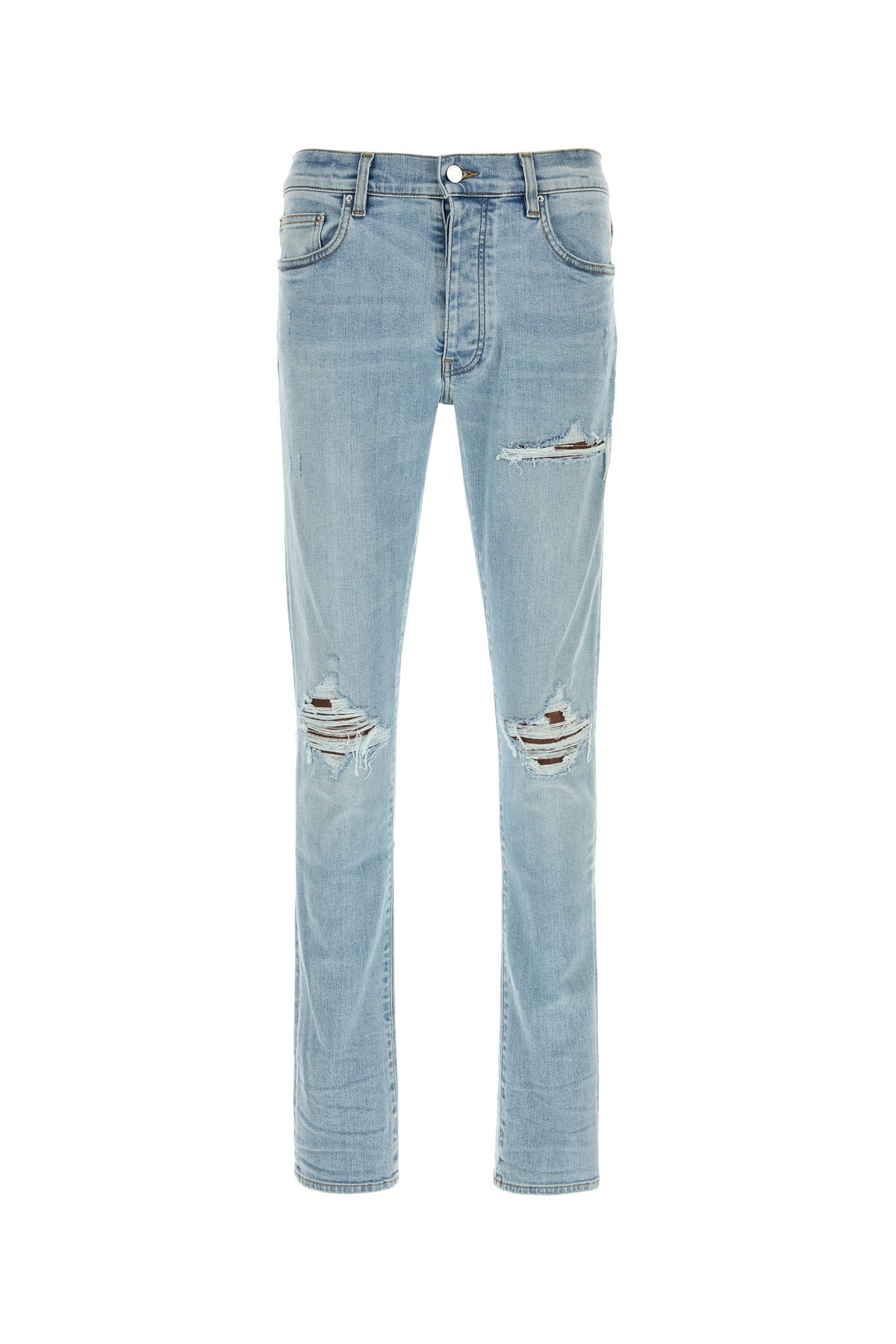 Jeans realizzati in denim di cotone stretch slavato e sdrucito caratterizzato da strappi ricuciti arricchito da etichetta logata sul retro.