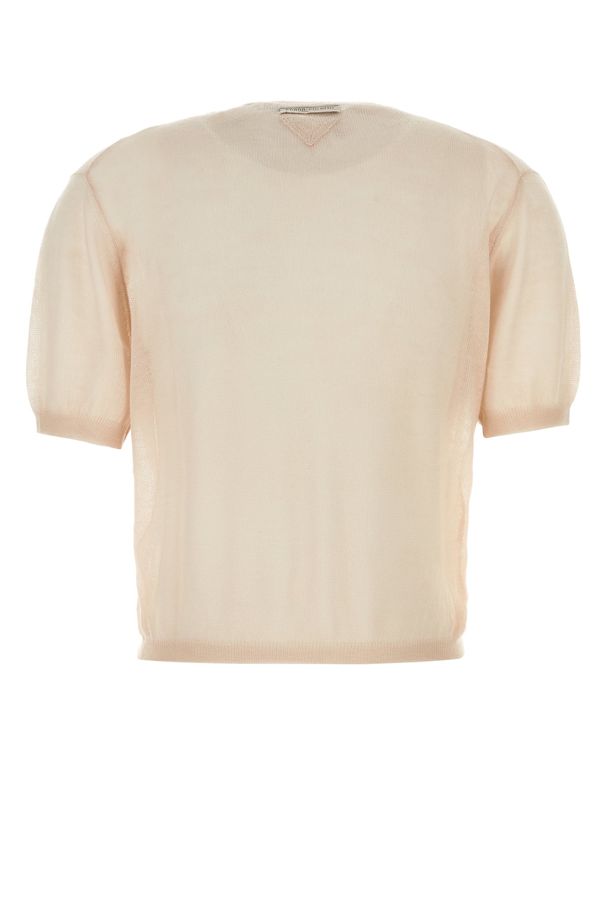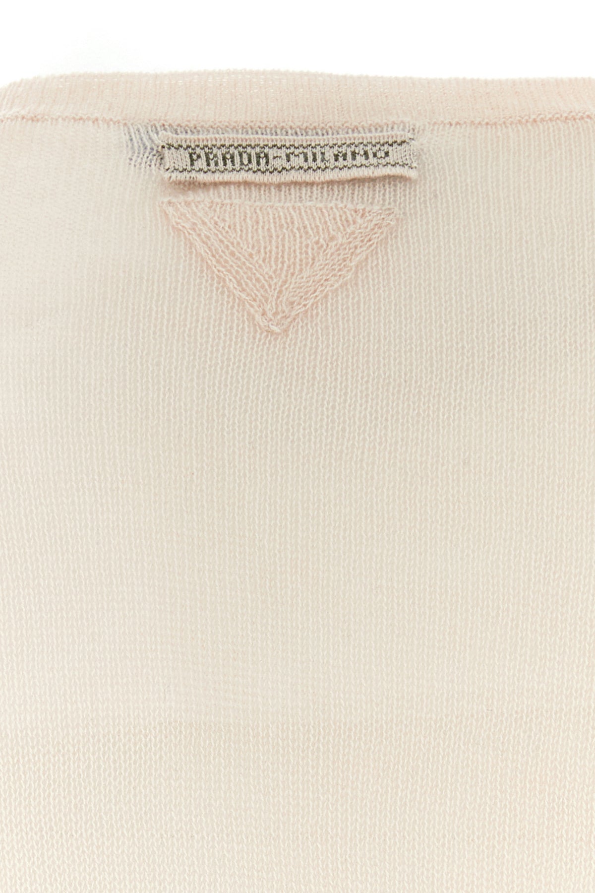 Maglione semitrasparente a maniche corte realizzato in puro cashmere arricchito da iconico triangolo in tessuto tonale ed etichetta logata sul retro.