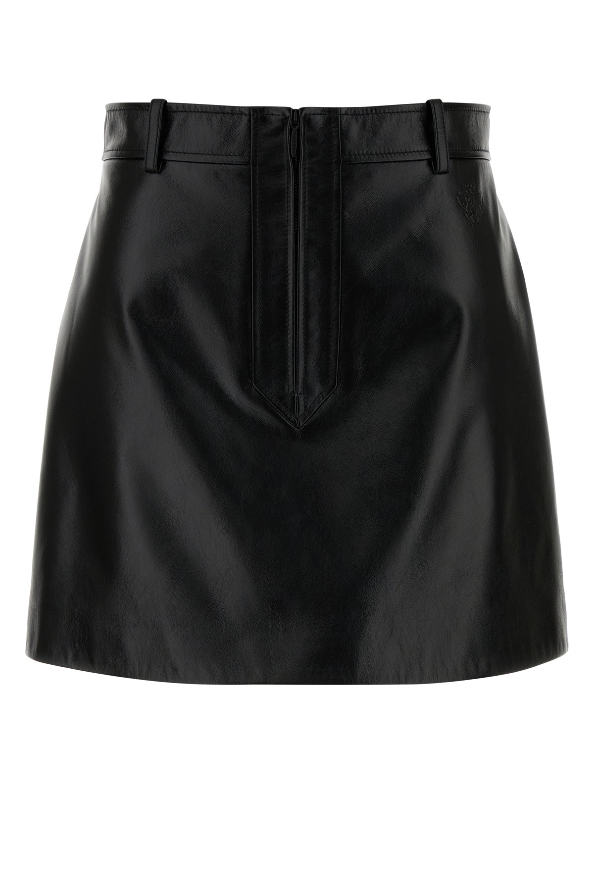 Minigonna realizzata in pelle bovina caratterizzata da motivo logato impresso sulla parte frontale.
