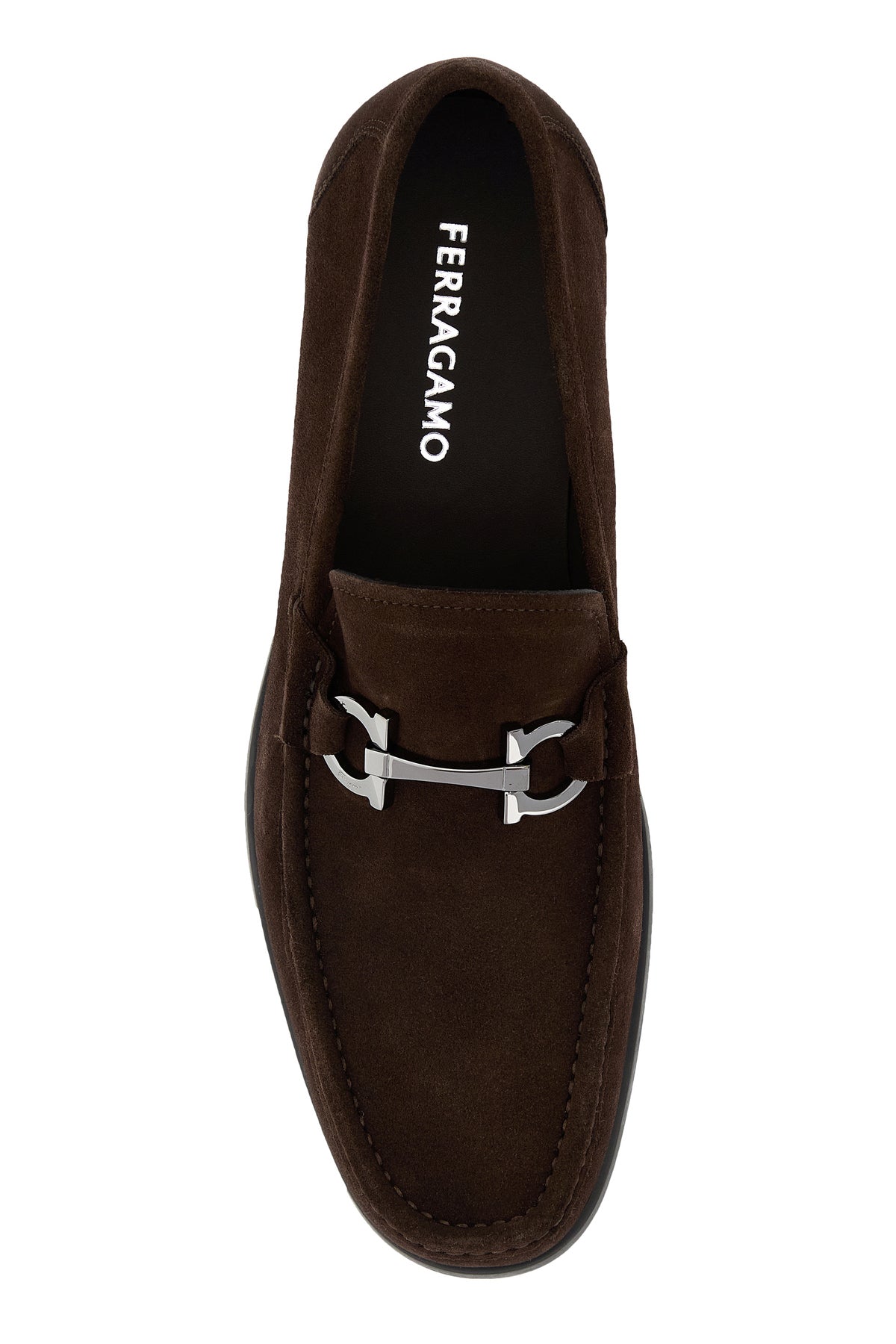 Mocassini realizzati in pelle scamosciata arricchiti da dettaglio metallico Gancini sul collo del piede.
