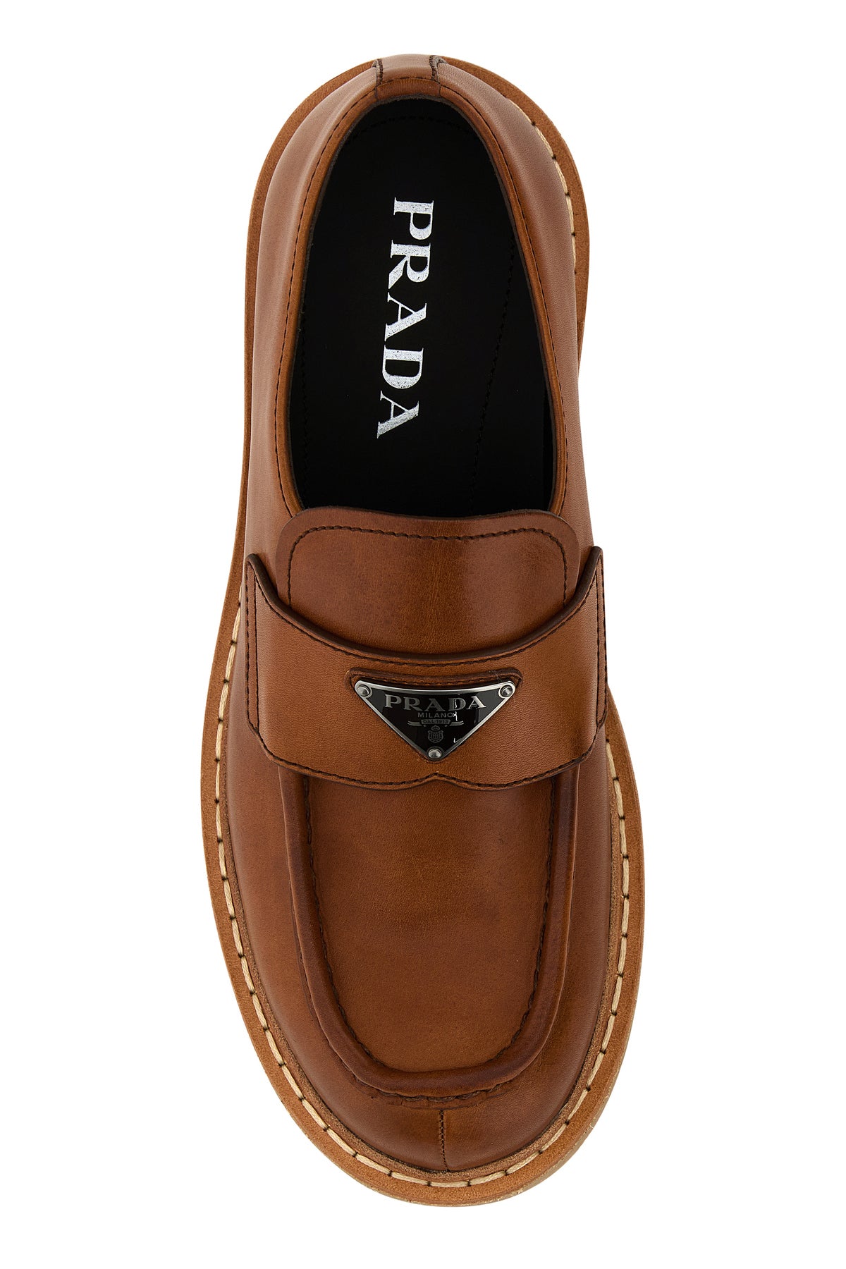 Mocassini realizzati in pelle di vitello leggermente martellata arricchiti da iconico triangolo metallico logato sulla mascherina.
