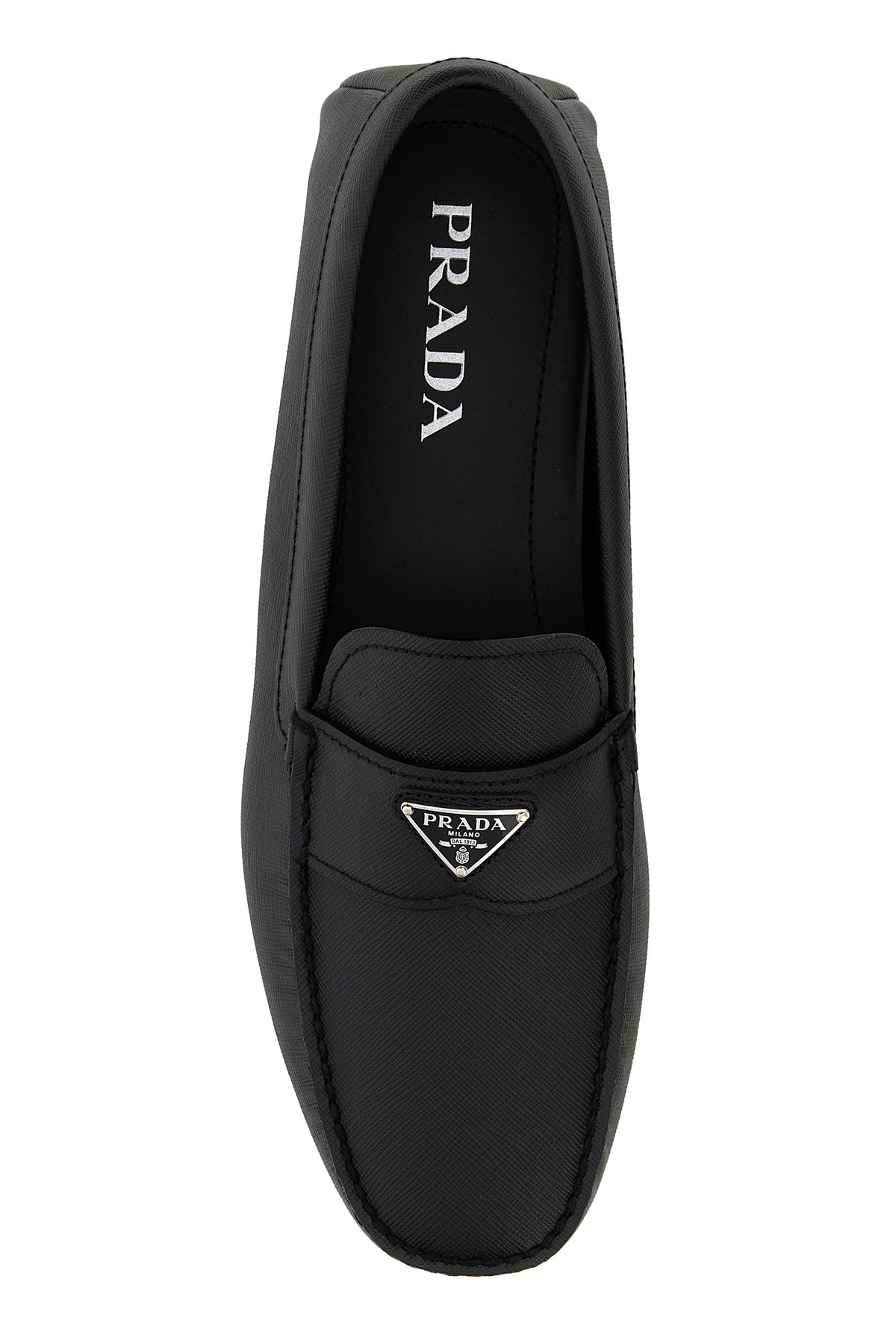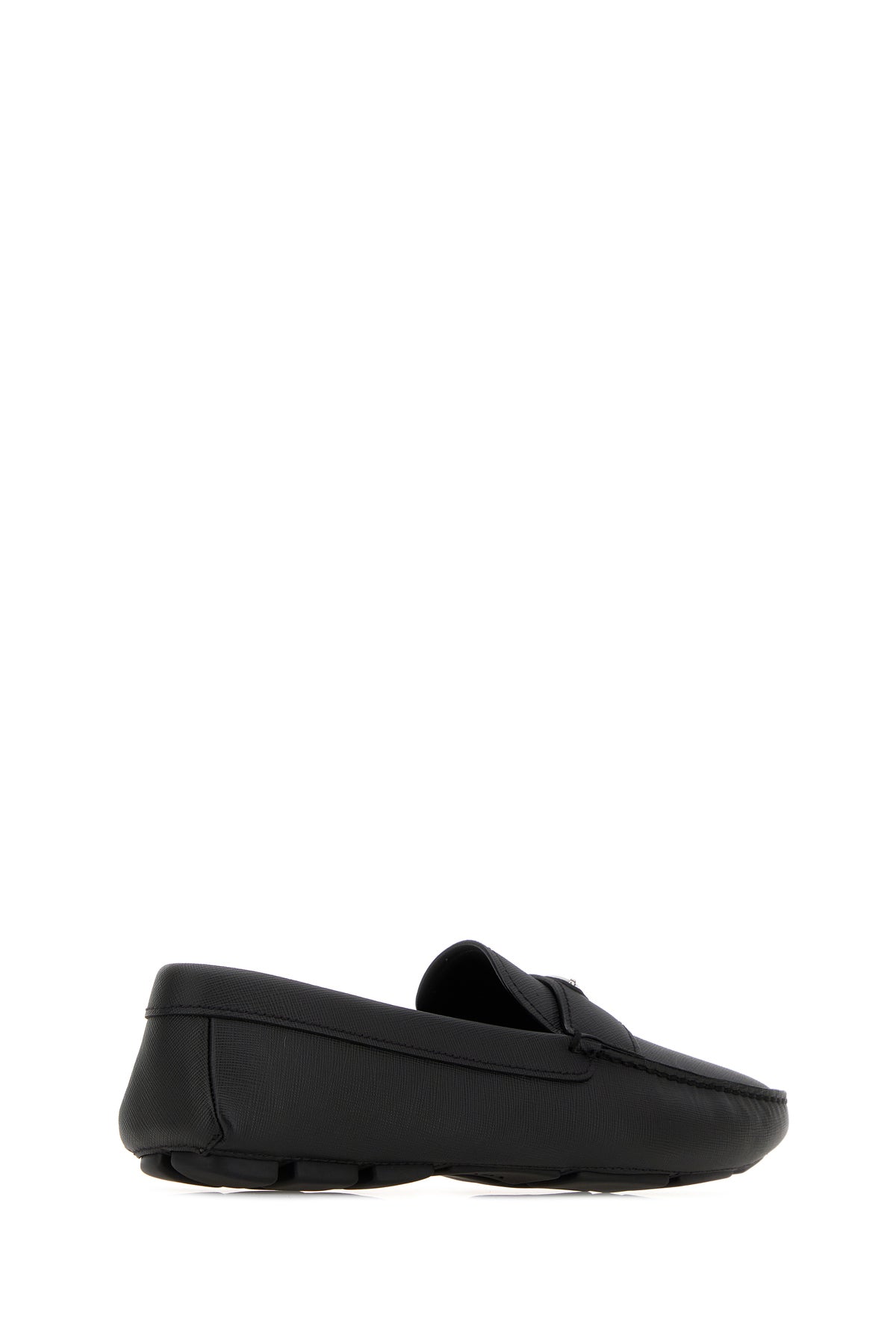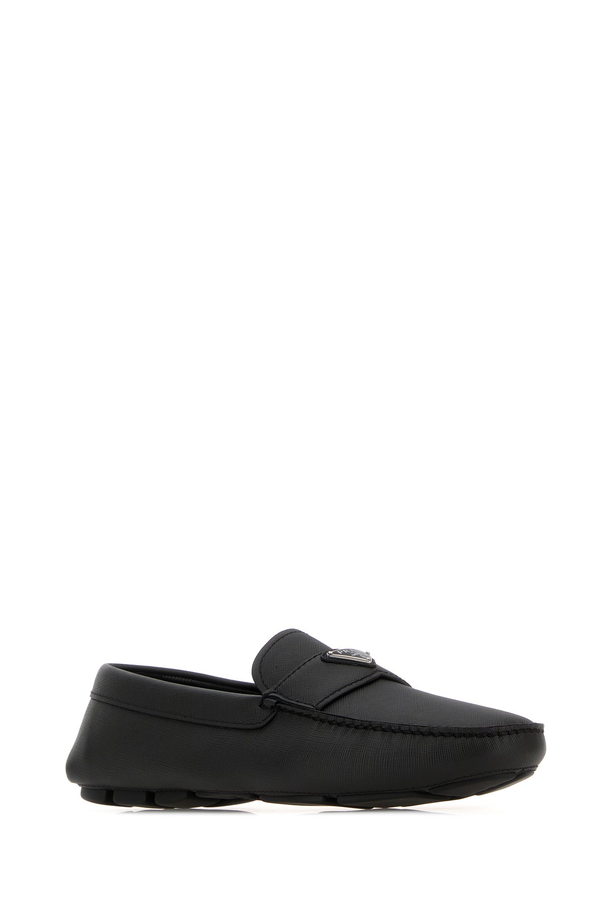 Mocassini realizzati in pelle Saffiano arricchiti a iconico triangolo metallico logato sulla mascherina.