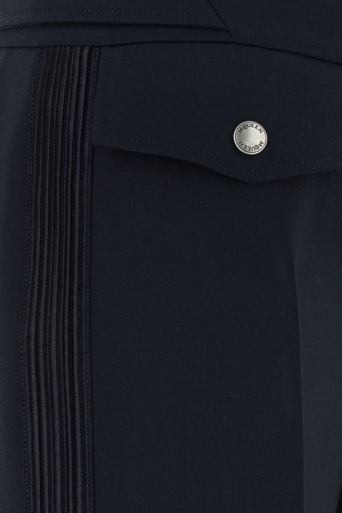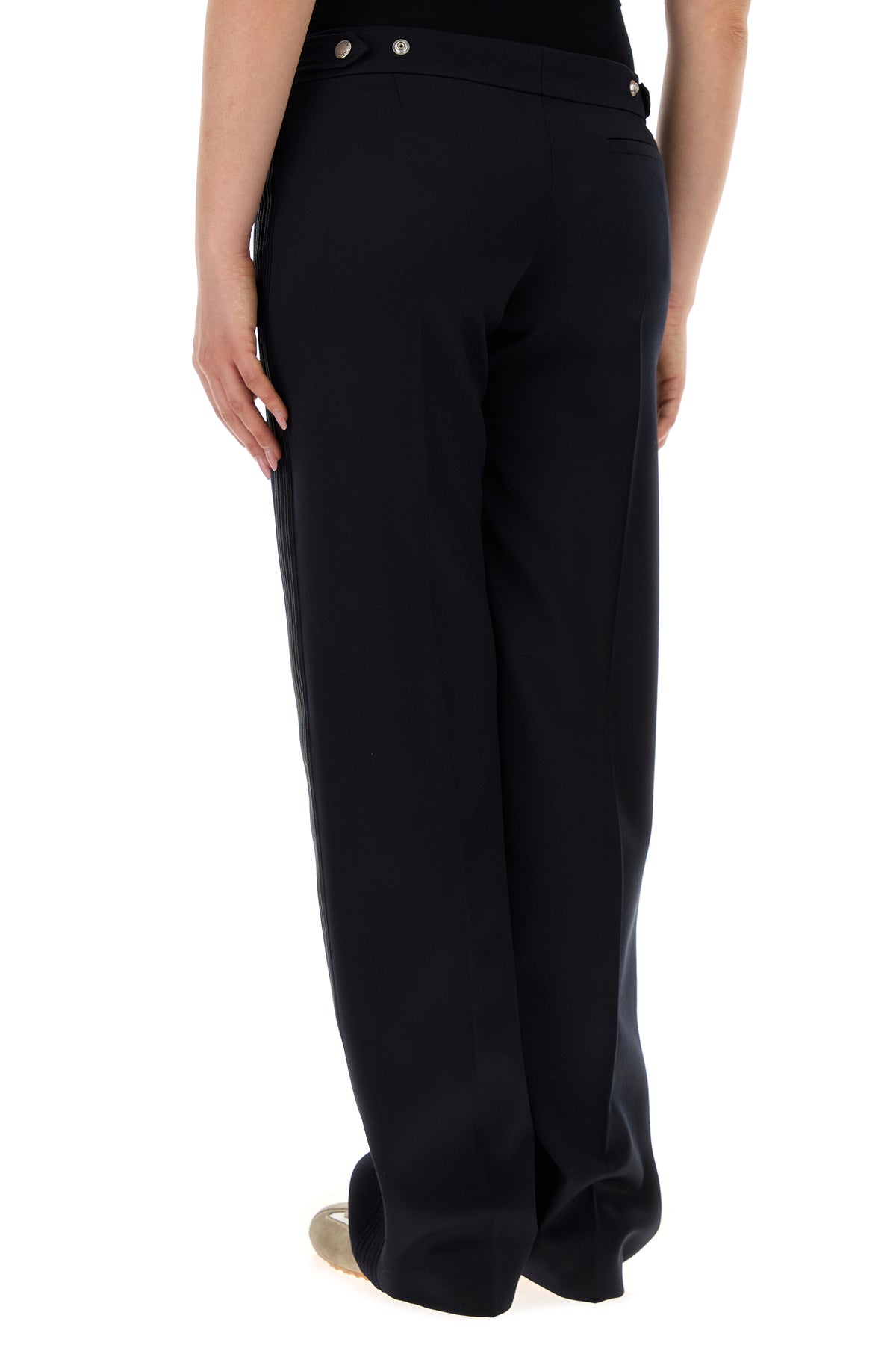 Pantalone realizzato in pura lana arricchito da bande in raso tonale sui lati.