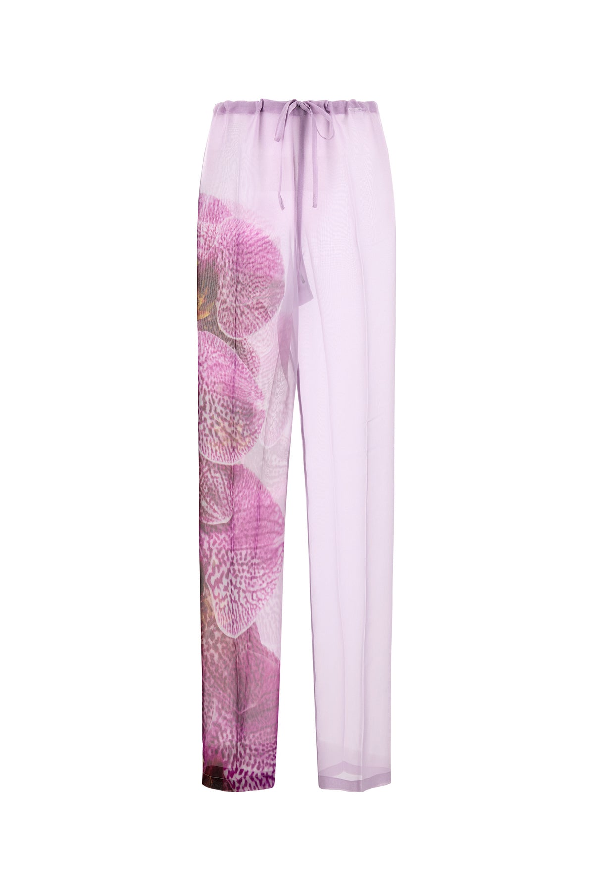 Pantalone semitrasparente realizzato in crepe caratterizzato da stampa floreale sul lato.