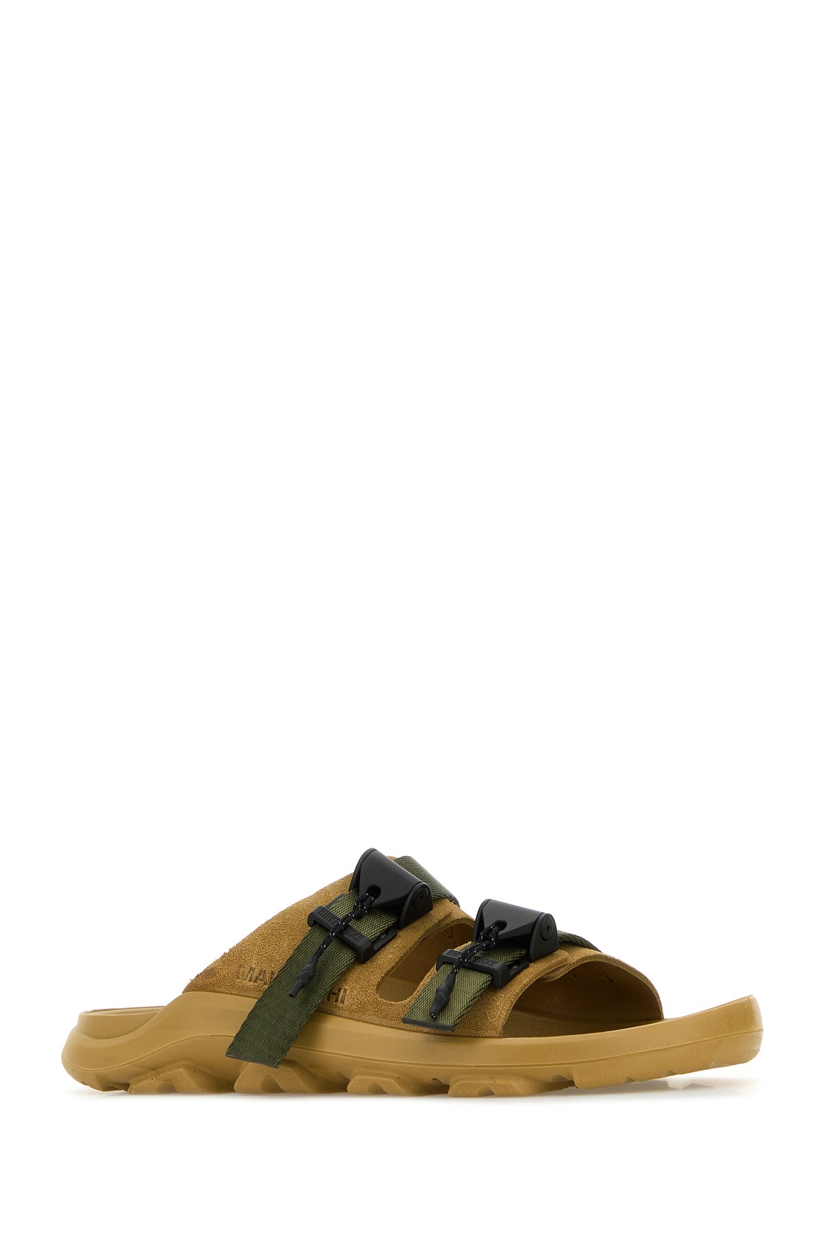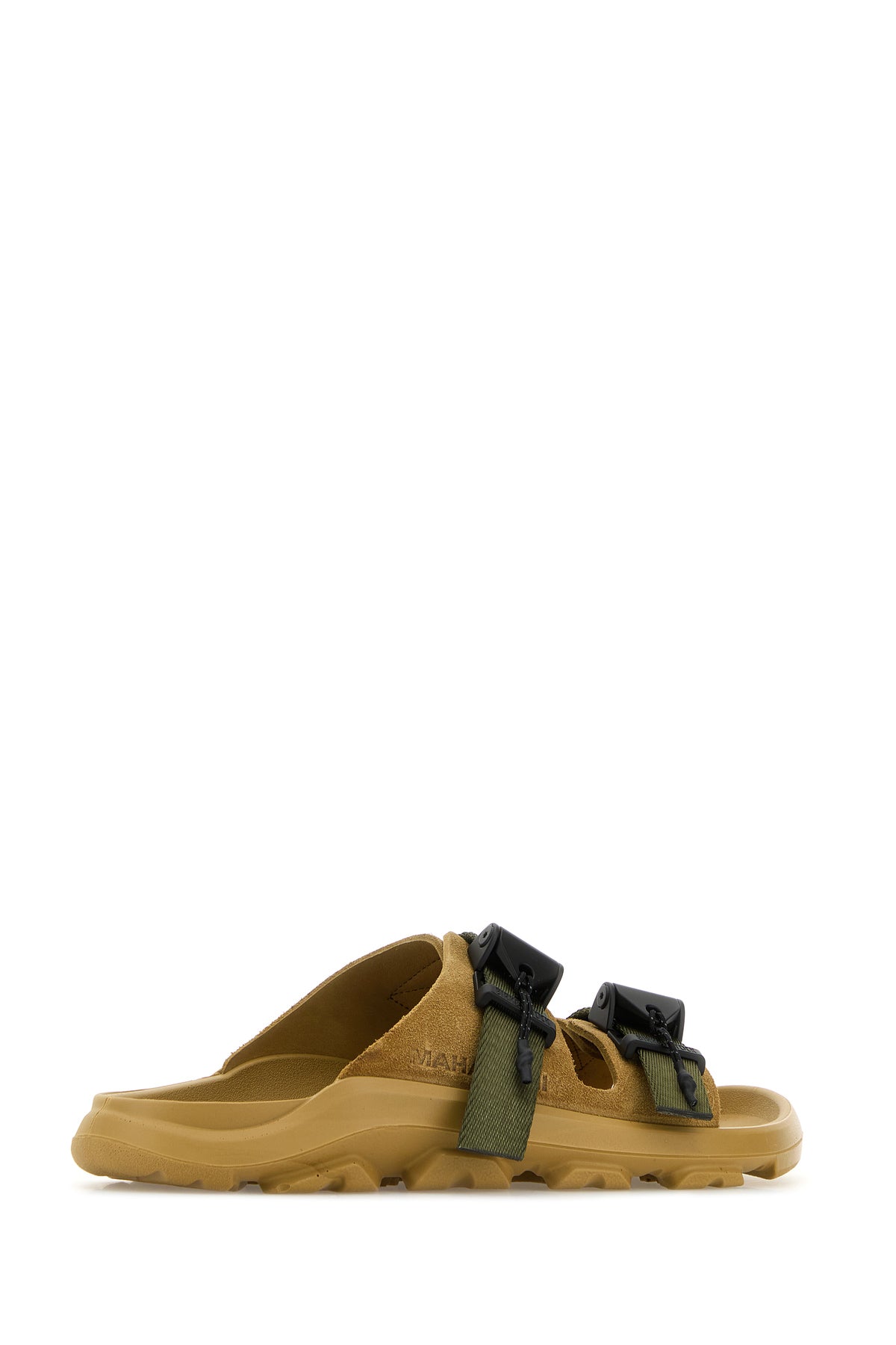 Slippers create in collaborazione con Maharishi realizzate in pelle scamosciata caratterizzate da logo impresso sui lati.