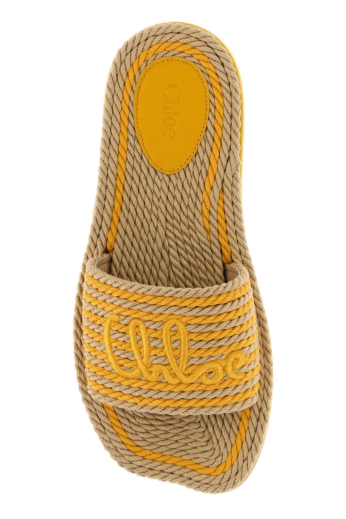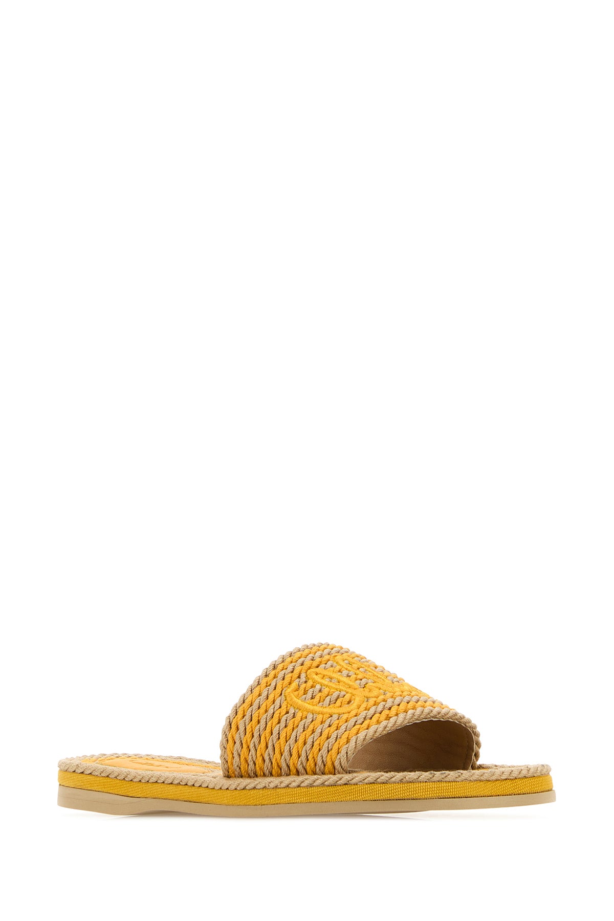 Slippers realizzate in rafia caratterizzate da ricamo a righe e logo ricamato sul collo del piede.