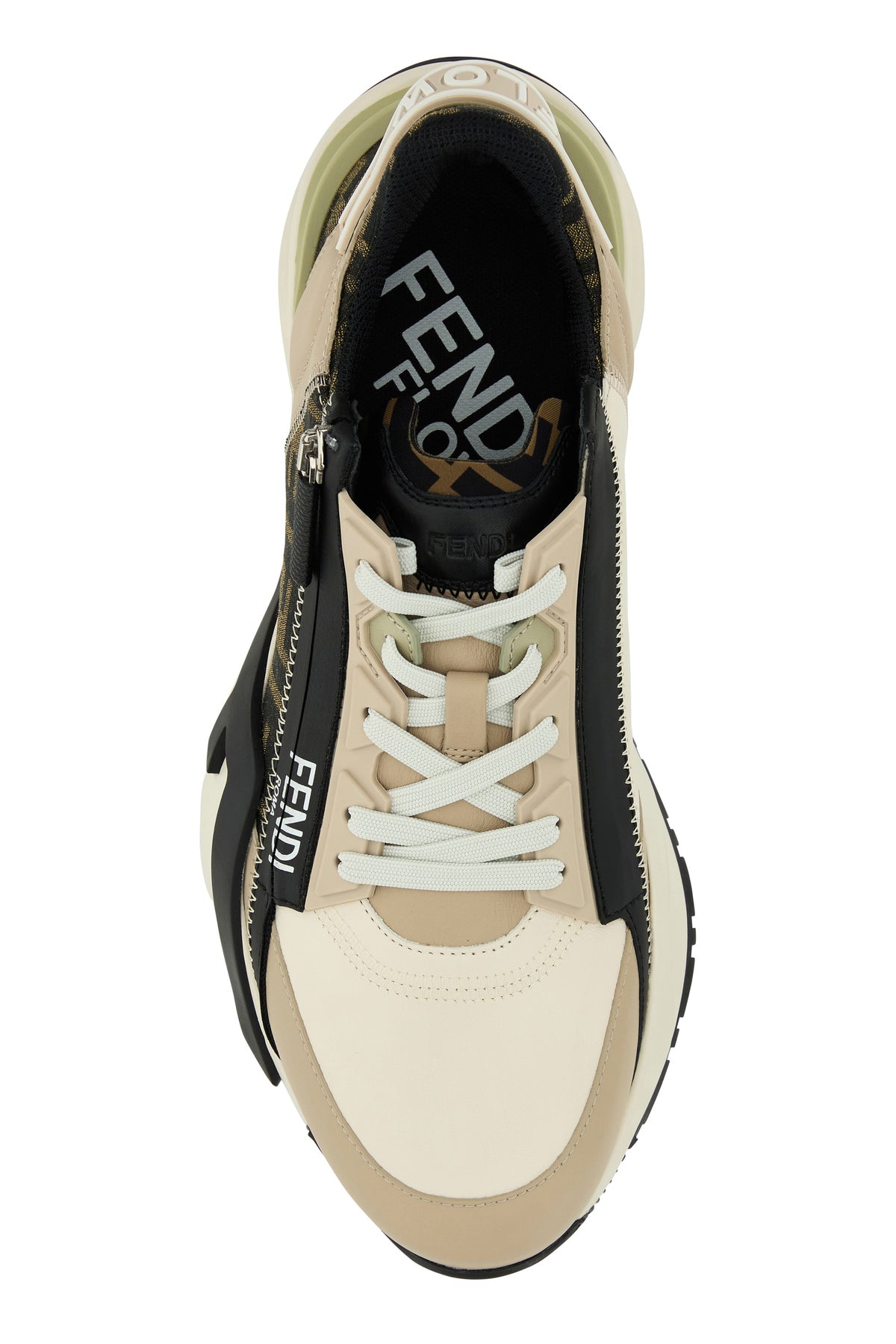 Sneakers realizzate in pelle di vitello liscia con inserti in jacquard ricamato a motivo FF caratterizzate da logo stampato sul lato e logo in rilievo sulla linguetta.