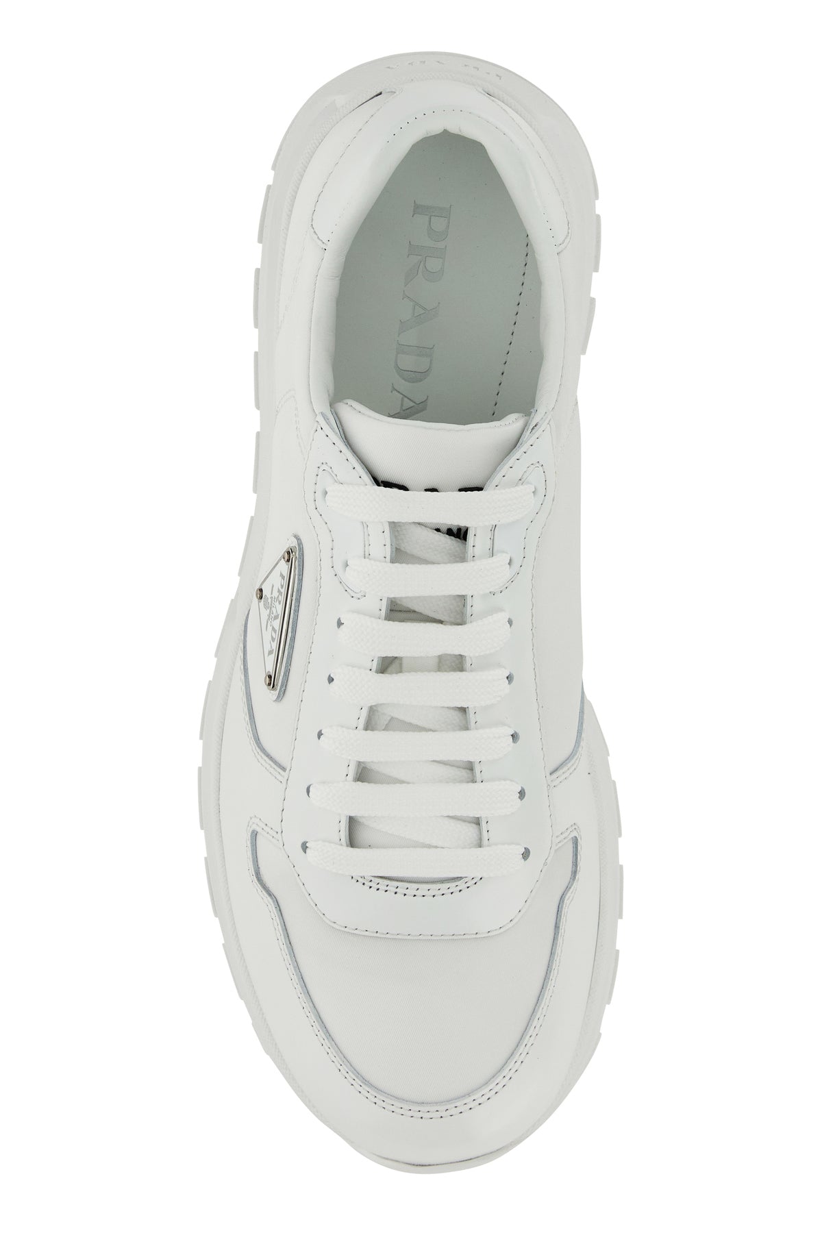 Sneakers realizzate in nylon e in pelle dal finish lucido caratterizzati da logo impresso sul retro arricchiti da iconico triangolo metallico logato sul lato.