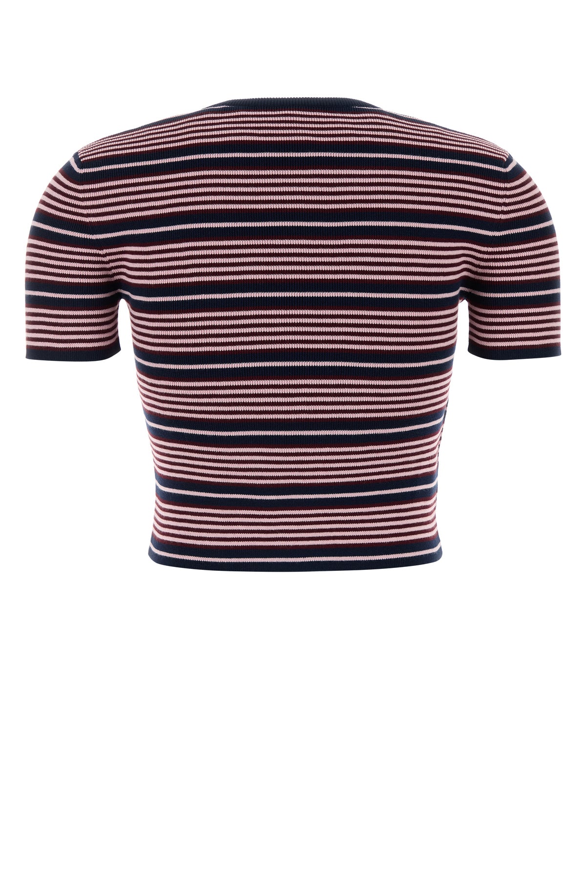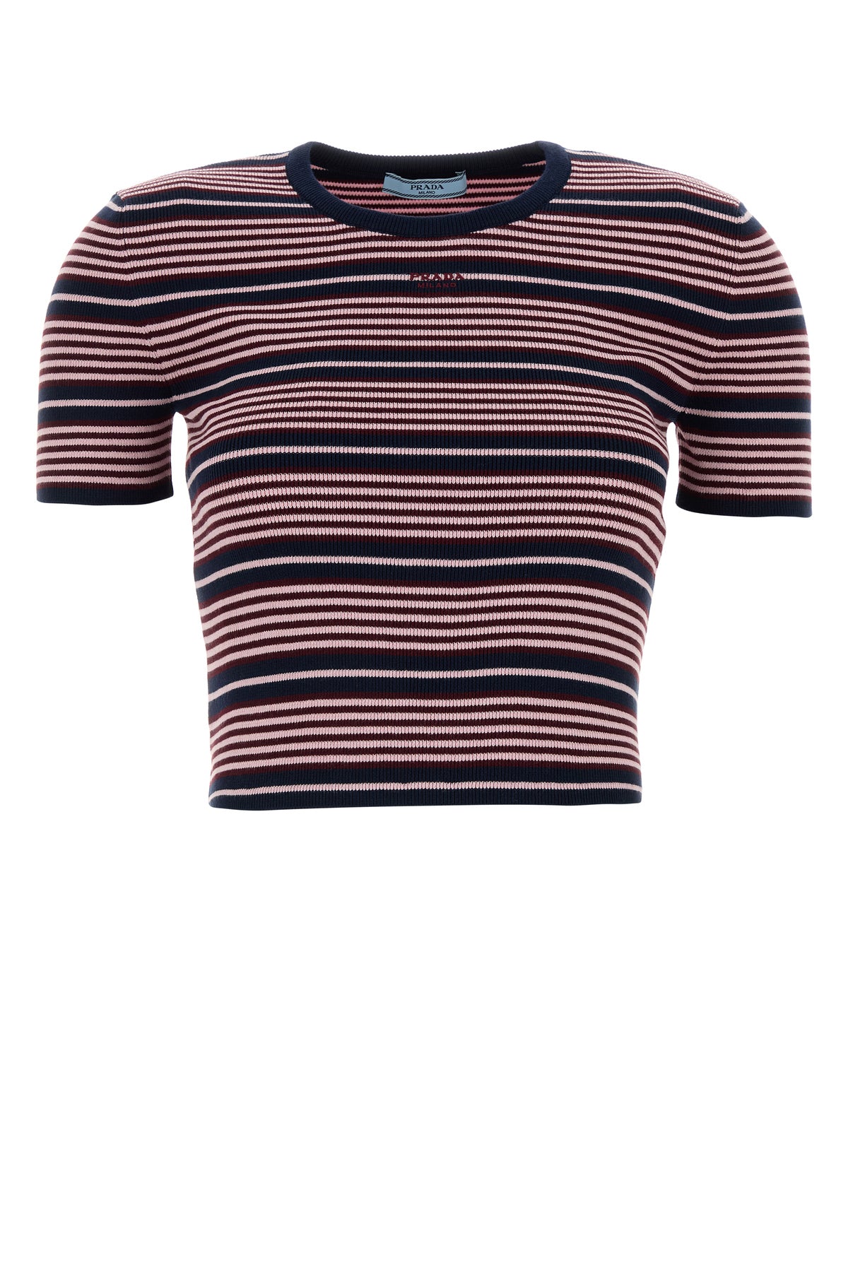 T-shirt dal taglio corto realizzata in misto cotone caratterizzata da ricamo a righe su tutta la superficie e logo ricamato sul petto.